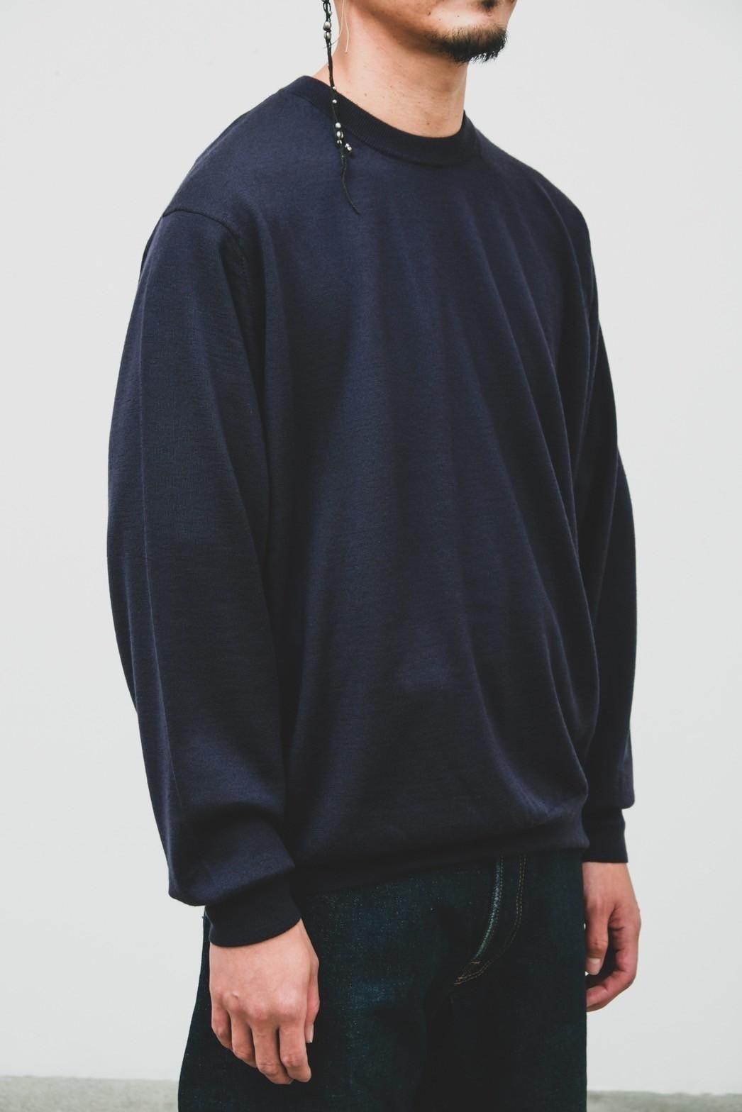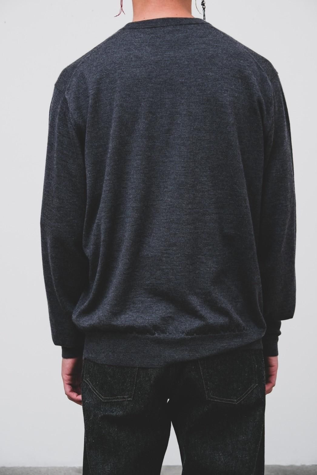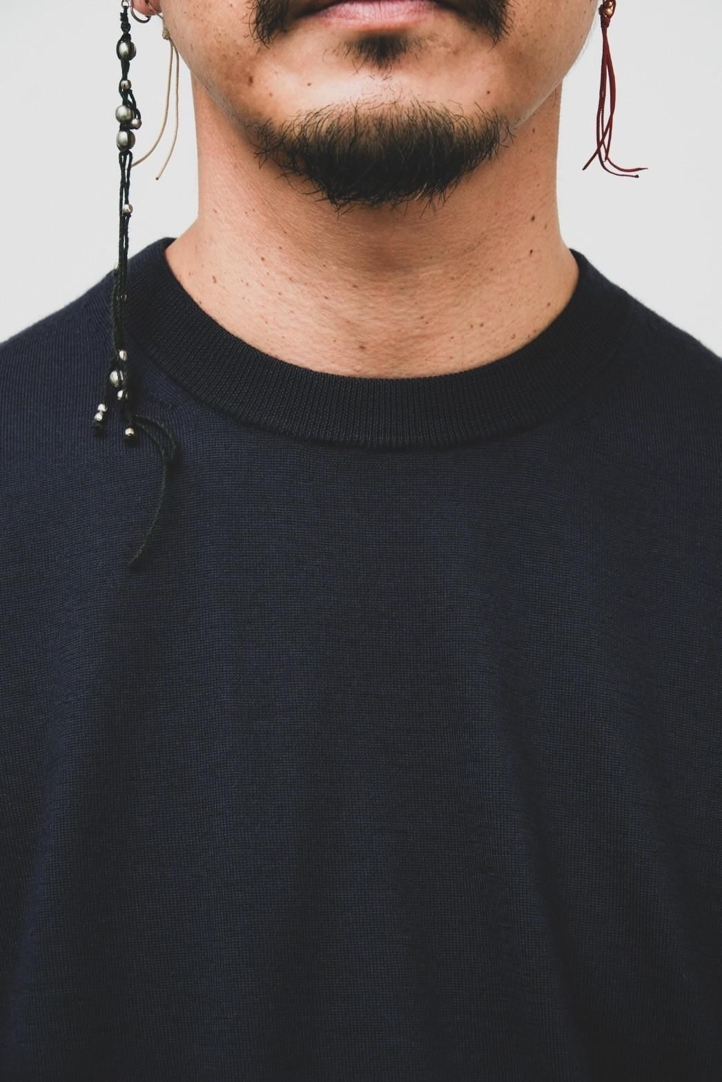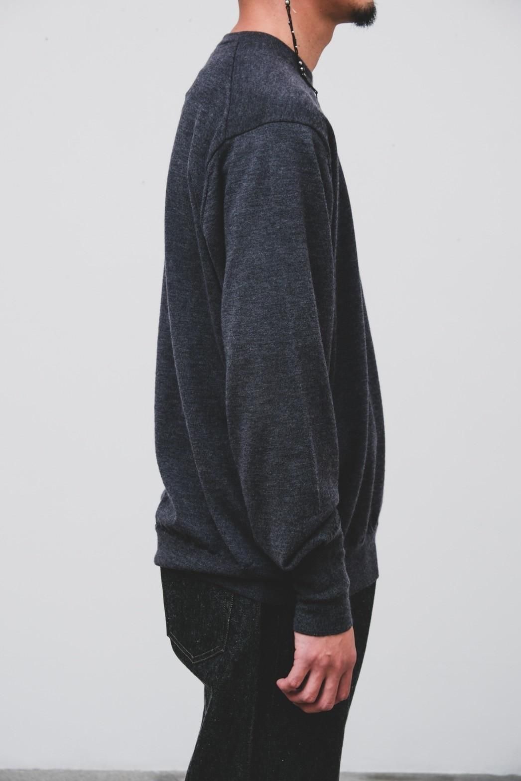 インナーとしての着用に重きを置いたシルエットバランスに設計したクルーネックニット。 中国内蒙古自治区西部の特定の地域で産出された最高級梳毛カシミヤを使用し18ゲージできめ細かく編み立てた。60番の細く柔らかで繊細なカシミヤ糸を三子撚りすることで、適度な肉感と強度を出した。