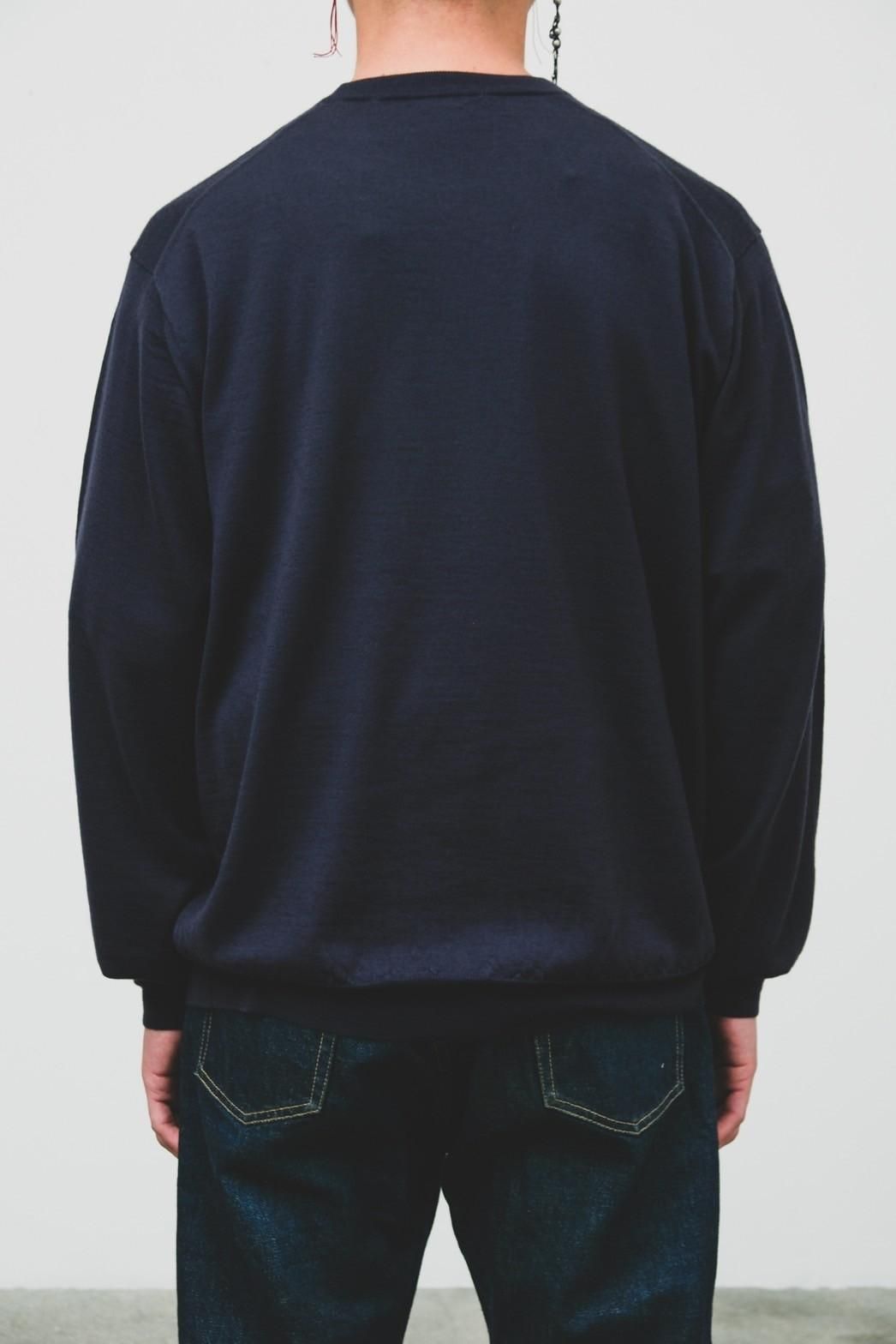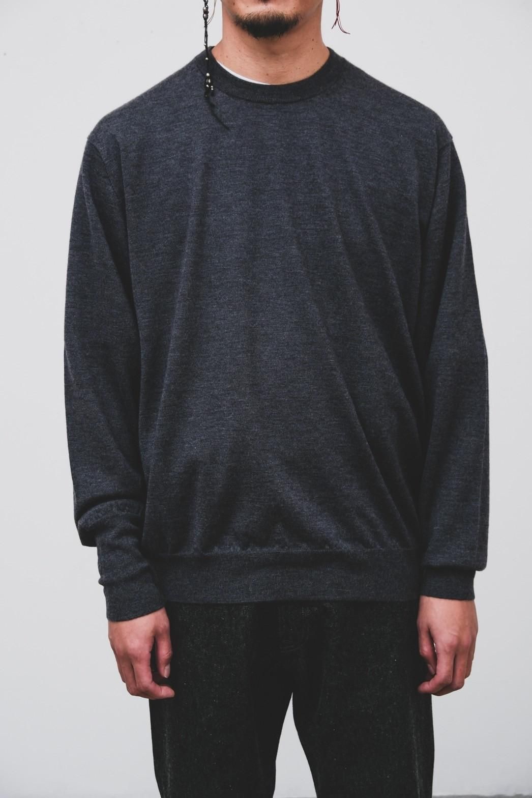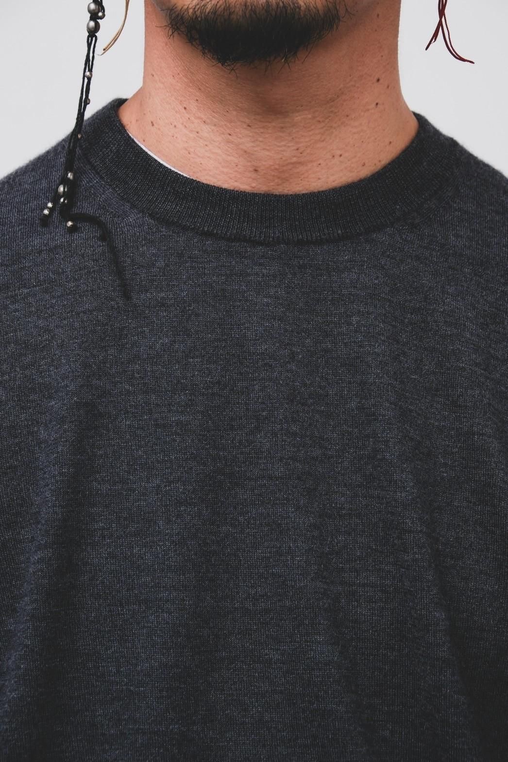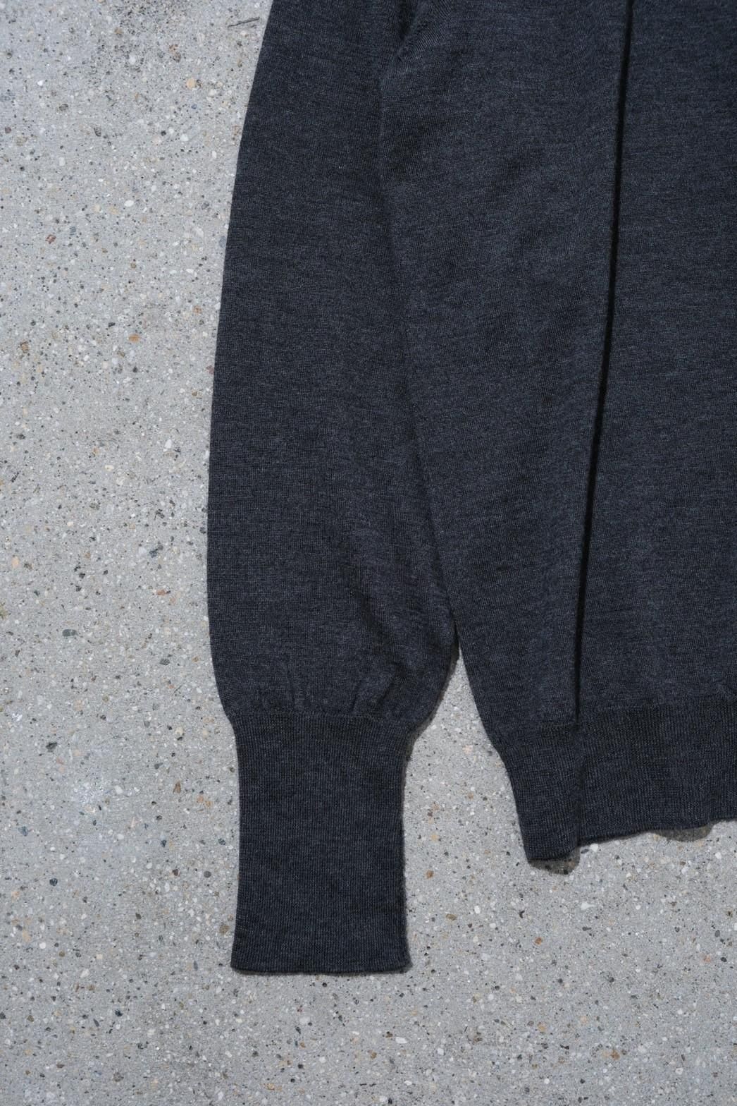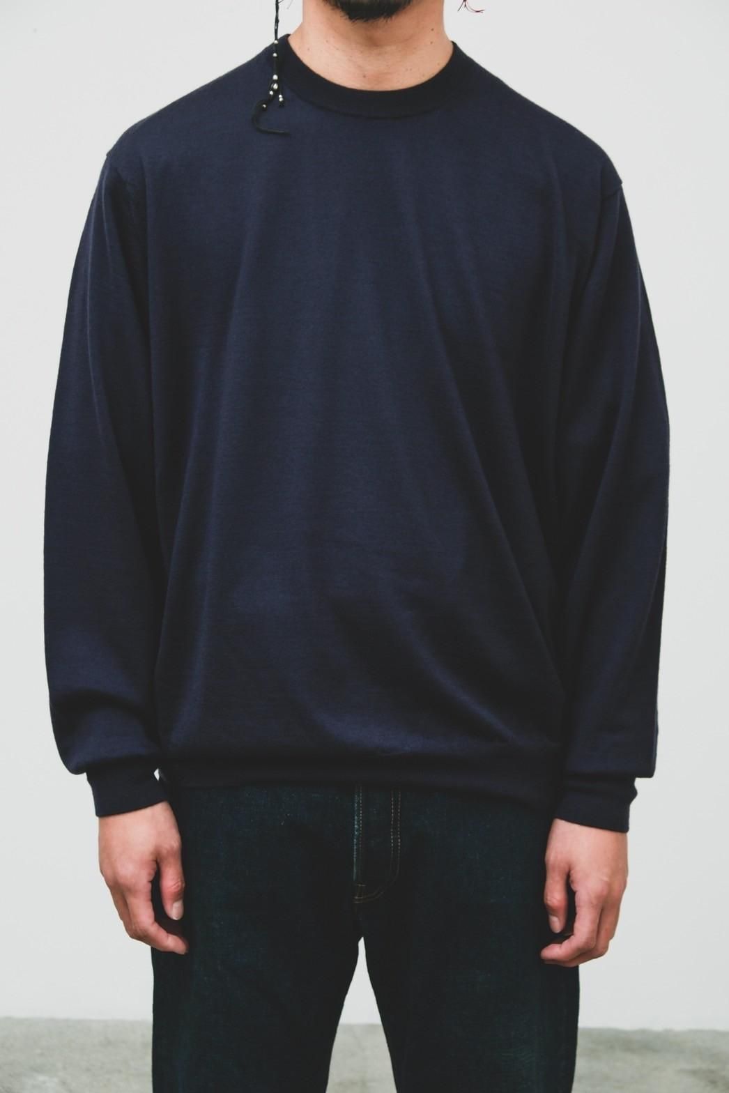 インナーとしての着用に重きを置いたシルエットバランスに設計したクルーネックニット。 中国内蒙古自治区西部の特定の地域で産出された最高級梳毛カシミヤを使用し18ゲージできめ細かく編み立てた。60番の細く柔らかで繊細なカシミヤ糸を三子撚りすることで、適度な肉感と強度を出した。