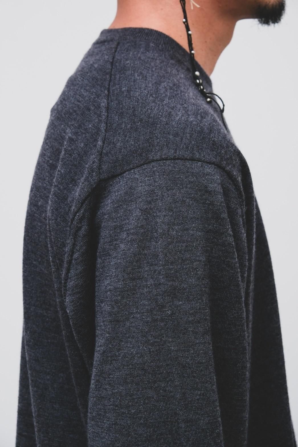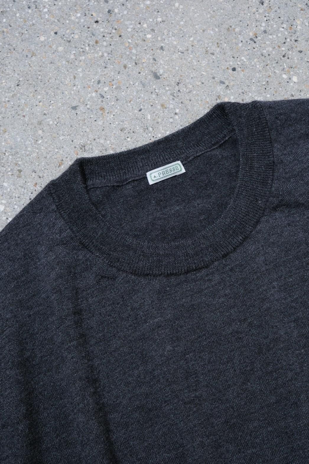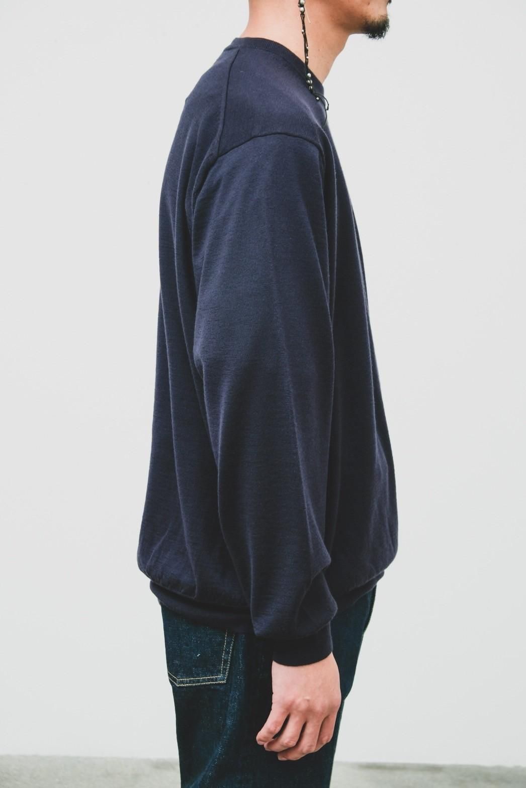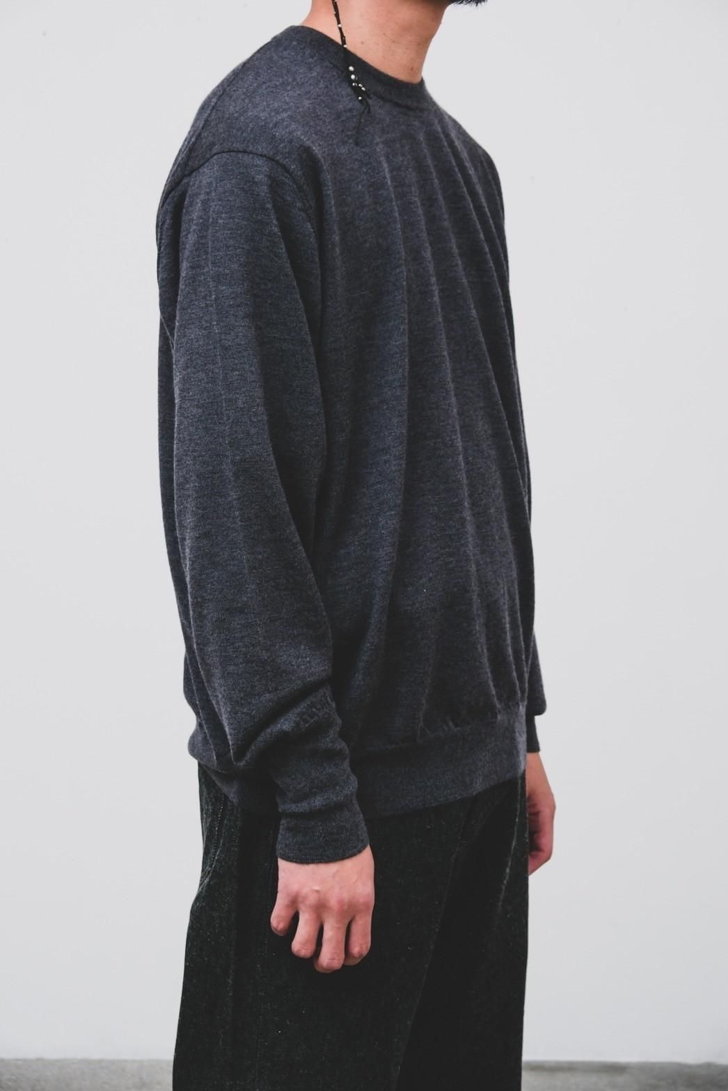 インナーとしての着用に重きを置いたシルエットバランスに設計したクルーネックニット。 中国内蒙古自治区西部の特定の地域で産出された最高級梳毛カシミヤを使用し18ゲージできめ細かく編み立てた。60番の細く柔らかで繊細なカシミヤ糸を三子撚りすることで、適度な肉感と強度を出した。