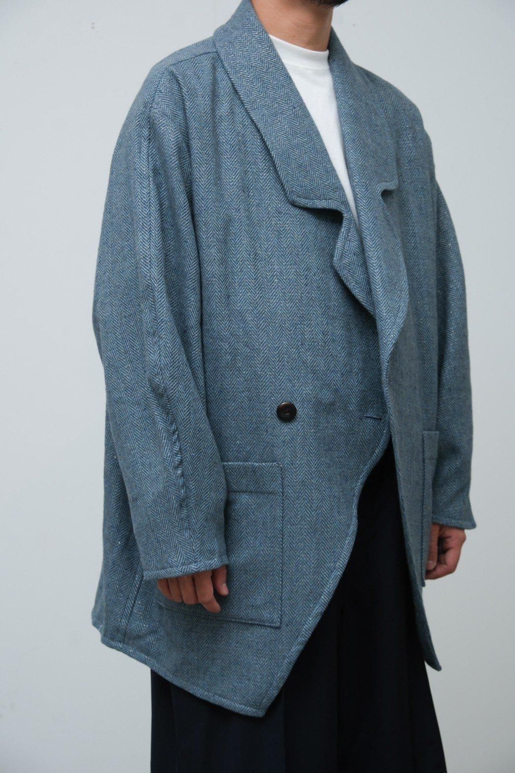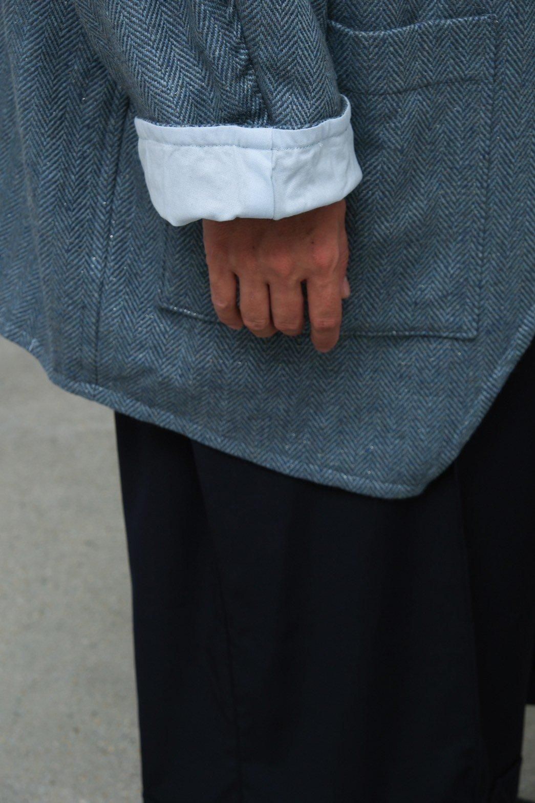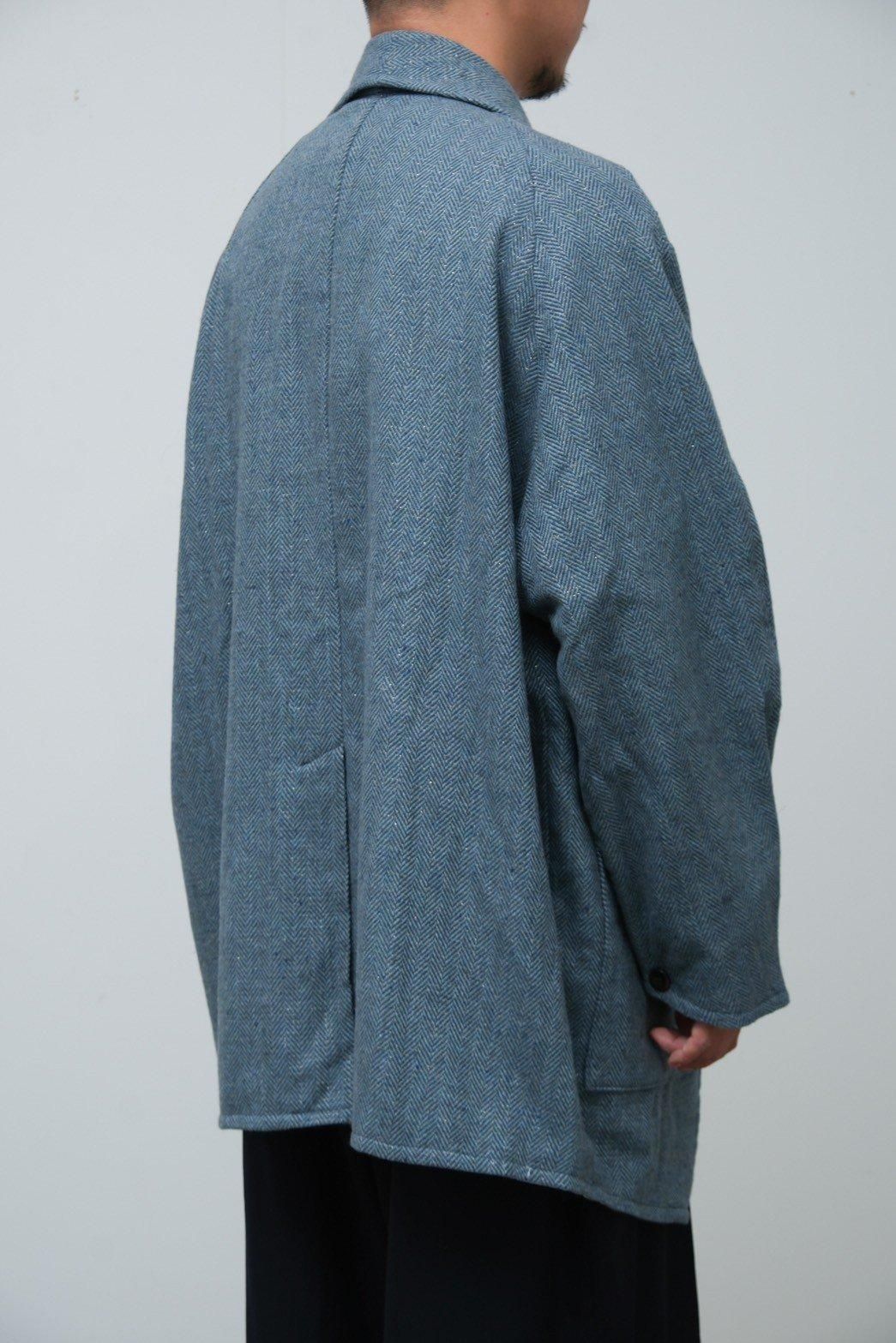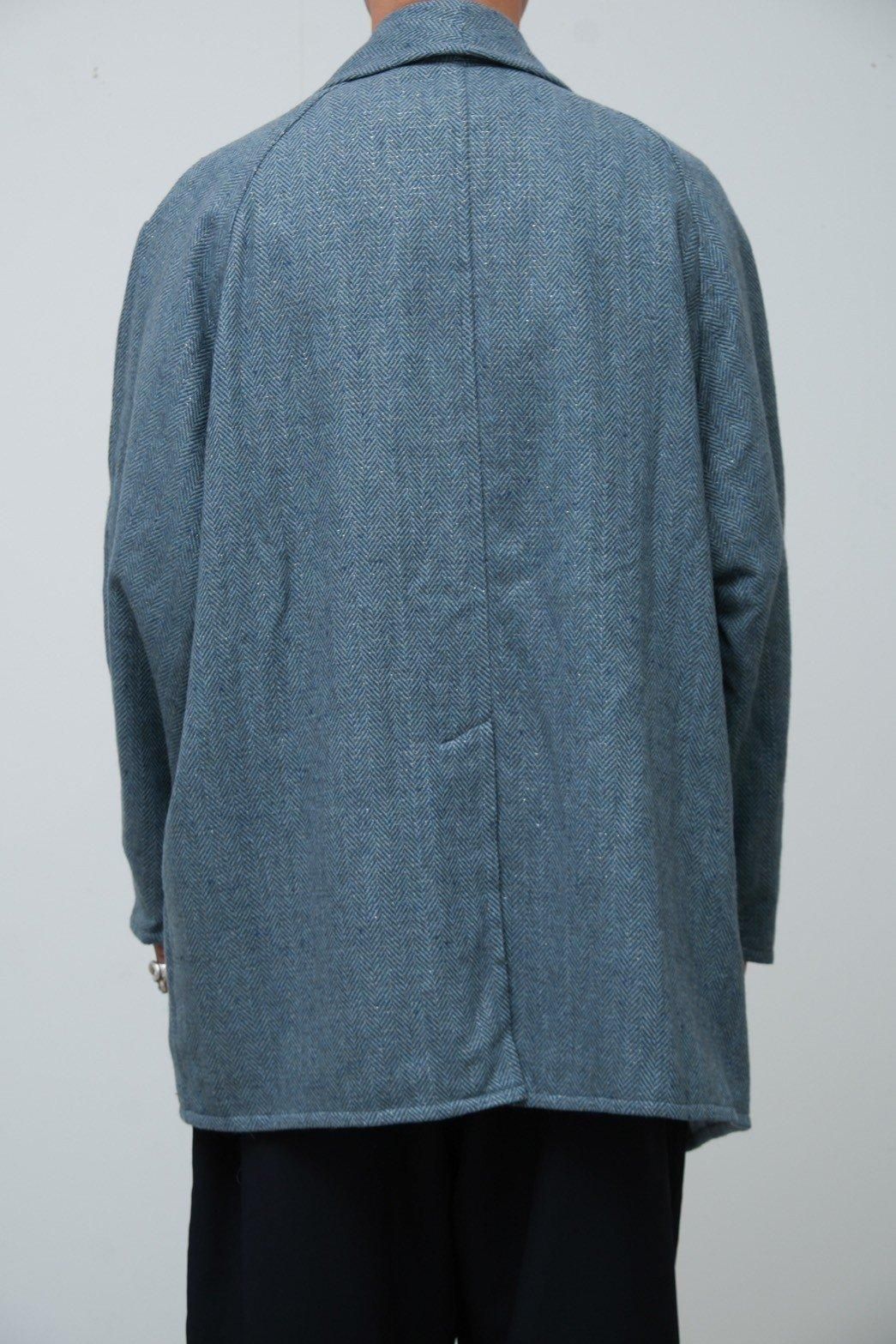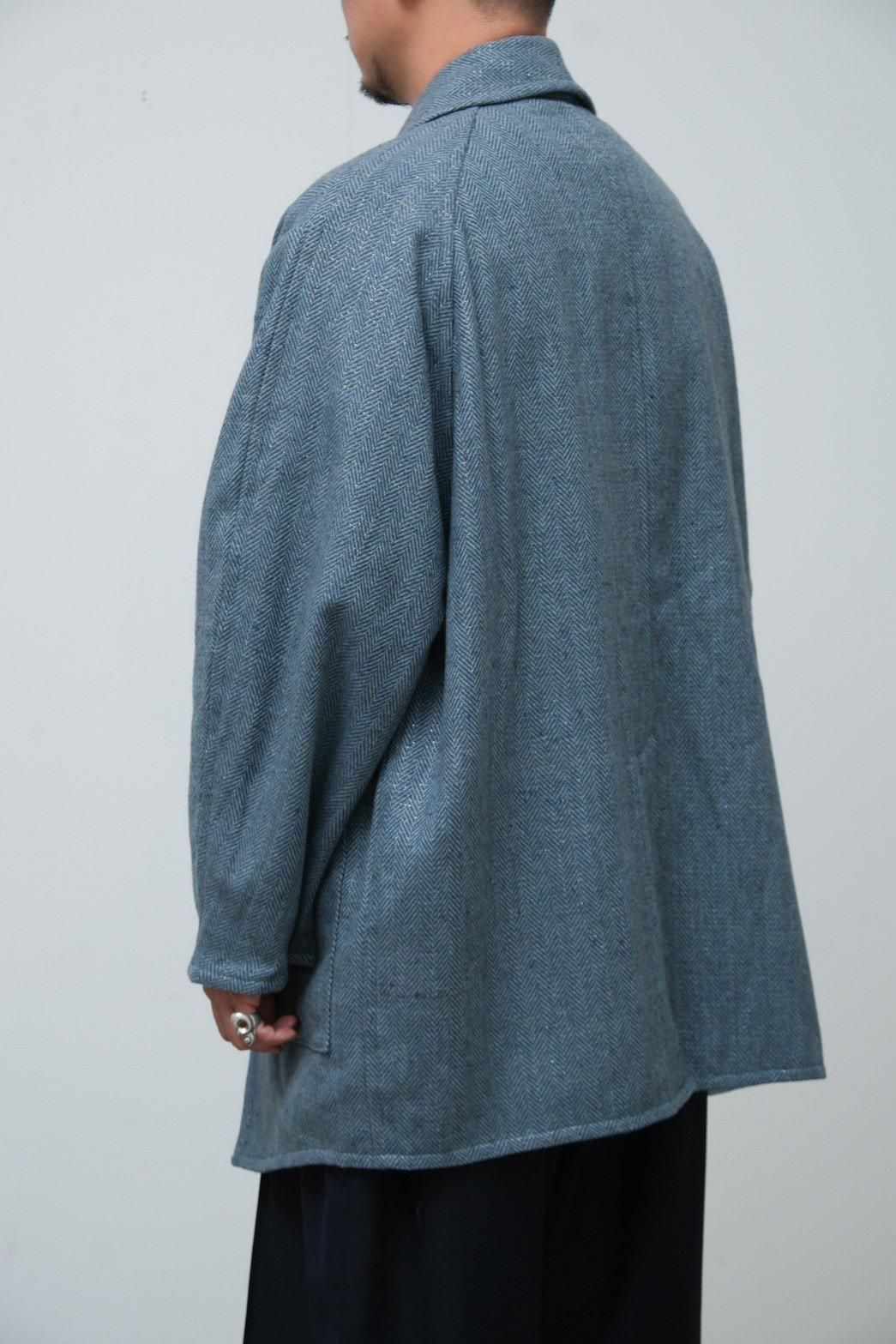大ぶりのラペルから裾にかけて 、×(バッテン)のようなカッティングが特徴的なジャケット。袖は前面がセットイン、背面がラグランのスプリットラグラン仕様のため動きやすく、なおかつスタイリッシュな印象に。サックスとレッドの2色展開で、サックスは金糸が混ざった旧いヘリンボーン生地を使用しています。