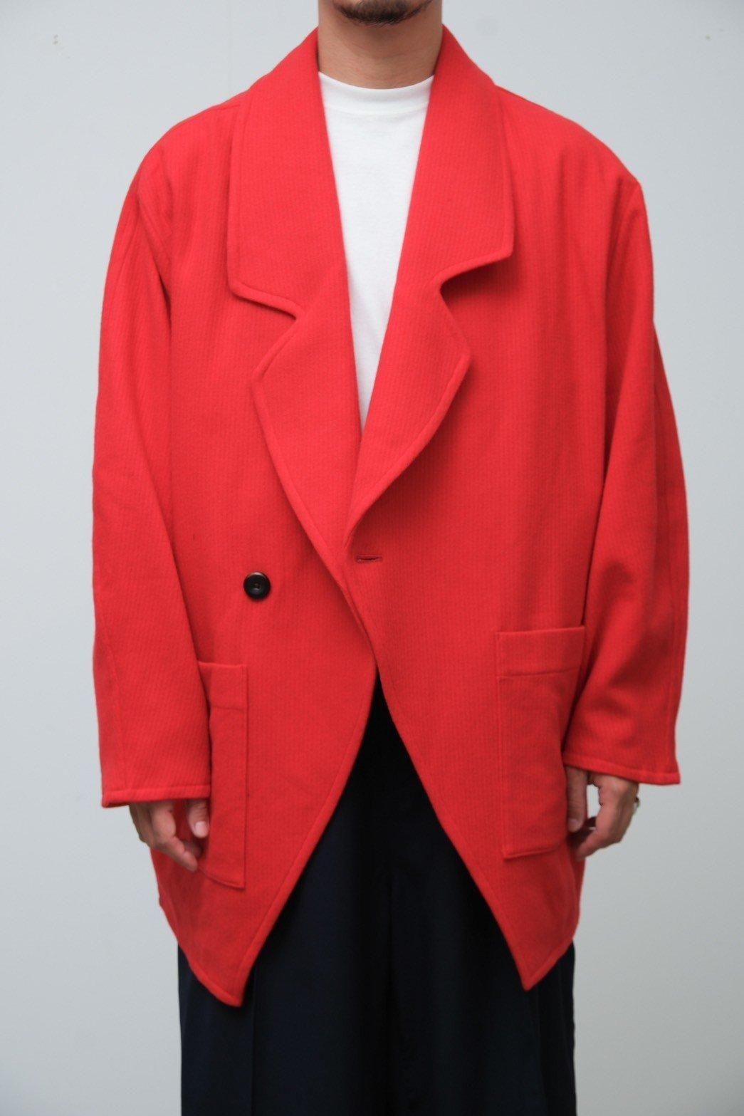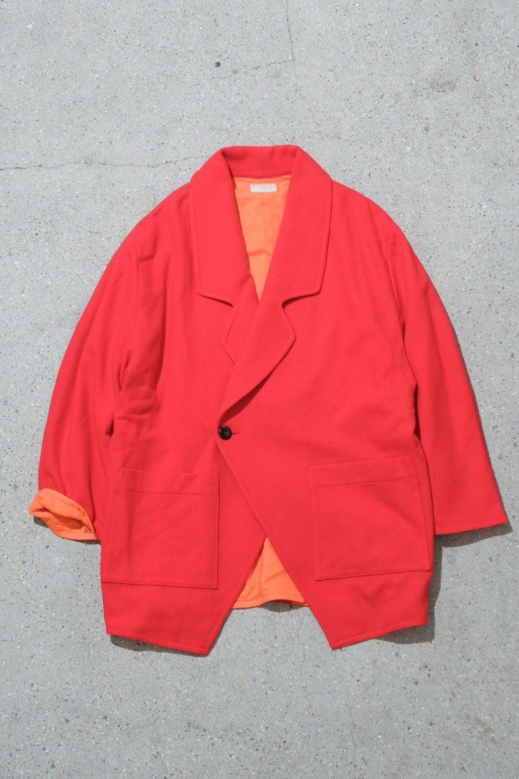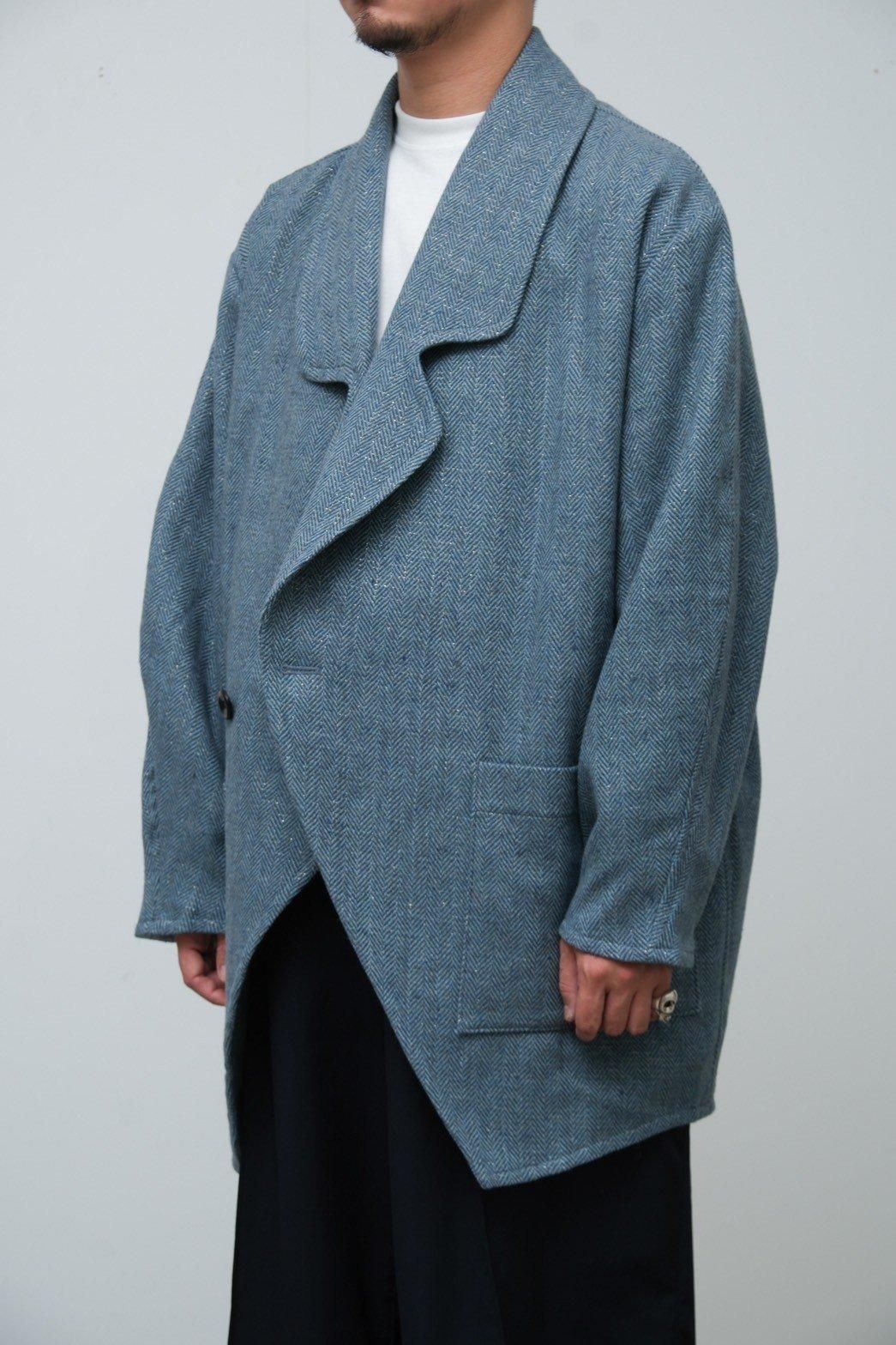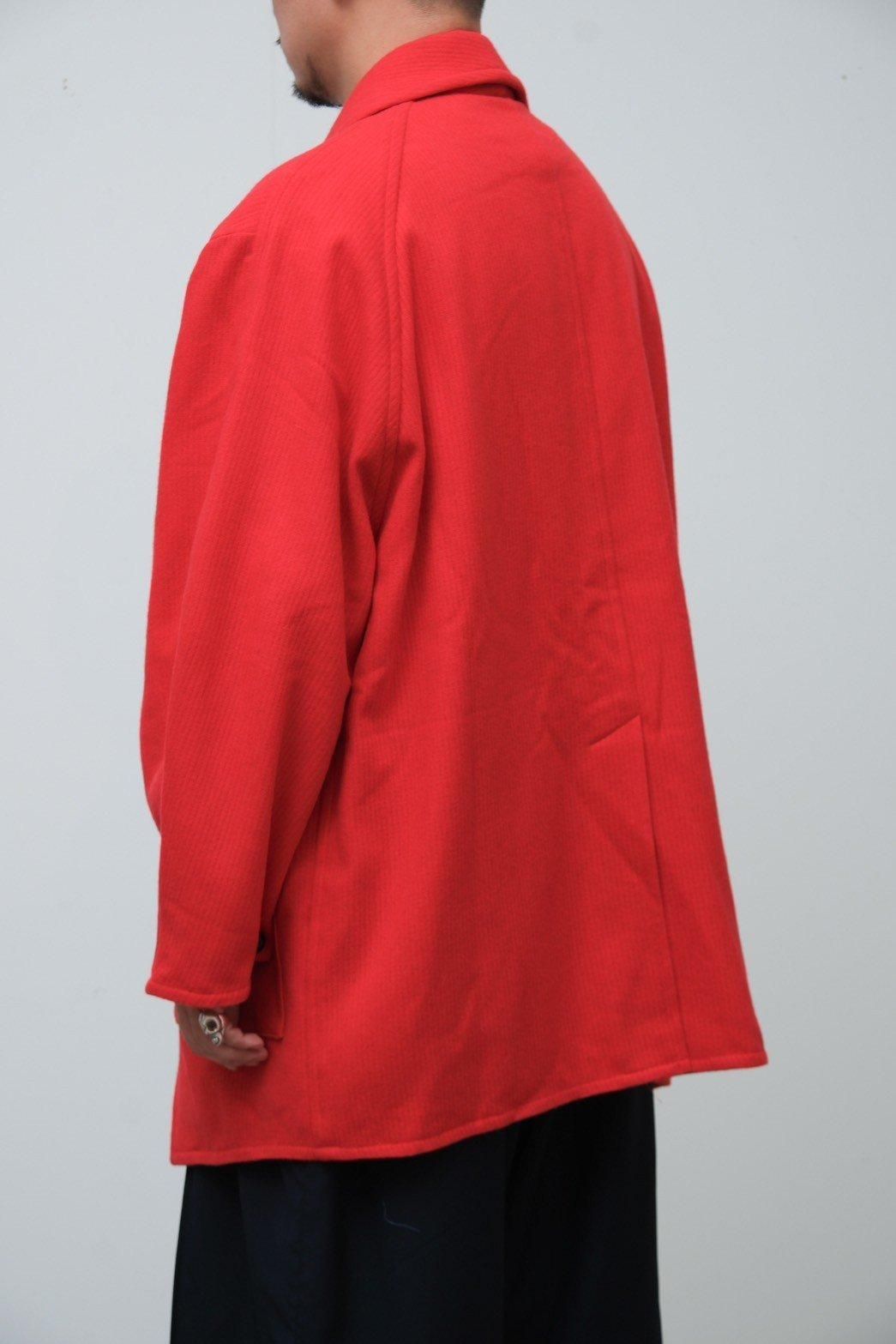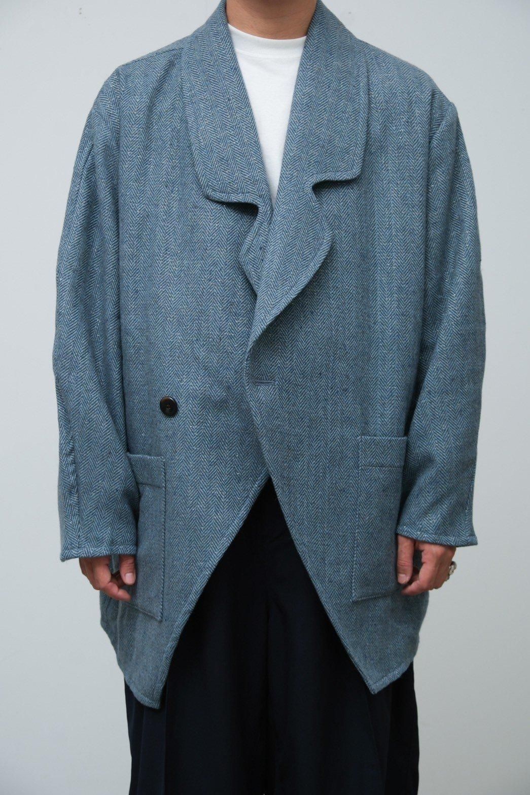大ぶりのラペルから裾にかけて 、×(バッテン)のようなカッティングが特徴的なジャケット。袖は前面がセットイン、背面がラグランのスプリットラグラン仕様のため動きやすく、なおかつスタイリッシュな印象に。サックスとレッドの2色展開で、サックスは金糸が混ざった旧いヘリンボーン生地を使用しています。