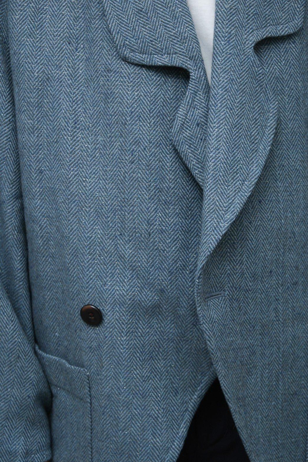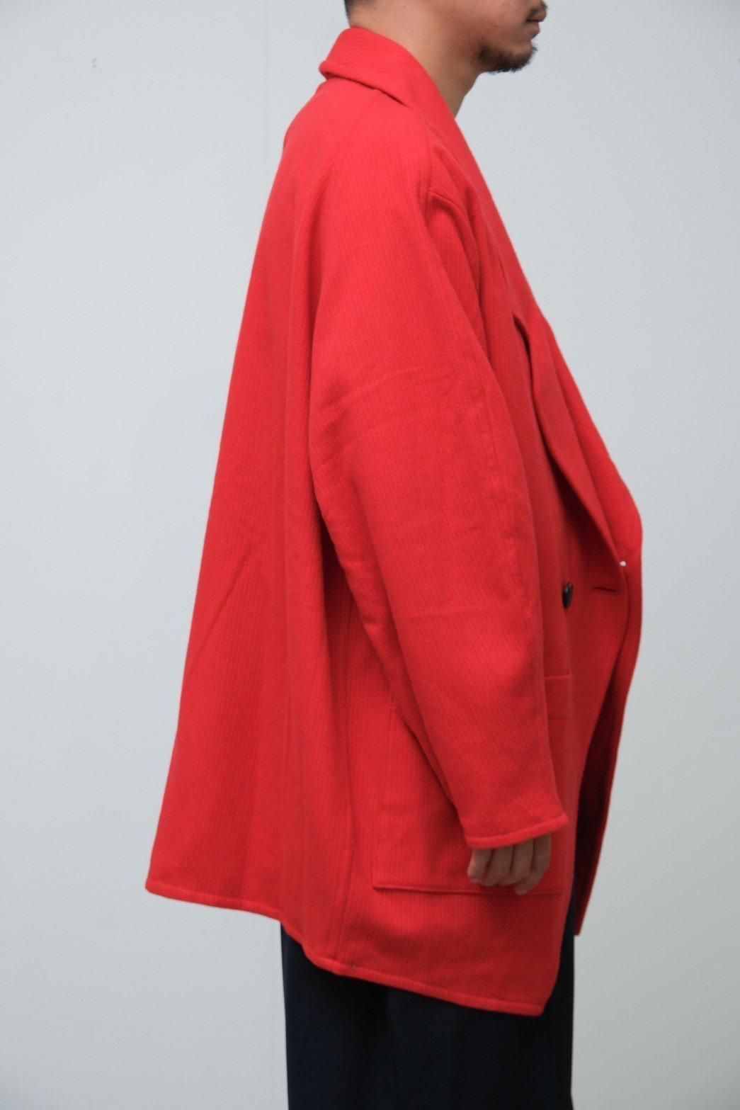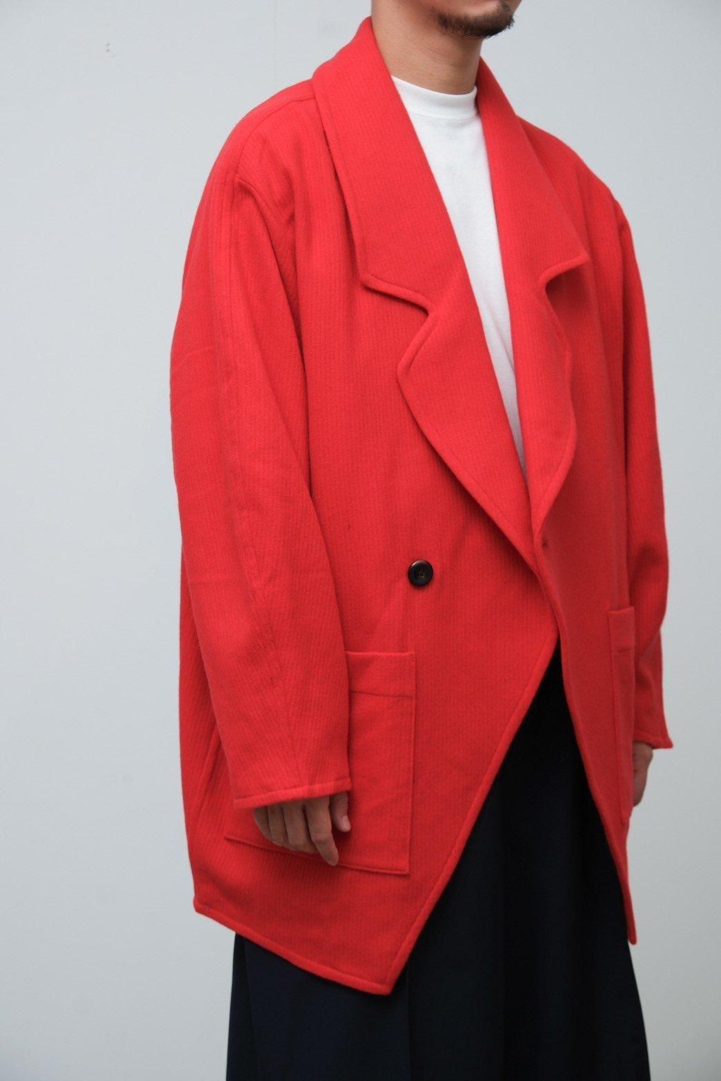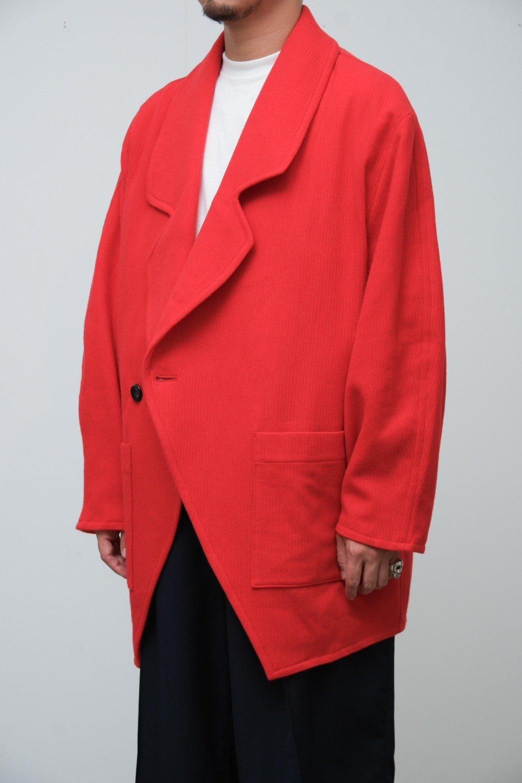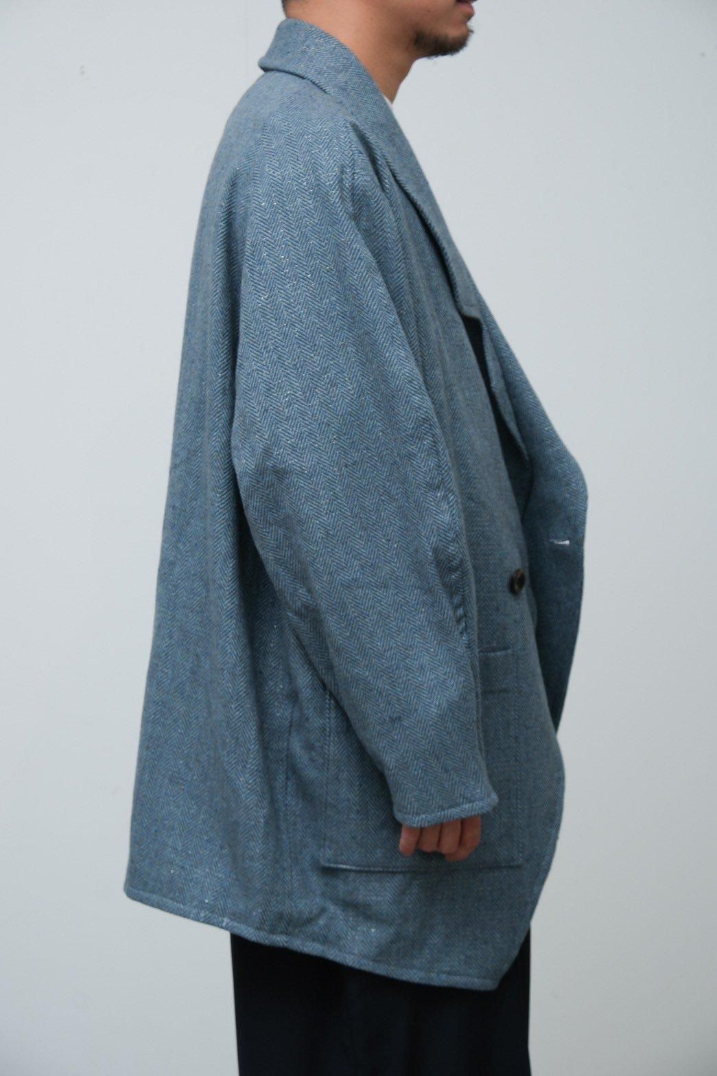 大ぶりのラペルから裾にかけて 、×(バッテン)のようなカッティングが特徴的なジャケット。袖は前面がセットイン、背面がラグランのスプリットラグラン仕様のため動きやすく、なおかつスタイリッシュな印象に。サックスとレッドの2色展開で、サックスは金糸が混ざった旧いヘリンボーン生地を使用しています。