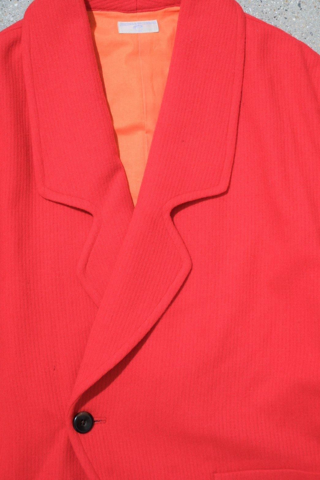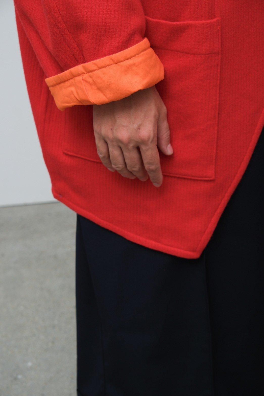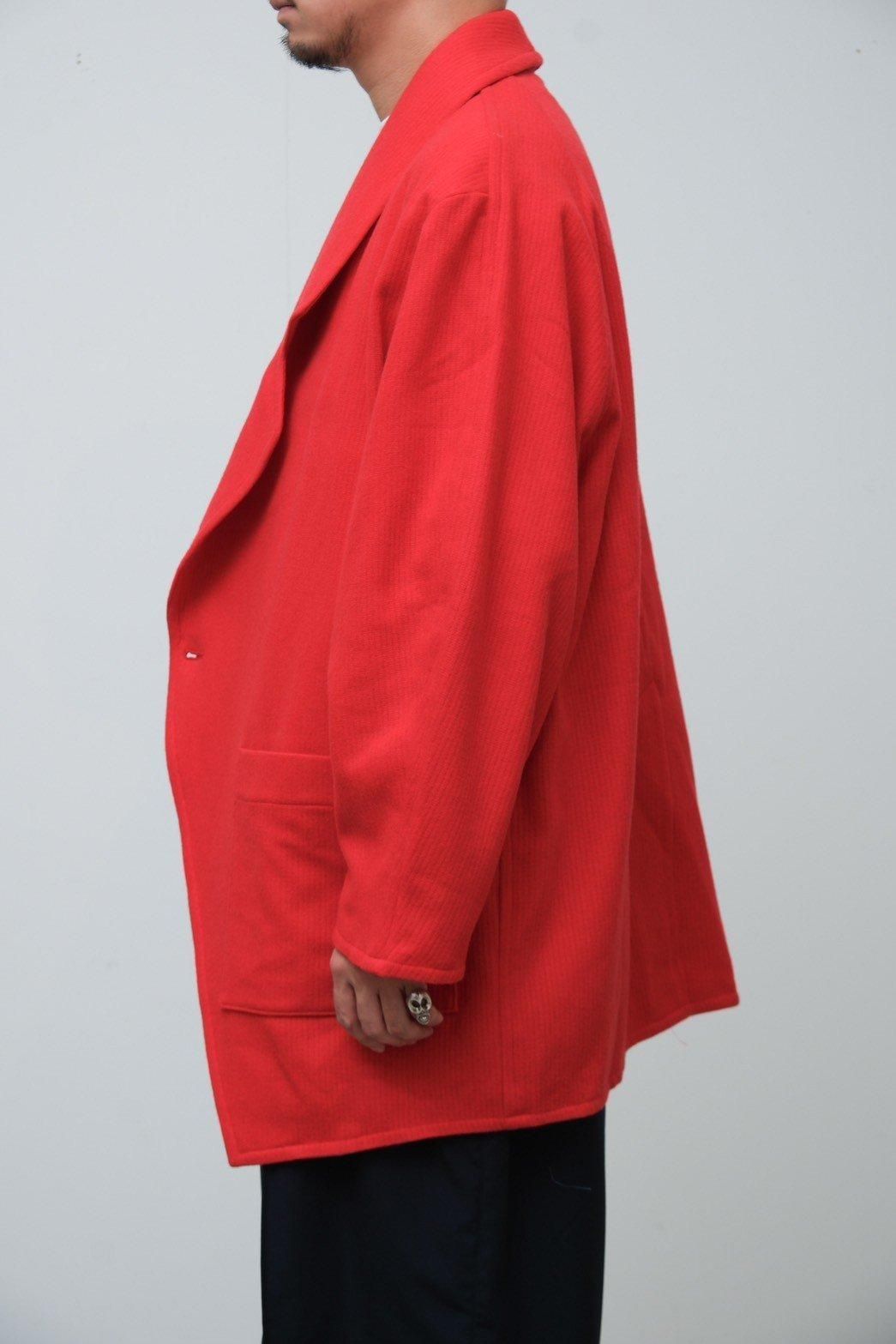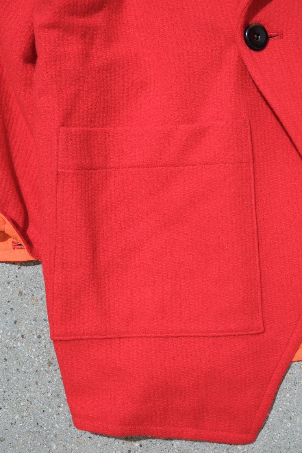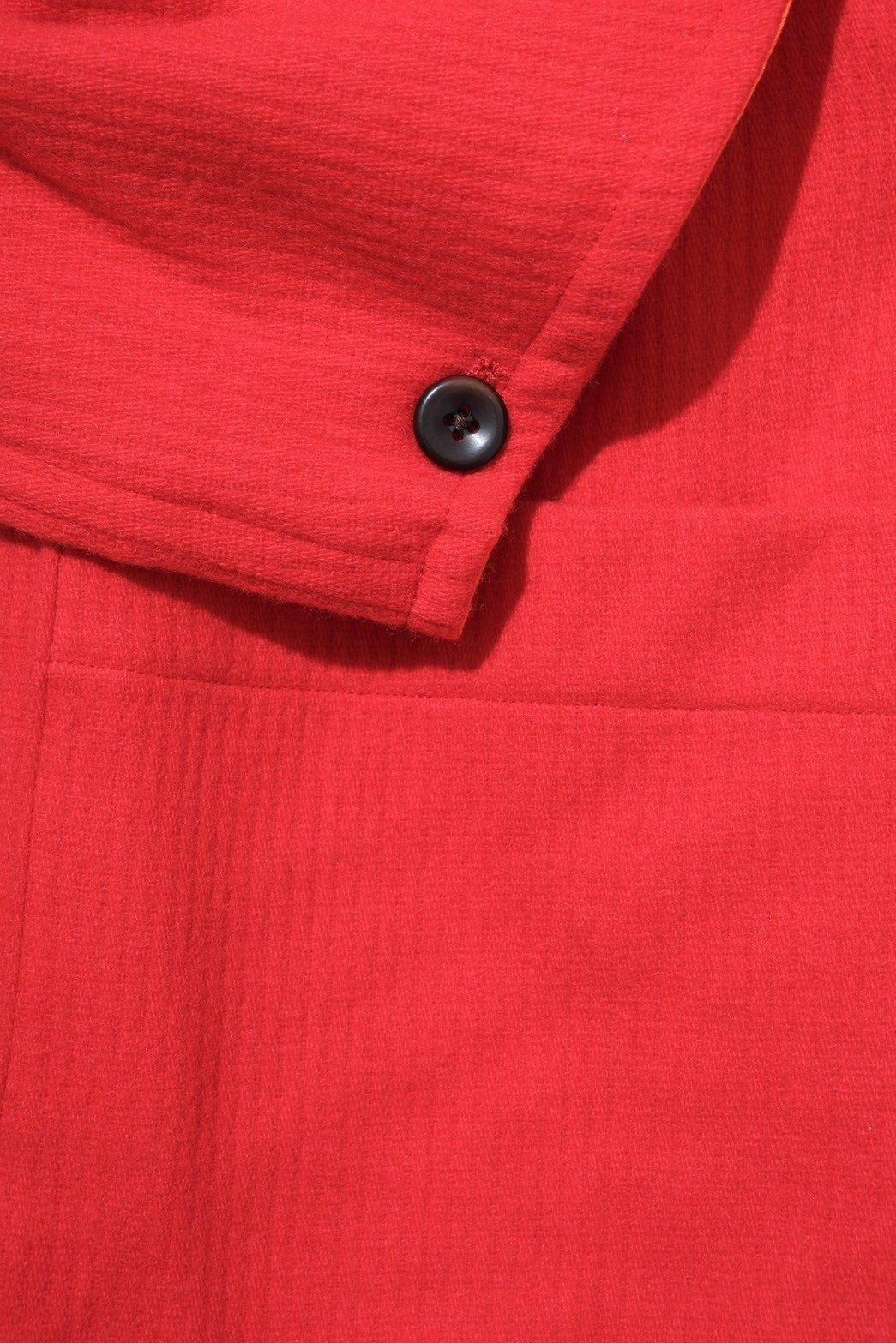 大ぶりのラペルから裾にかけて 、×(バッテン)のようなカッティングが特徴的なジャケット。袖は前面がセットイン、背面がラグランのスプリットラグラン仕様のため動きやすく、なおかつスタイリッシュな印象に。サックスとレッドの2色展開で、サックスは金糸が混ざった旧いヘリンボーン生地を使用しています。