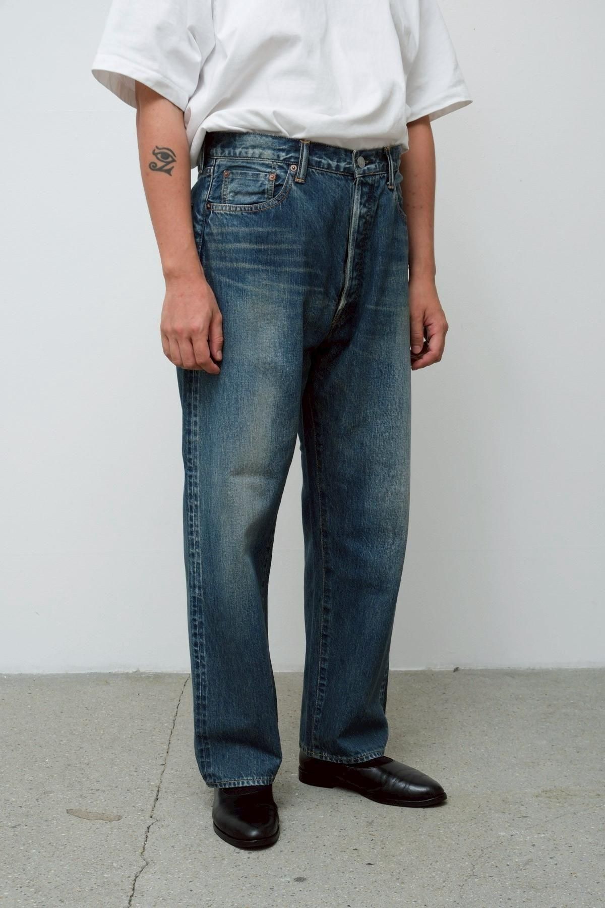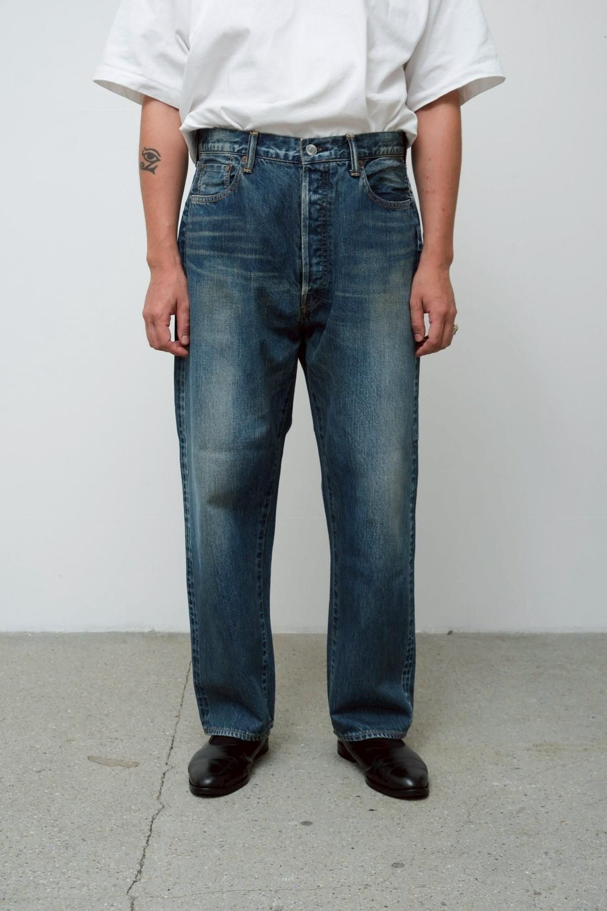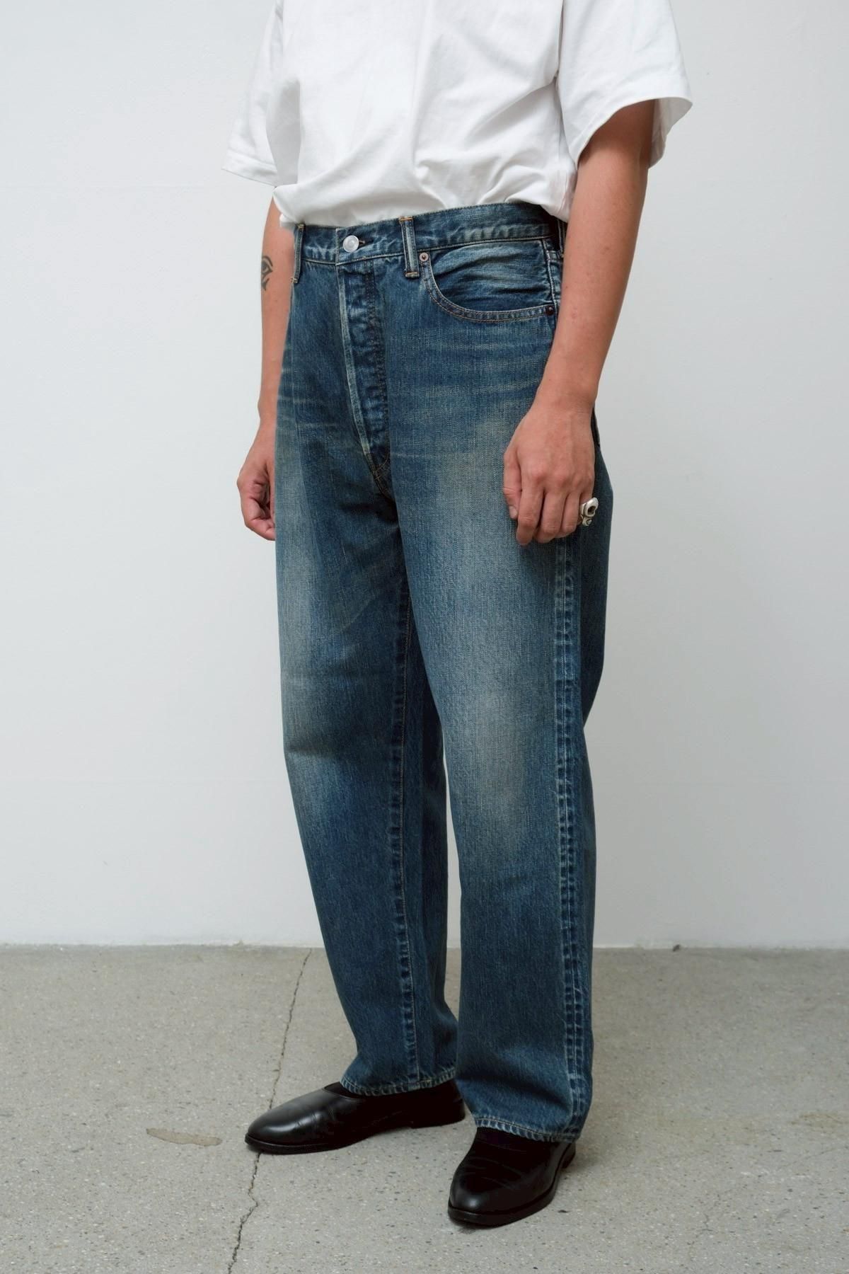 50's後半頃の501XXをベースにしシルエットは大きく変えず 、股上を僅かに深くして、尻ぐりのくい込みを軽減させることで、バックスタイルを調整。ビッグインチのデニムで稀に見られる、バックポケットが脇側に離れているバランスを活かし、完成されたデザインの中に遊びを入れている。オリジナルのタック釦を使用。生地は50's後半から60's前半頃の501XXの糸使いを再現してしっかりと打ち込んだ、13ozの赤耳付きセルヴィッジインディゴデニムを使用。縦落ちの表情がとても良く、ほどよく濃さが残った、グッドコンディションのヴィンテージを忠実に再現している。オリジナルのタック釦を採用。