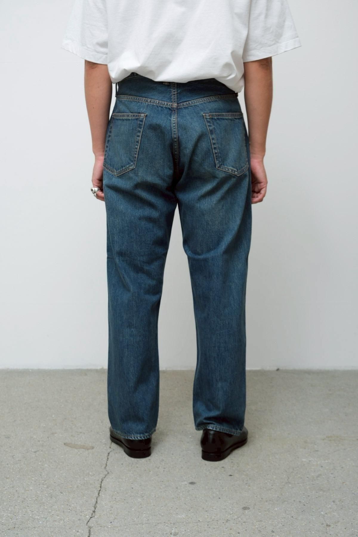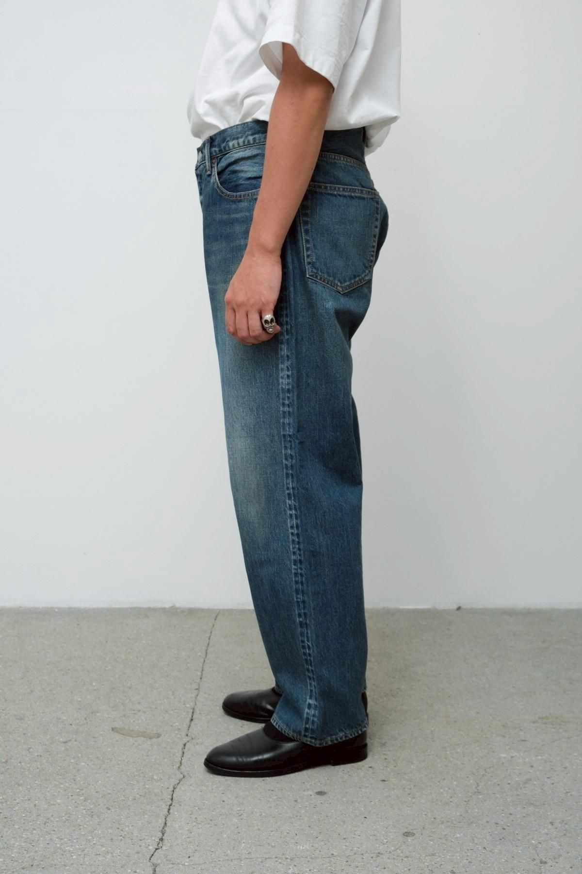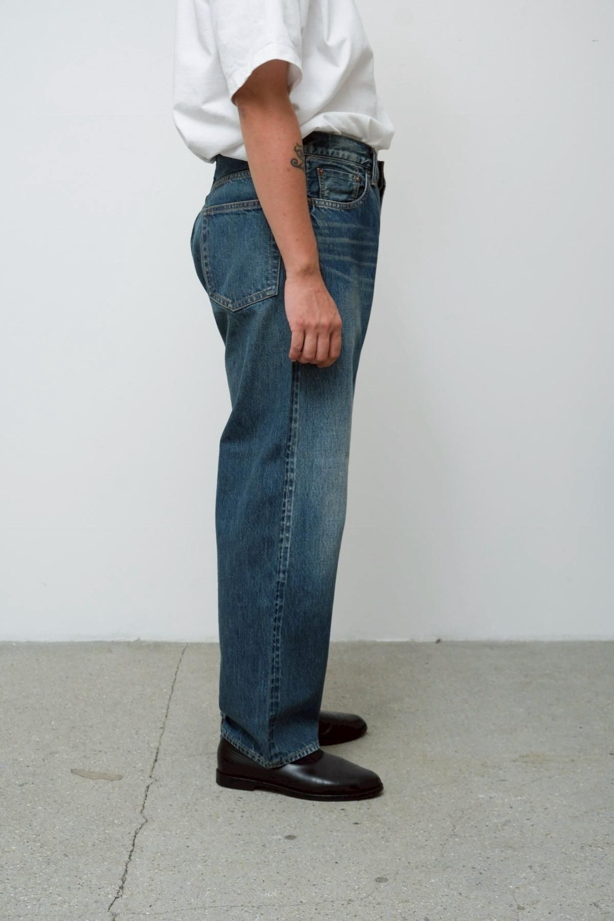 50's後半頃の501XXをベースにしシルエットは大きく変えず 、股上を僅かに深くして、尻ぐりのくい込みを軽減させることで、バックスタイルを調整。ビッグインチのデニムで稀に見られる、バックポケットが脇側に離れているバランスを活かし、完成されたデザインの中に遊びを入れている。オリジナルのタック釦を使用。生地は50's後半から60's前半頃の501XXの糸使いを再現してしっかりと打ち込んだ、13ozの赤耳付きセルヴィッジインディゴデニムを使用。縦落ちの表情がとても良く、ほどよく濃さが残った、グッドコンディションのヴィンテージを忠実に再現している。オリジナルのタック釦を採用。