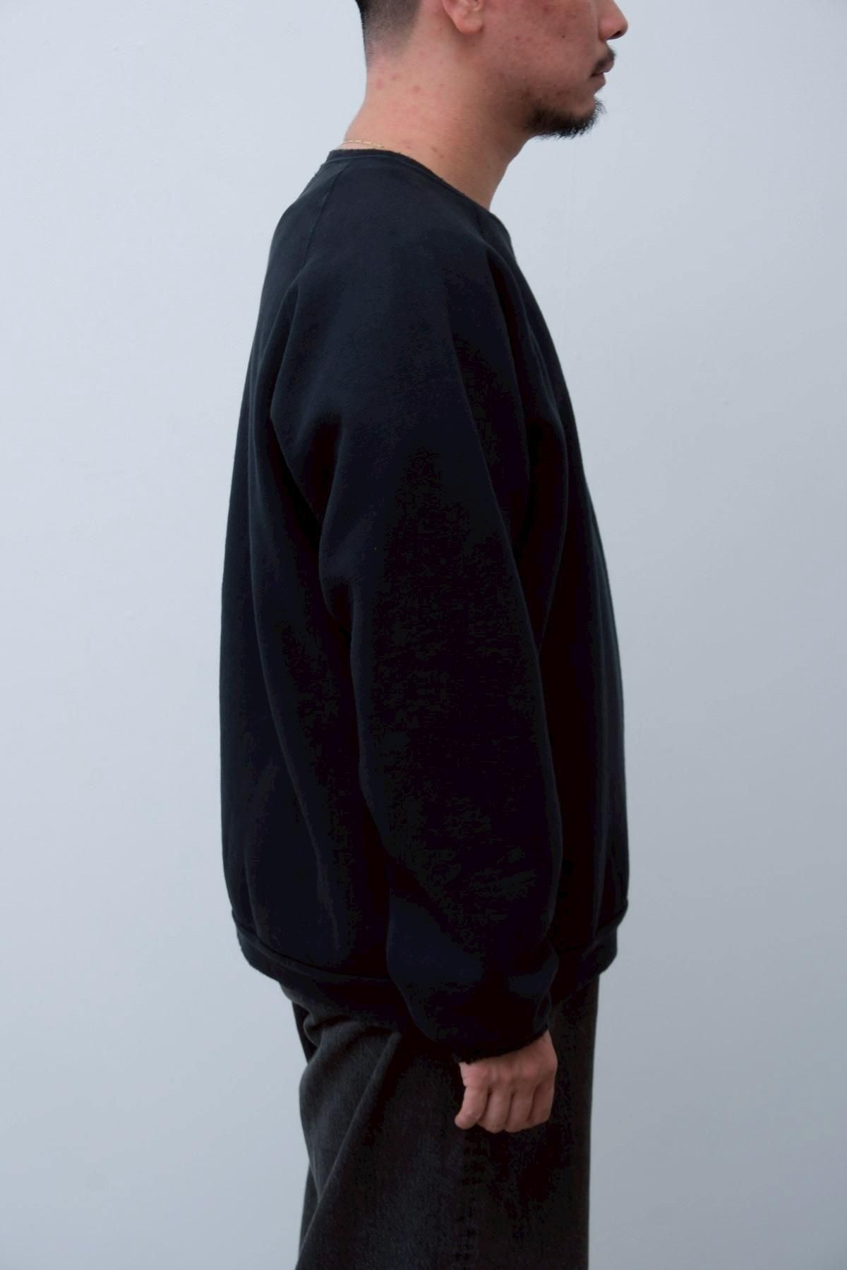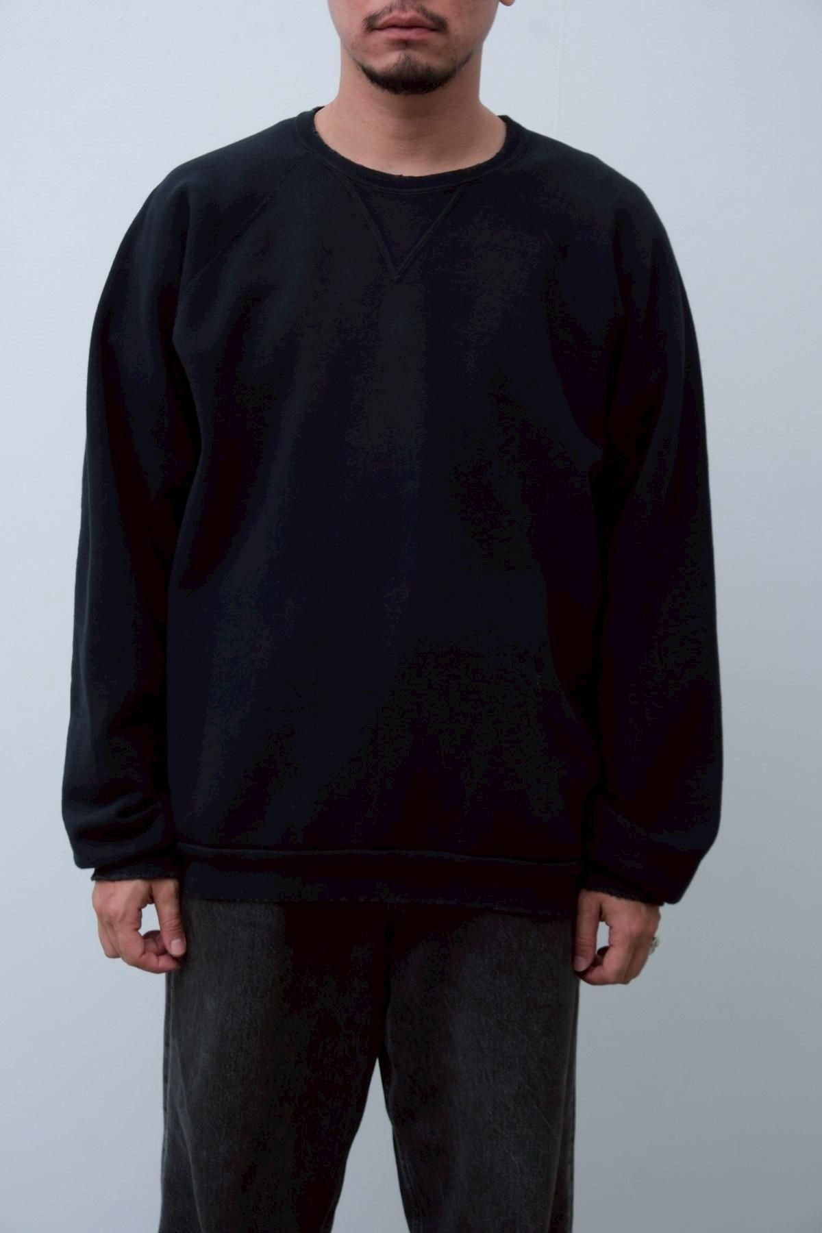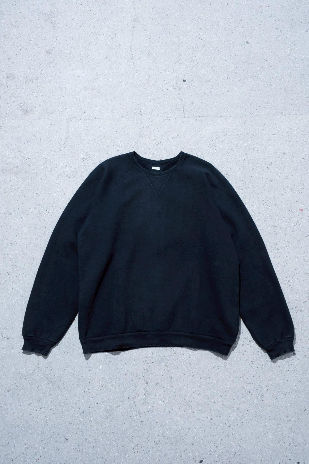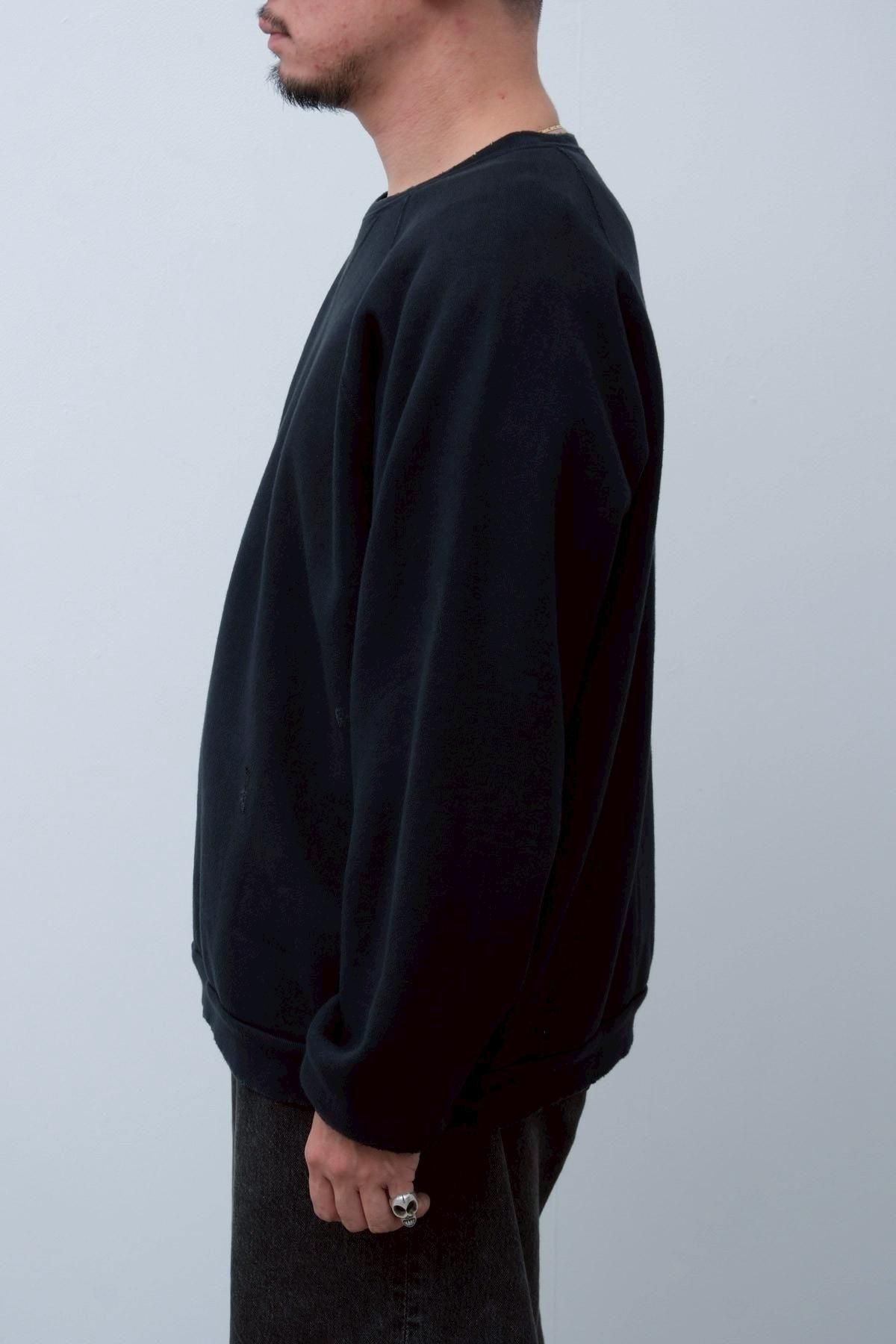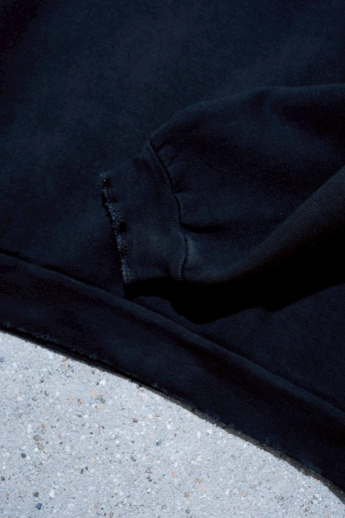 ヴィンテージの薄く伸びきって緩くなったリブや、Vガゼットの歪みなど、あえて崩れたシルエットに設計。崩れたシルエットに設計。表地はヴィンテージを解析して作った吊り裏毛を使用。1時間に1メートルというゆっくりとしたスピードでしか編み立てられないが、糸に余計な負荷を掛けずに編み上げることで、肉厚ながらも固くならずふっくらとした風合いに仕上げた。ヴィンテージを踏襲し職人による手作業で色むらやダメージの経年変化を表現している。