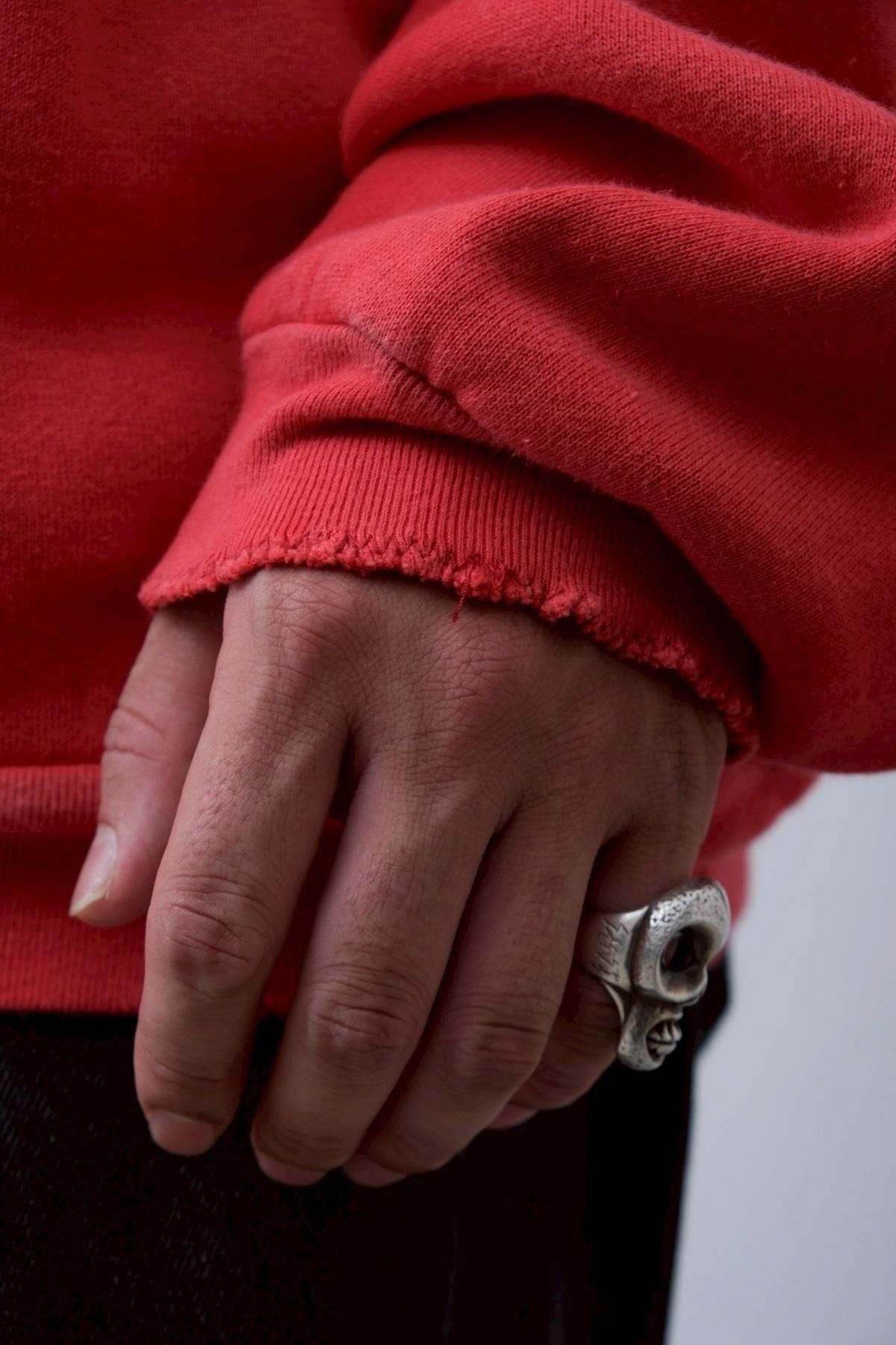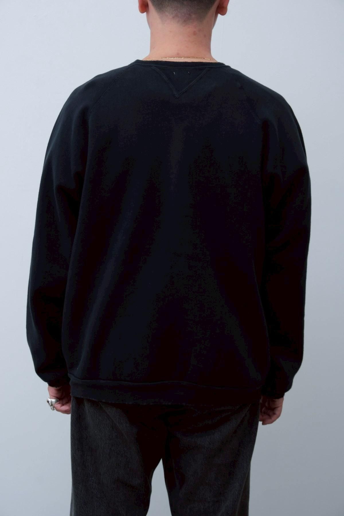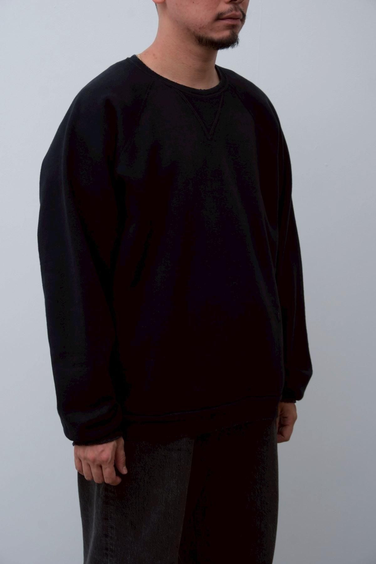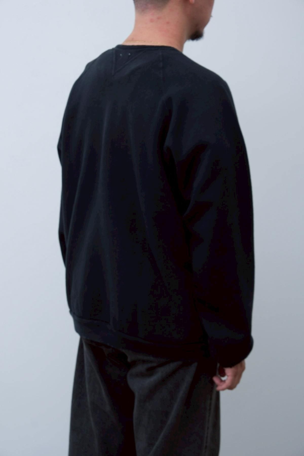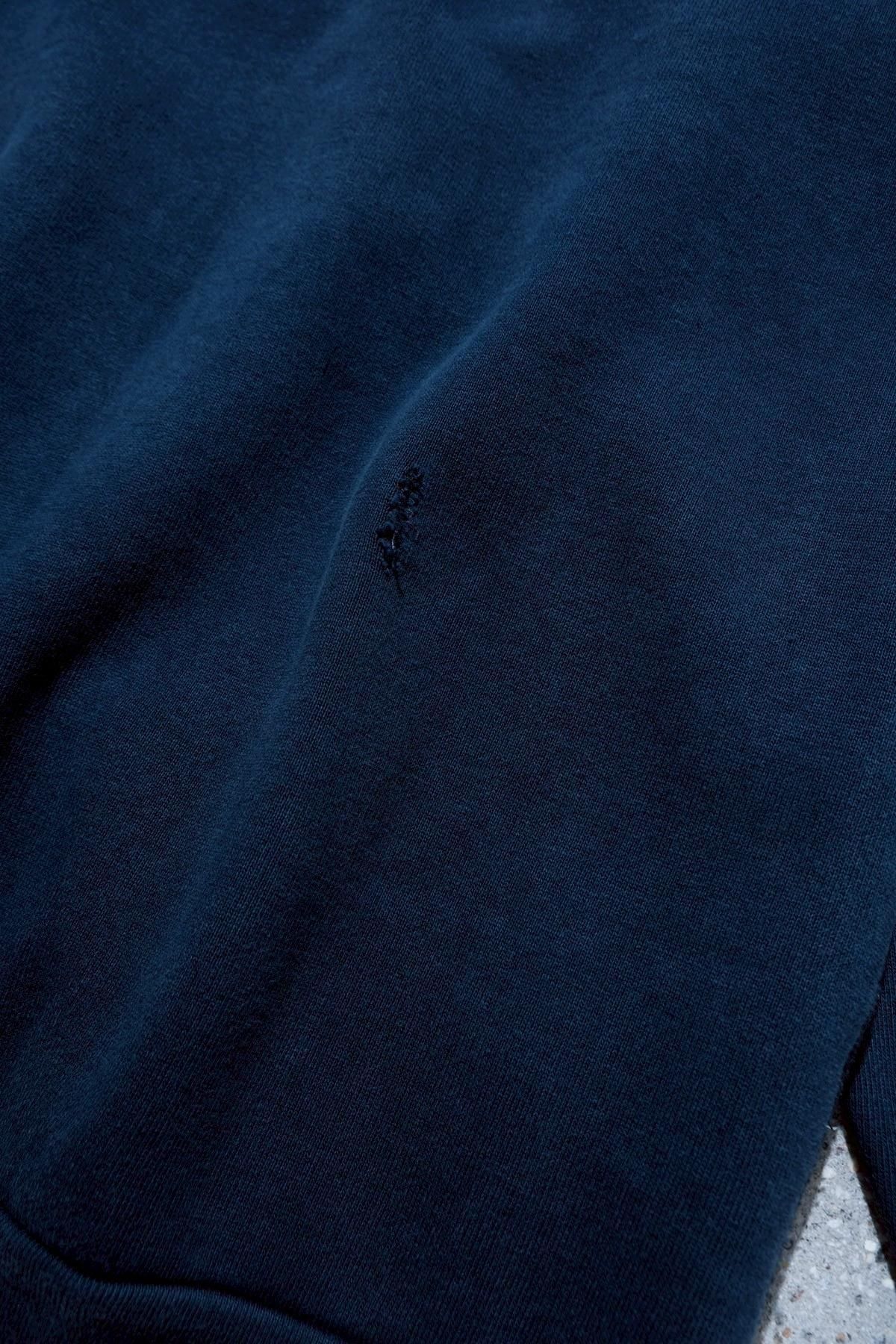 ヴィンテージの薄く伸びきって緩くなったリブや、Vガゼットの歪みなど、あえて崩れたシルエットに設計。崩れたシルエットに設計。表地はヴィンテージを解析して作った吊り裏毛を使用。1時間に1メートルというゆっくりとしたスピードでしか編み立てられないが、糸に余計な負荷を掛けずに編み上げることで、肉厚ながらも固くならずふっくらとした風合いに仕上げた。ヴィンテージを踏襲し職人による手作業で色むらやダメージの経年変化を表現している。