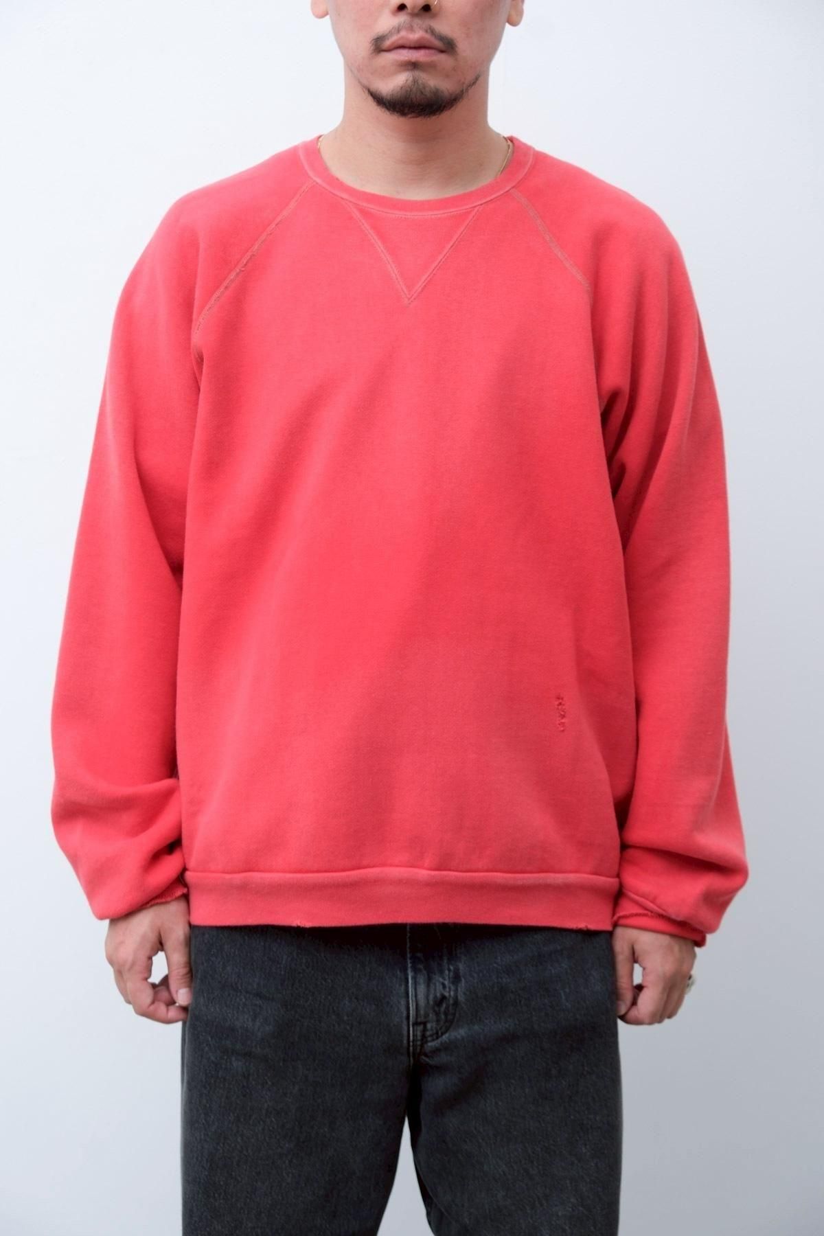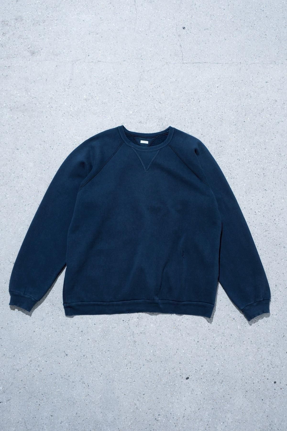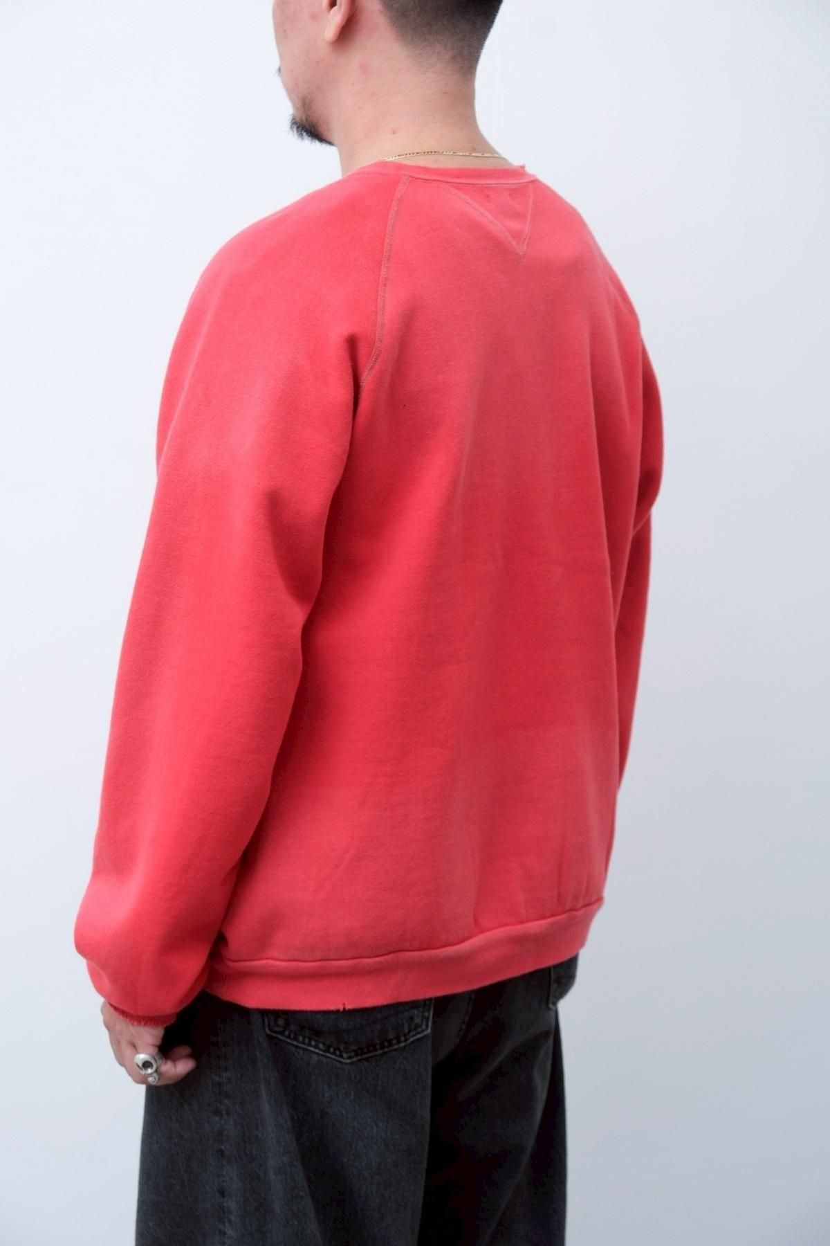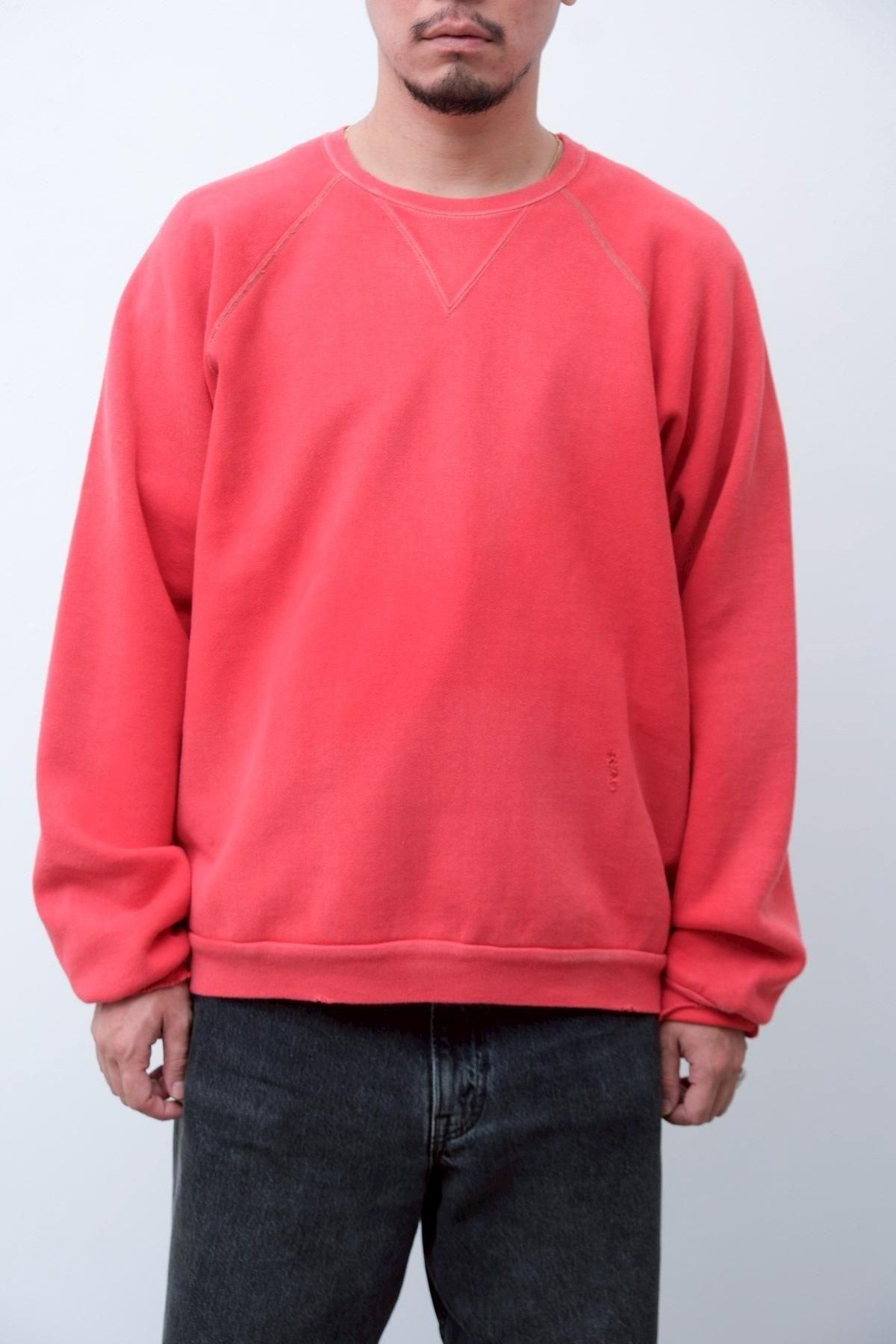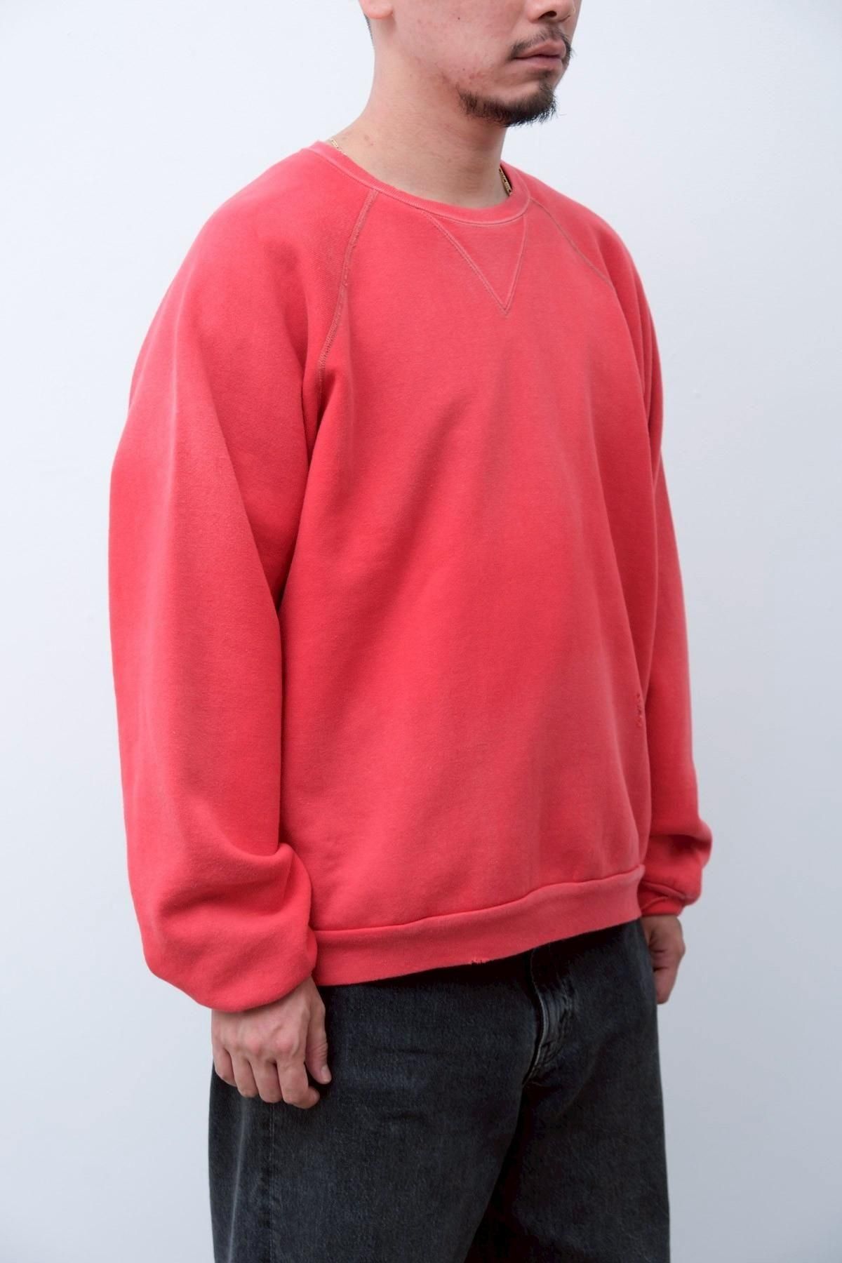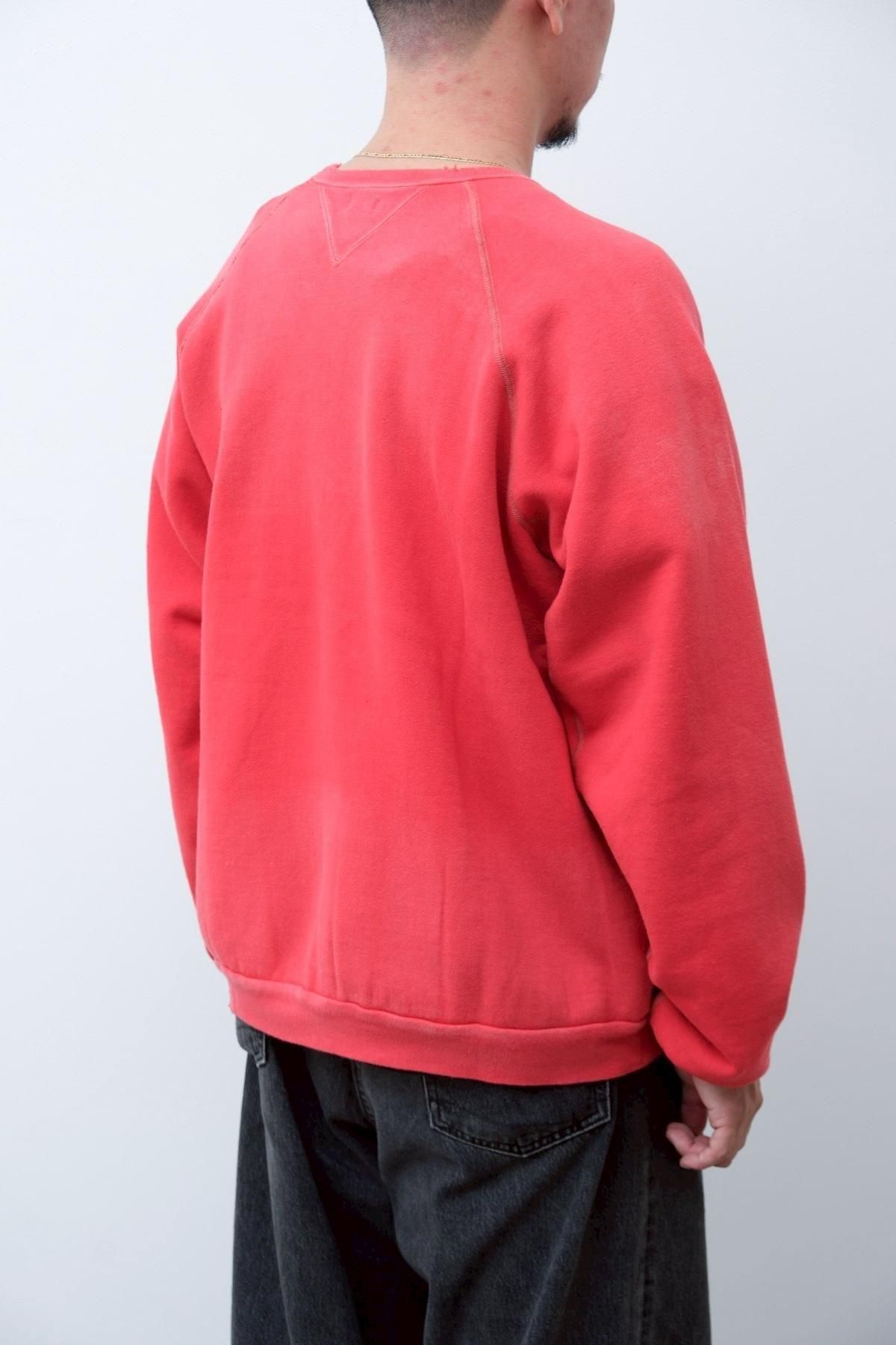 ヴィンテージの薄く伸びきって緩くなったリブや、Vガゼットの歪みなど、あえて崩れたシルエットに設計。崩れたシルエットに設計。表地はヴィンテージを解析して作った吊り裏毛を使用。1時間に1メートルというゆっくりとしたスピードでしか編み立てられないが、糸に余計な負荷を掛けずに編み上げることで、肉厚ながらも固くならずふっくらとした風合いに仕上げた。ヴィンテージを踏襲し職人による手作業で色むらやダメージの経年変化を表現している。