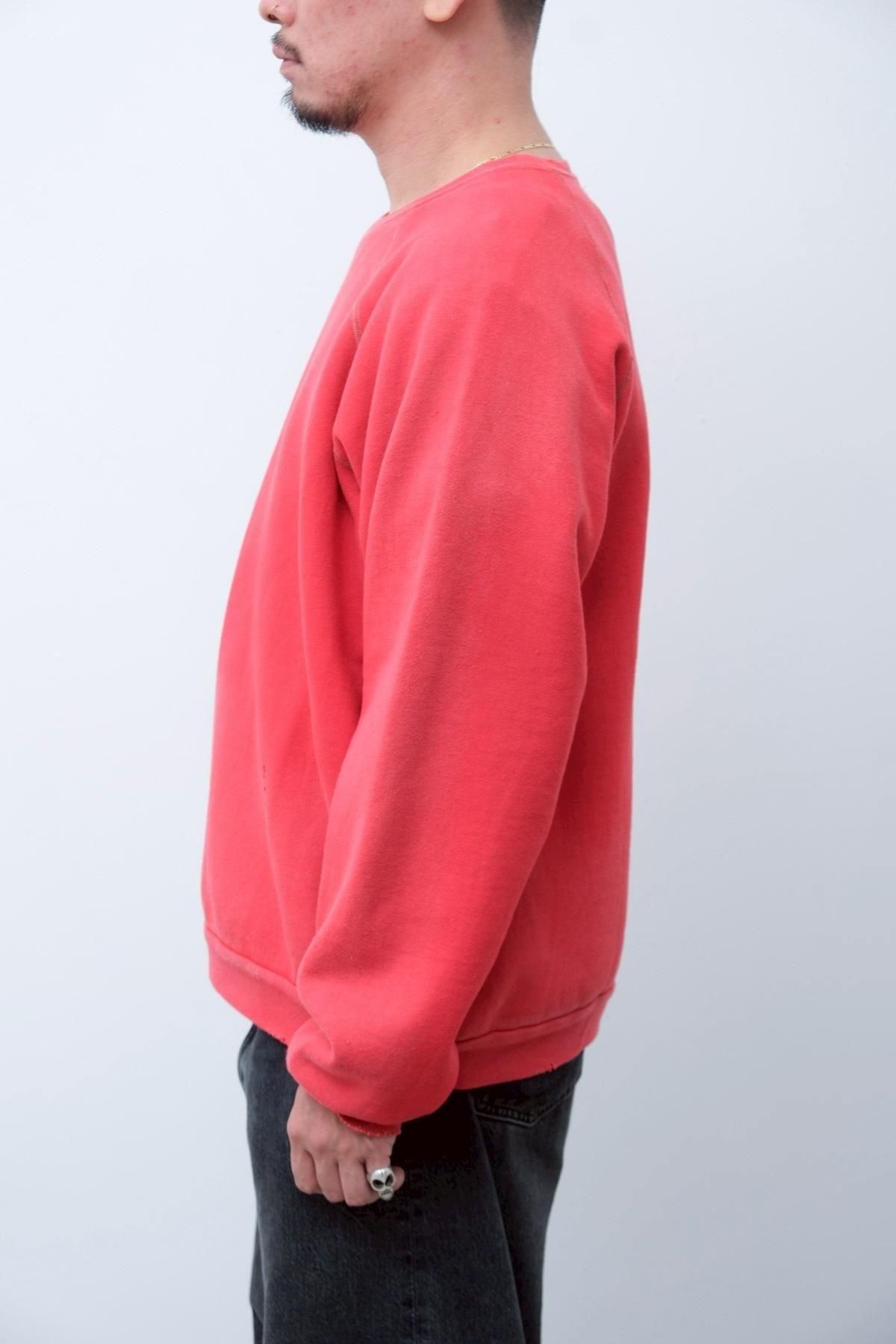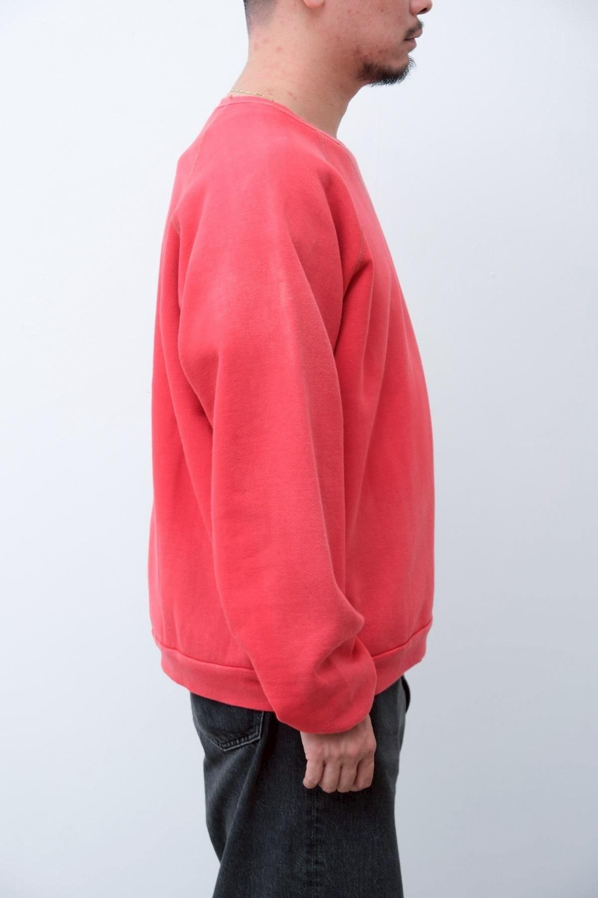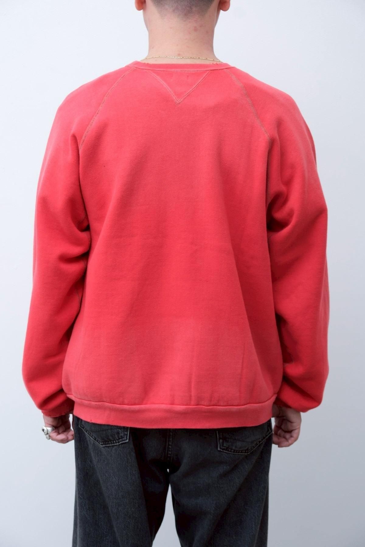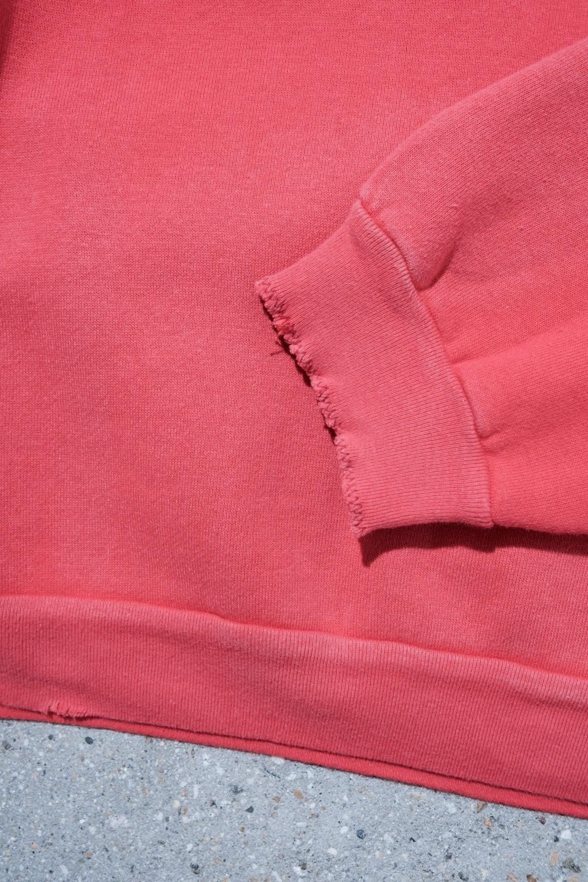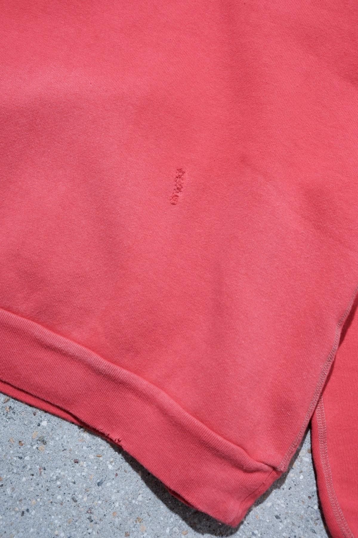ヴィンテージの薄く伸びきって緩くなったリブや、Vガゼットの歪みなど、あえて崩れたシルエットに設計。崩れたシルエットに設計。表地はヴィンテージを解析して作った吊り裏毛を使用。1時間に1メートルというゆっくりとしたスピードでしか編み立てられないが、糸に余計な負荷を掛けずに編み上げることで、肉厚ながらも固くならずふっくらとした風合いに仕上げた。ヴィンテージを踏襲し職人による手作業で色むらやダメージの経年変化を表現している。