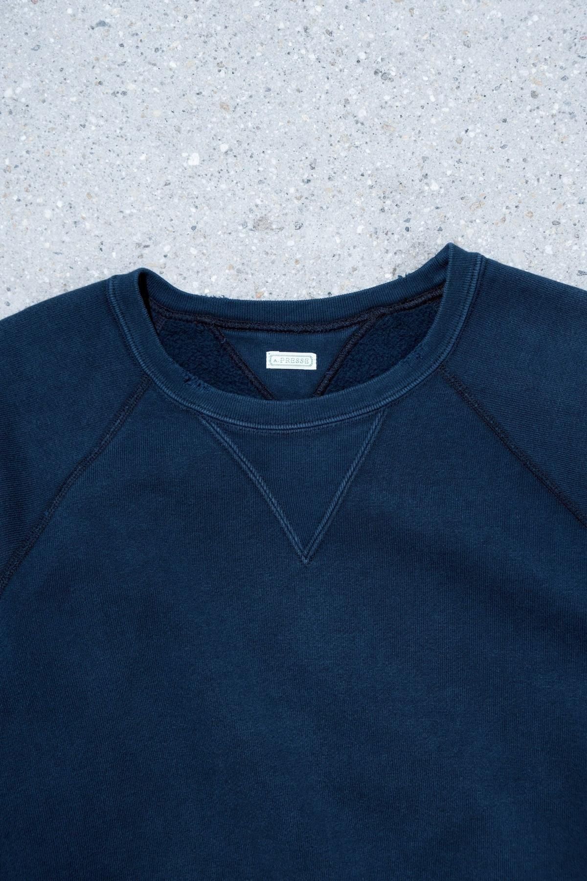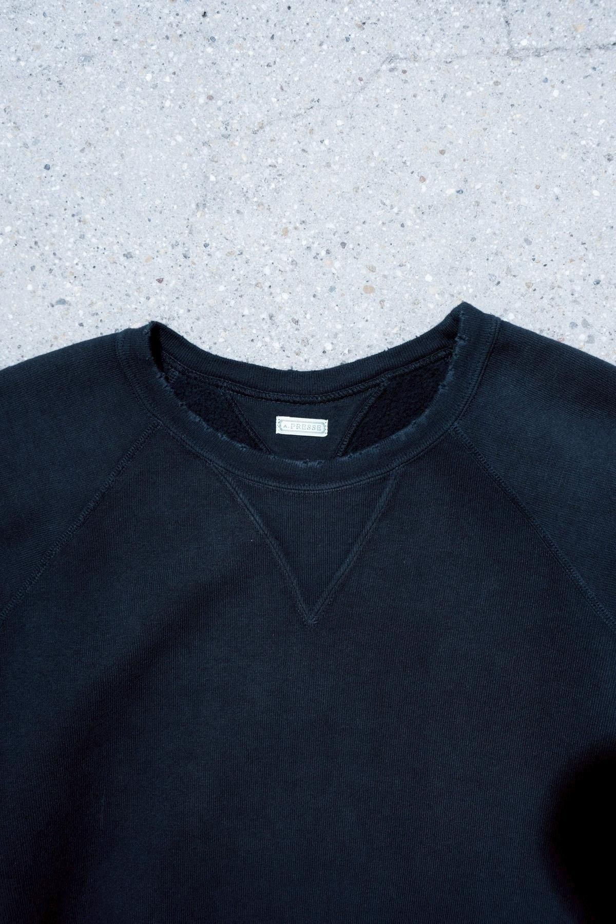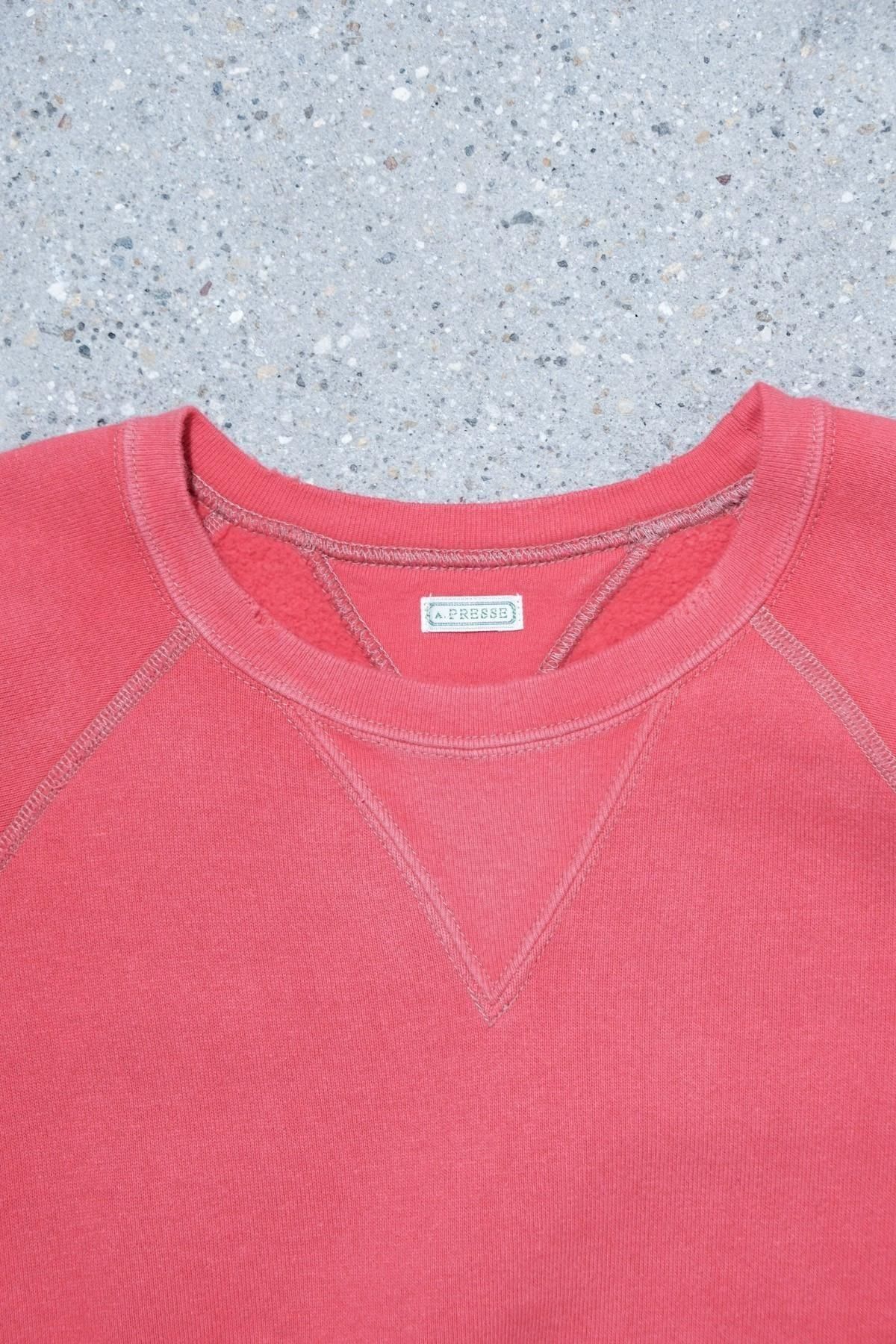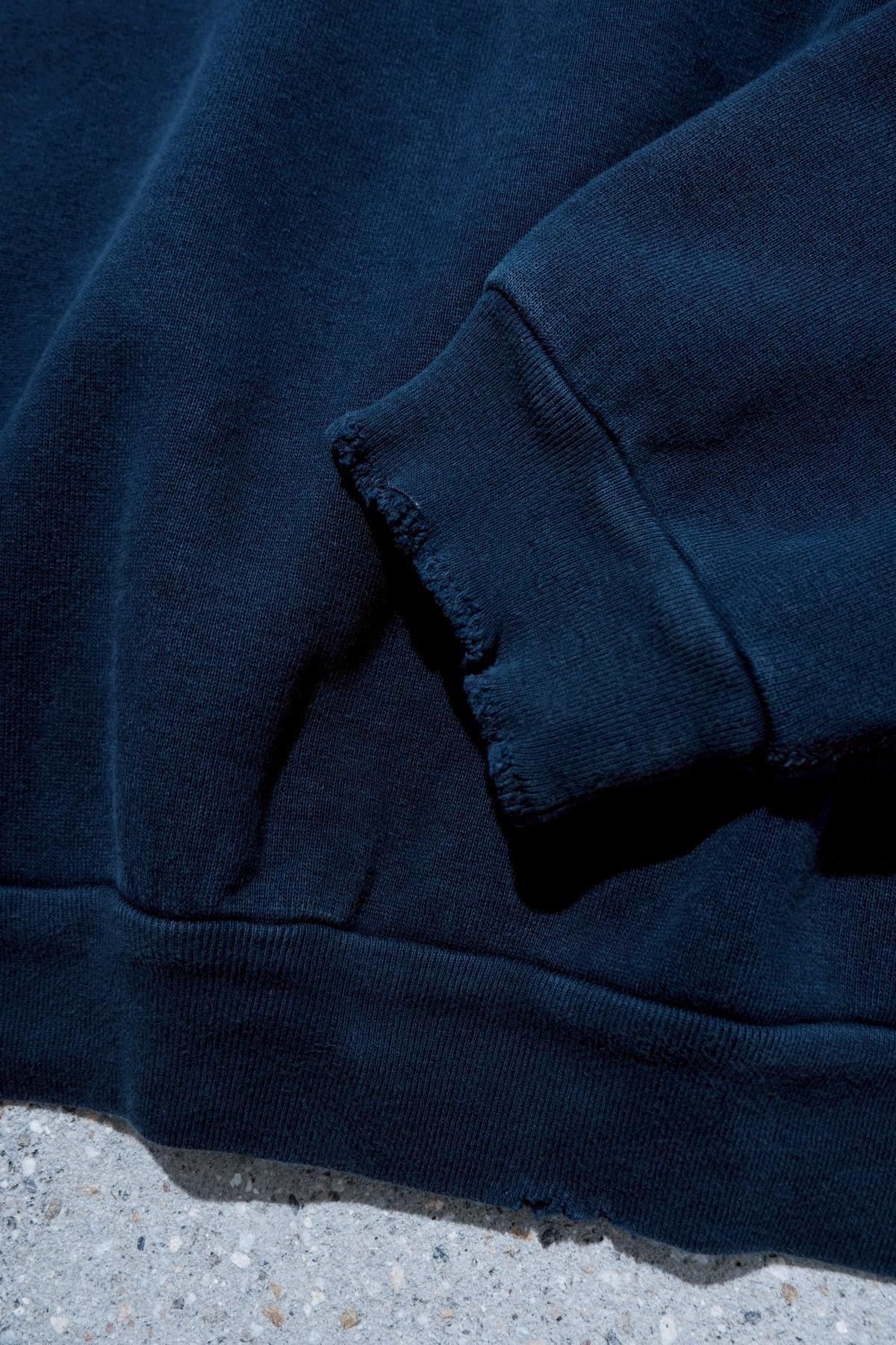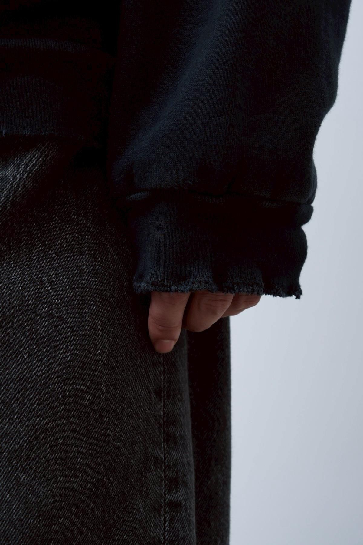 ヴィンテージの薄く伸びきって緩くなったリブや、Vガゼットの歪みなど、あえて崩れたシルエットに設計。崩れたシルエットに設計。表地はヴィンテージを解析して作った吊り裏毛を使用。1時間に1メートルというゆっくりとしたスピードでしか編み立てられないが、糸に余計な負荷を掛けずに編み上げることで、肉厚ながらも固くならずふっくらとした風合いに仕上げた。ヴィンテージを踏襲し職人による手作業で色むらやダメージの経年変化を表現している。