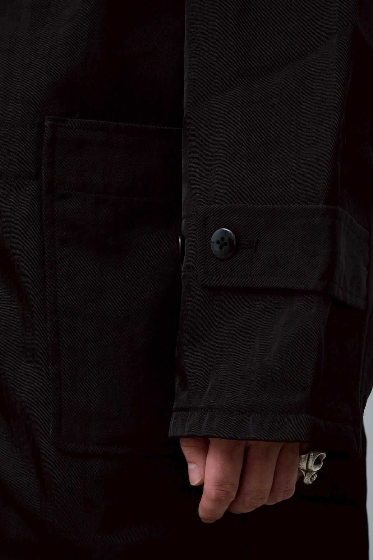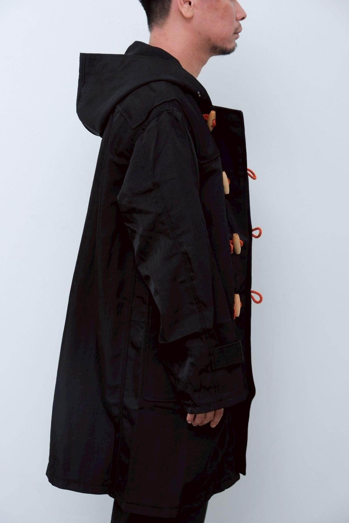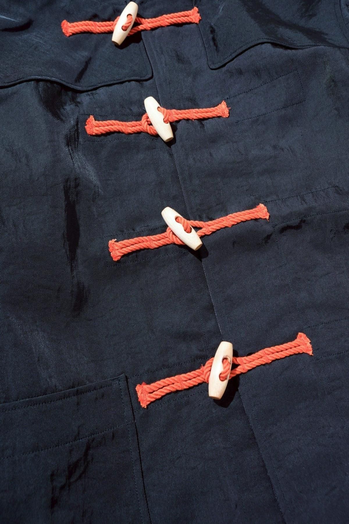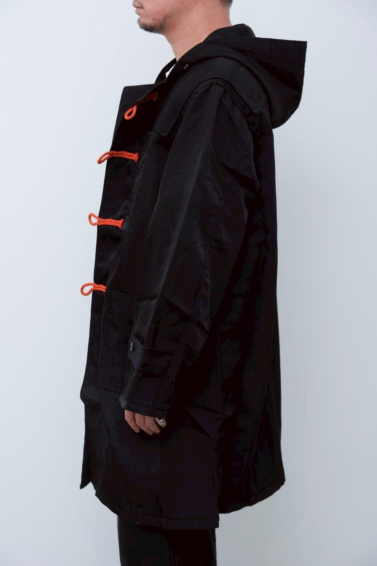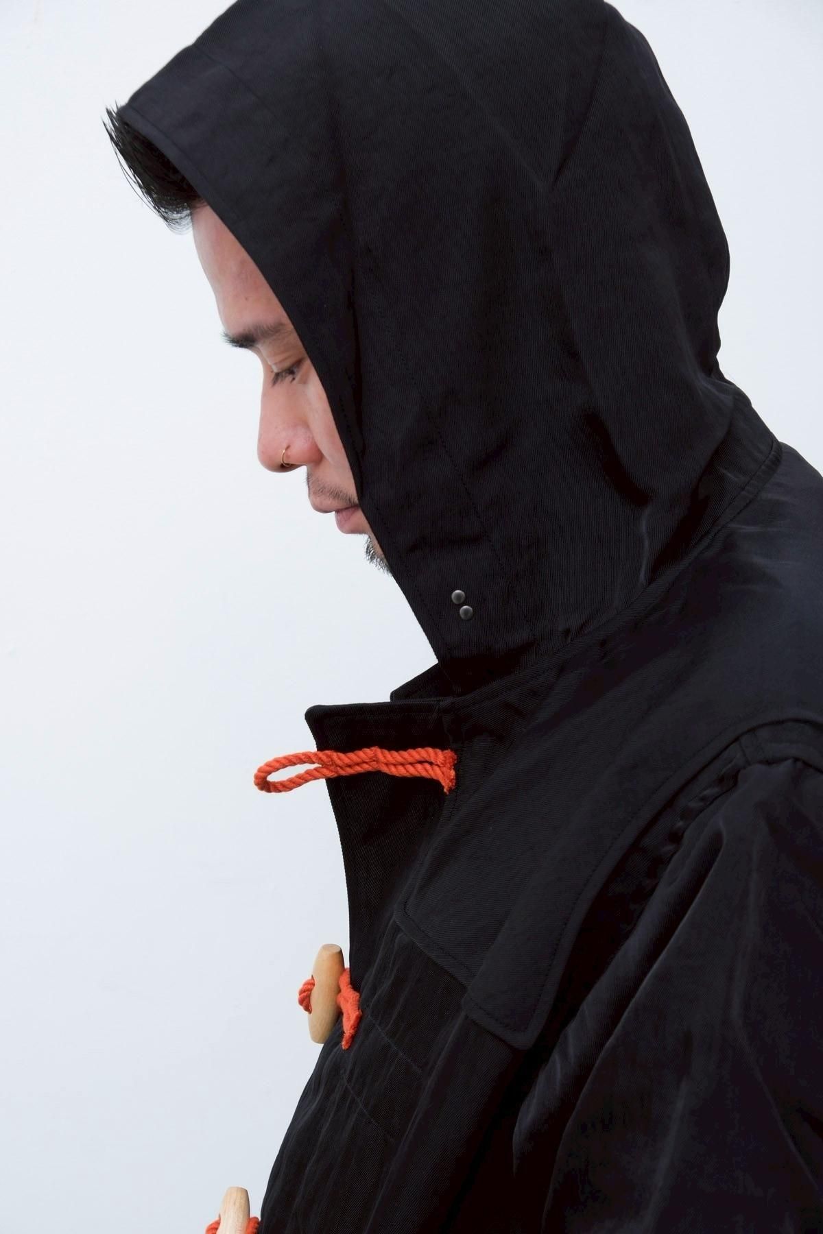 金子氏が古着屋で見つけた、薄手のメルトンで仕立てられ、背中にはアメリカのマーチングバンドのものと思しきチームの刺繍が施されてた愛嬌のあるダッフルコートがリファレンス。トグルを留める紐には、発色のいい鮮やかなオレンジ色の合繊糸があしらわれており、黒いメルトンとのコントラストが特徴の古着を、厚手のヘビーナイロン地に置き換えることで現代的に着地させた一着。トグルの紐とのコントラストも、どこかMA-1のようで、違和感と既視感が同時に押し寄せてくるような佇まいに。ウールの重たいダッフルではなく、ナイロンの軽いダッフルの新しさをぜひお楽しみください。