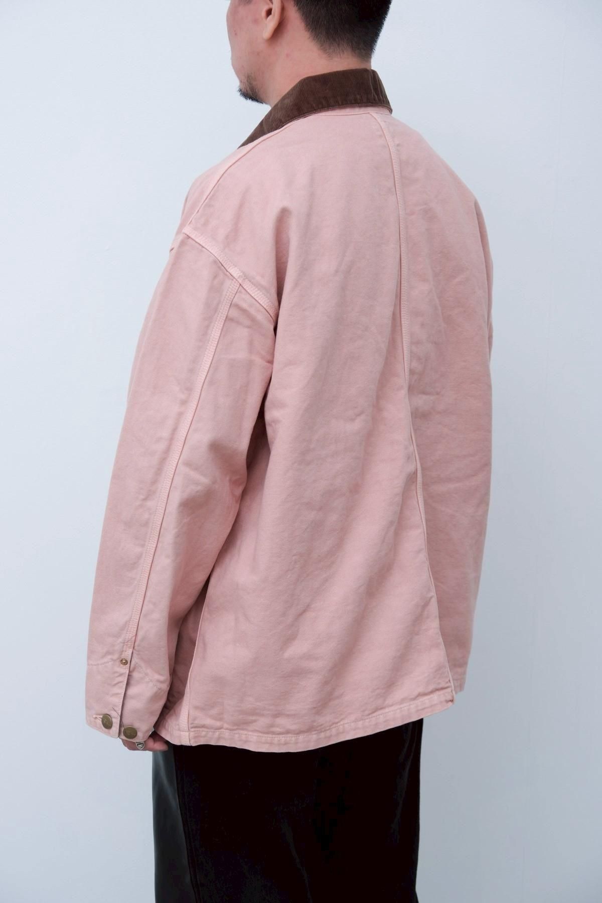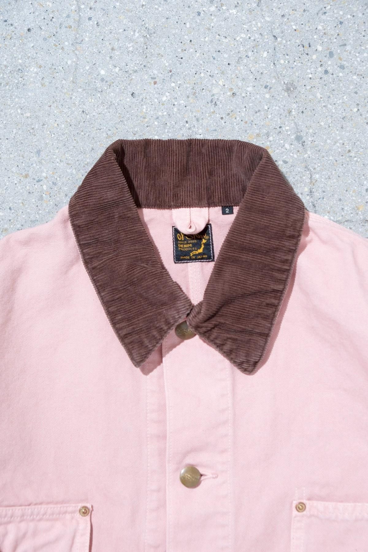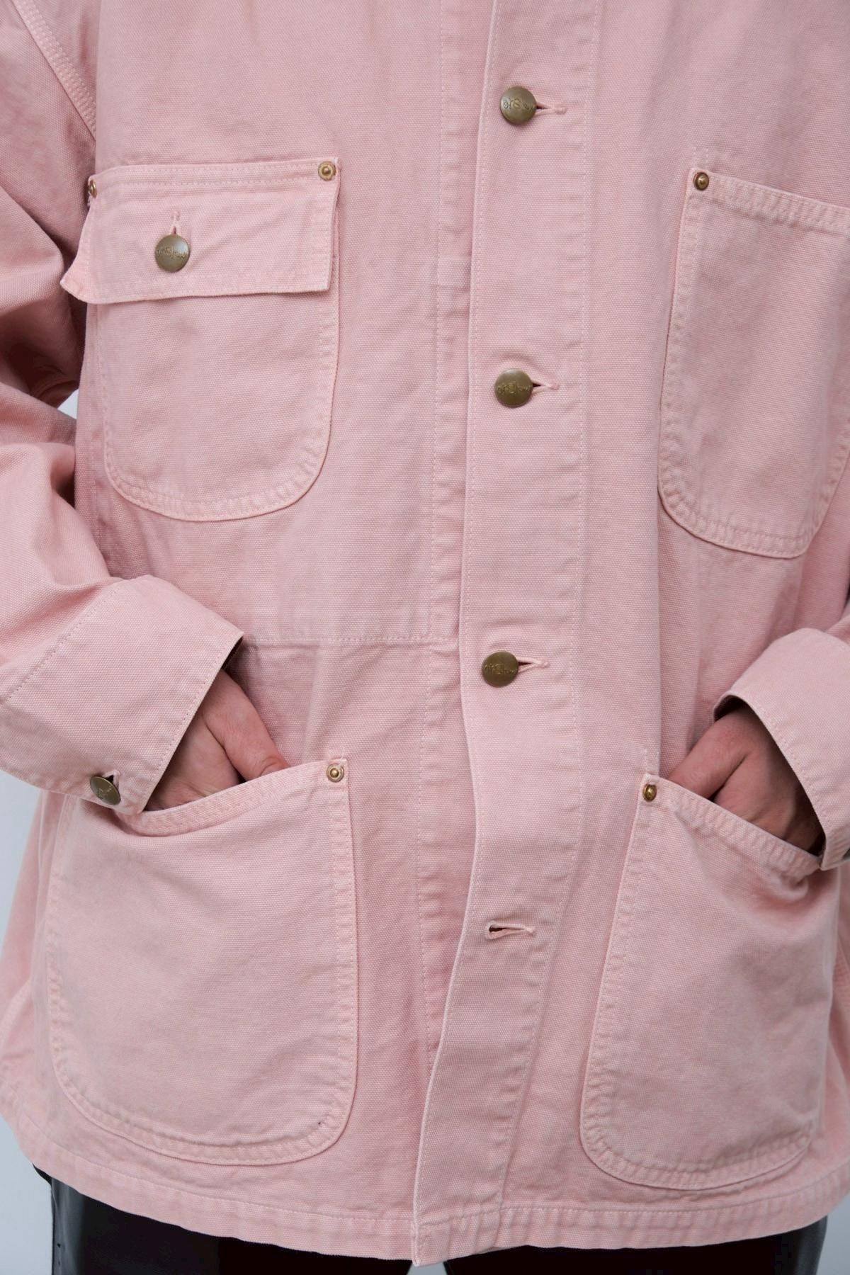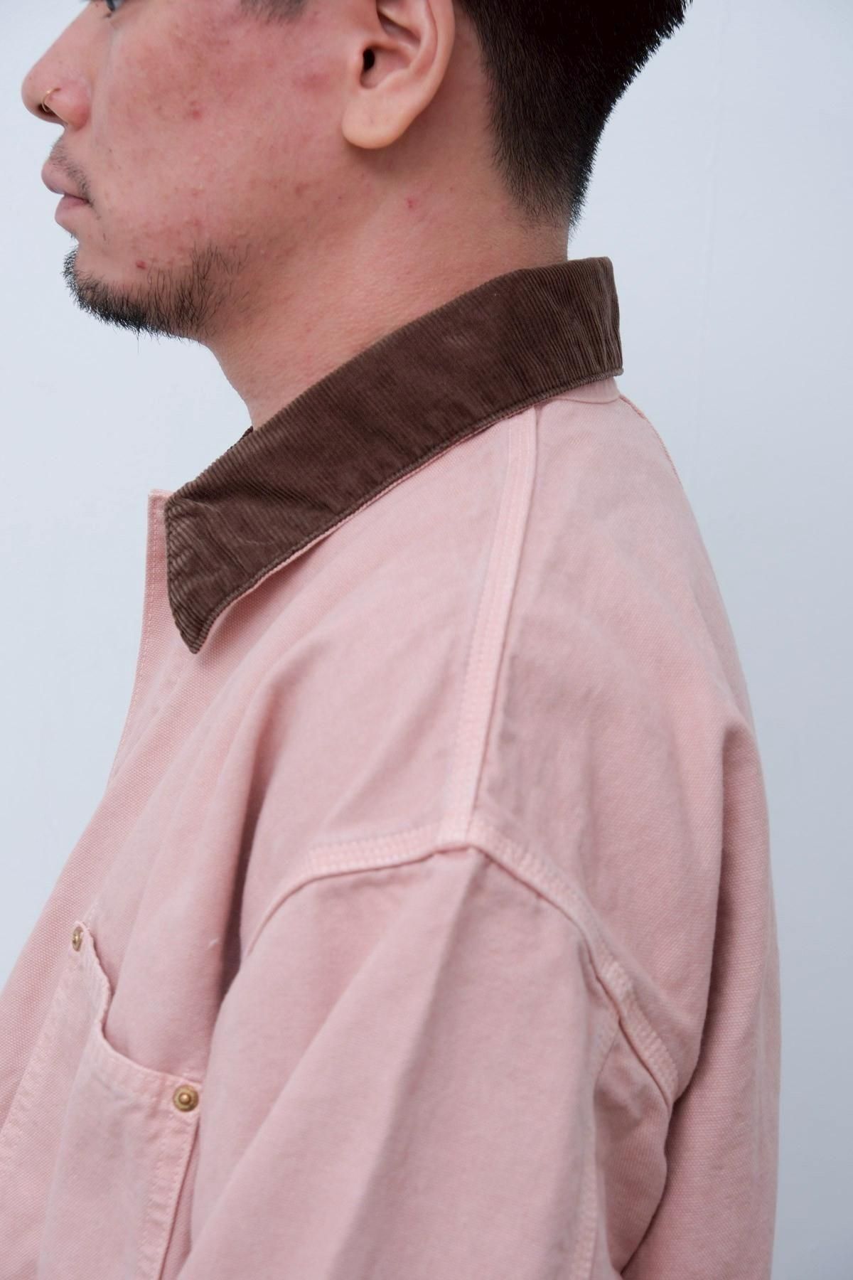 IMA:ZINEの8周年記念となる今回の《仲津3》は、これまでとは一転、仲津氏の優しく柔らかい人柄を表現しました。男のユニフォームの代表格といえるカバーオールをベースに、肌色に近く、柔らかなベージュピンクを纏わせました。日本の老舗帆布メーカーにて織り上げた10/8オックスフォード生地のカバーオールで、適度なハリとコシのある肌触りに。襟はブラウンのコーデュロイ生地を使用。ベージュピンクとの美しいコントラストをつけ、アメリカ物のフェードしたインディゴデニムに溶け込むようなカラーリングに。男性のみならず、女性にも着ていただきたいカバーオールとなっています。