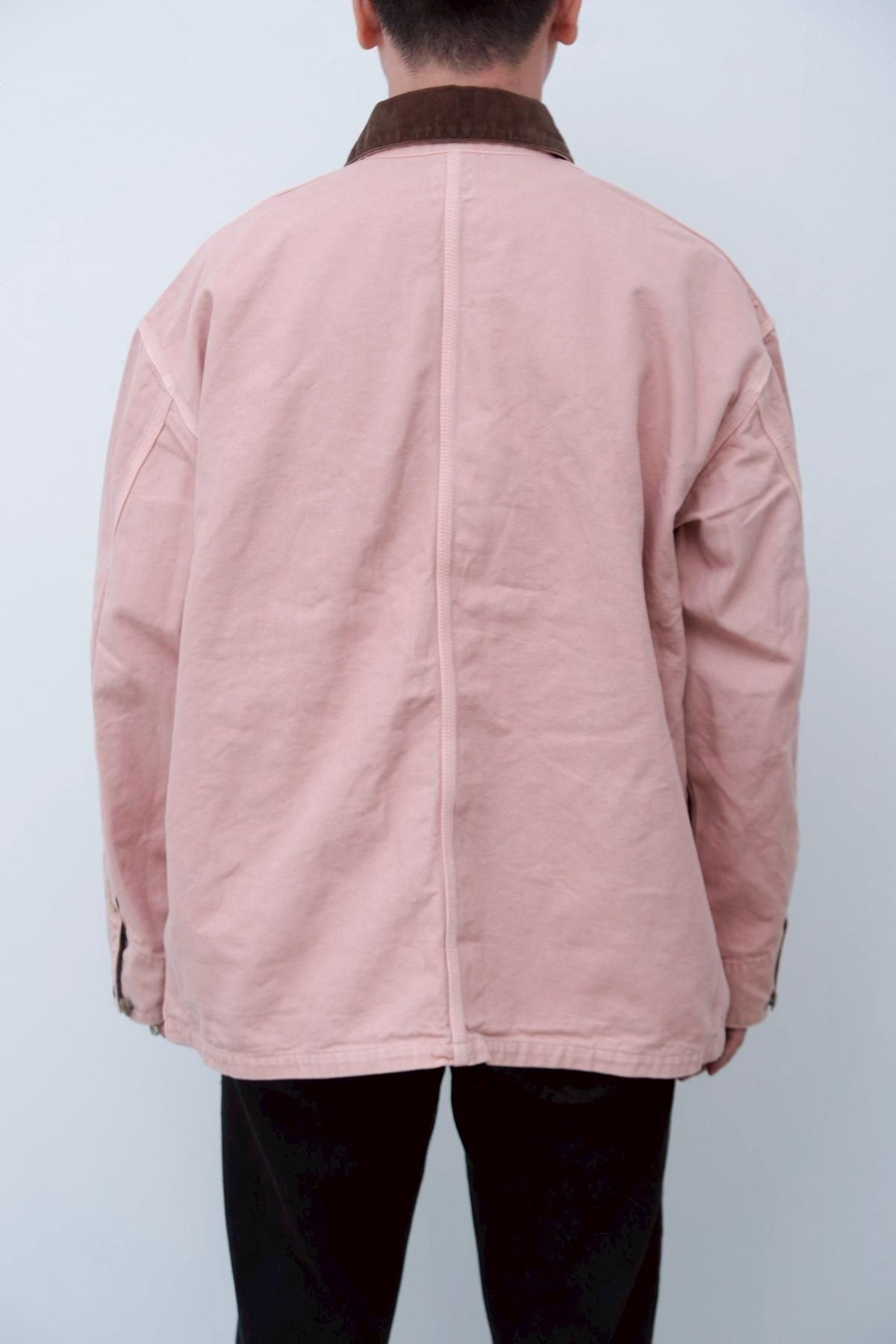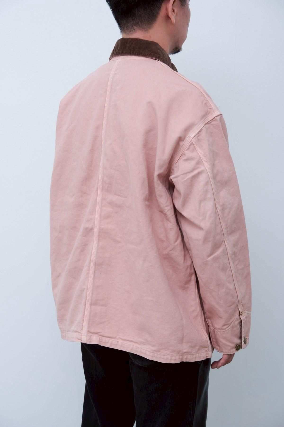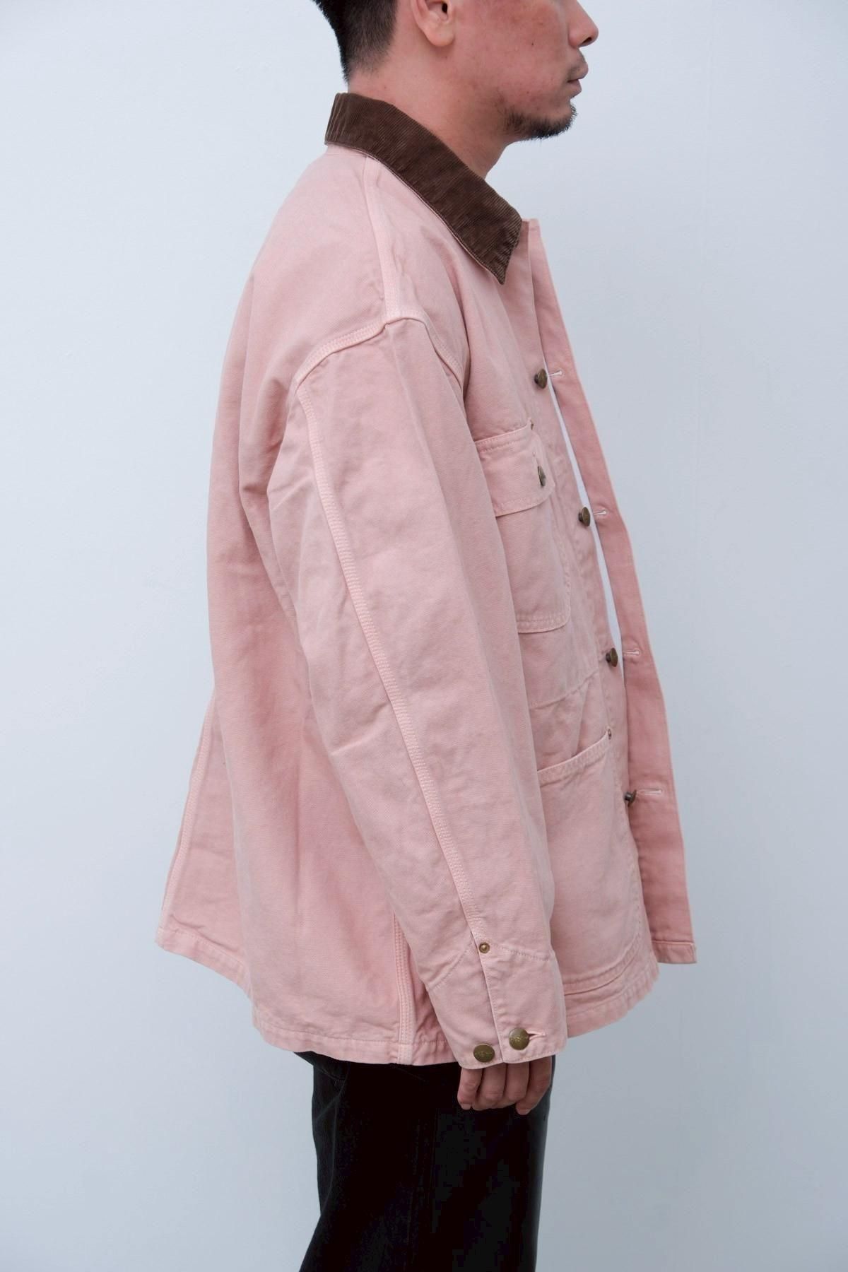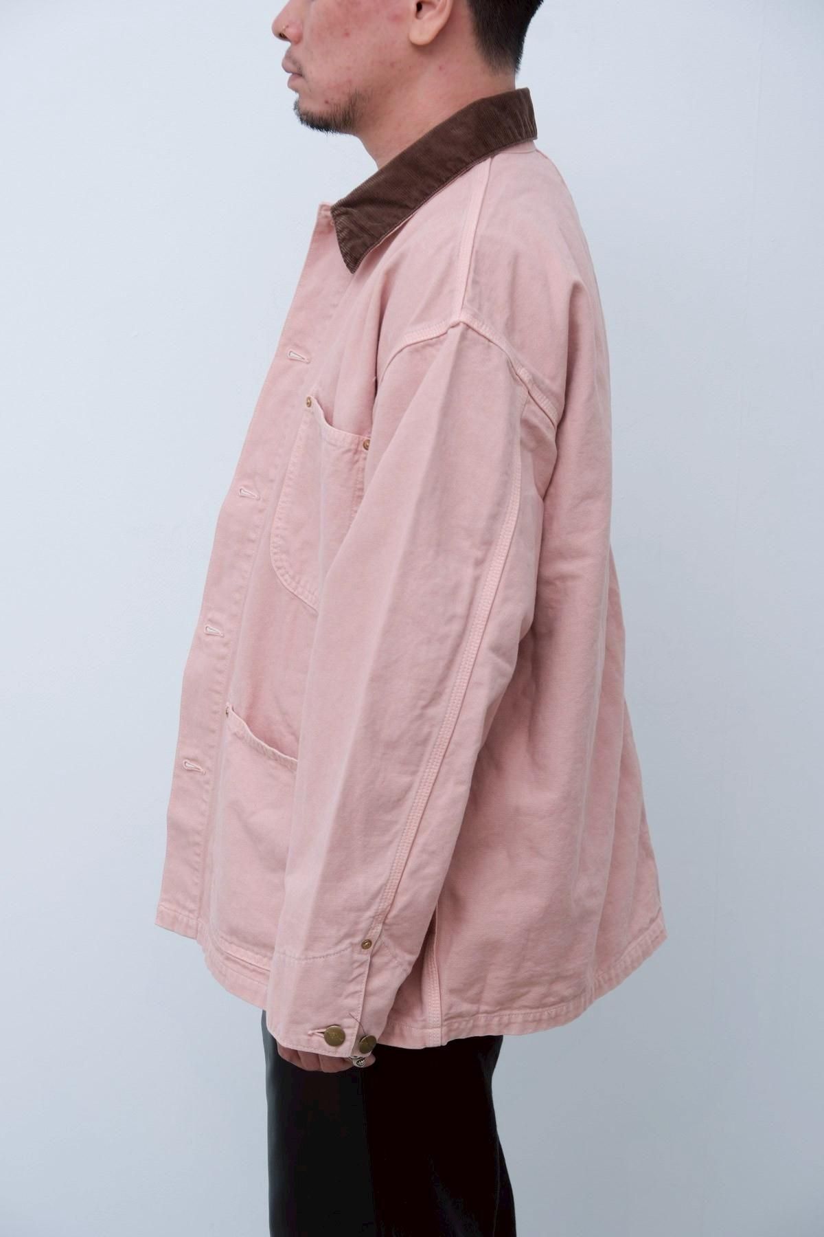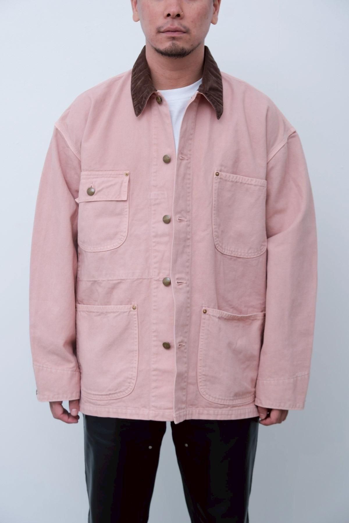 IMA:ZINEの8周年記念となる今回の《仲津3》は、これまでとは一転、仲津氏の優しく柔らかい人柄を表現しました。男のユニフォームの代表格といえるカバーオールをベースに、肌色に近く、柔らかなベージュピンクを纏わせました。日本の老舗帆布メーカーにて織り上げた10/8オックスフォード生地のカバーオールで、適度なハリとコシのある肌触りに。襟はブラウンのコーデュロイ生地を使用。ベージュピンクとの美しいコントラストをつけ、アメリカ物のフェードしたインディゴデニムに溶け込むようなカラーリングに。男性のみならず、女性にも着ていただきたいカバーオールとなっています。