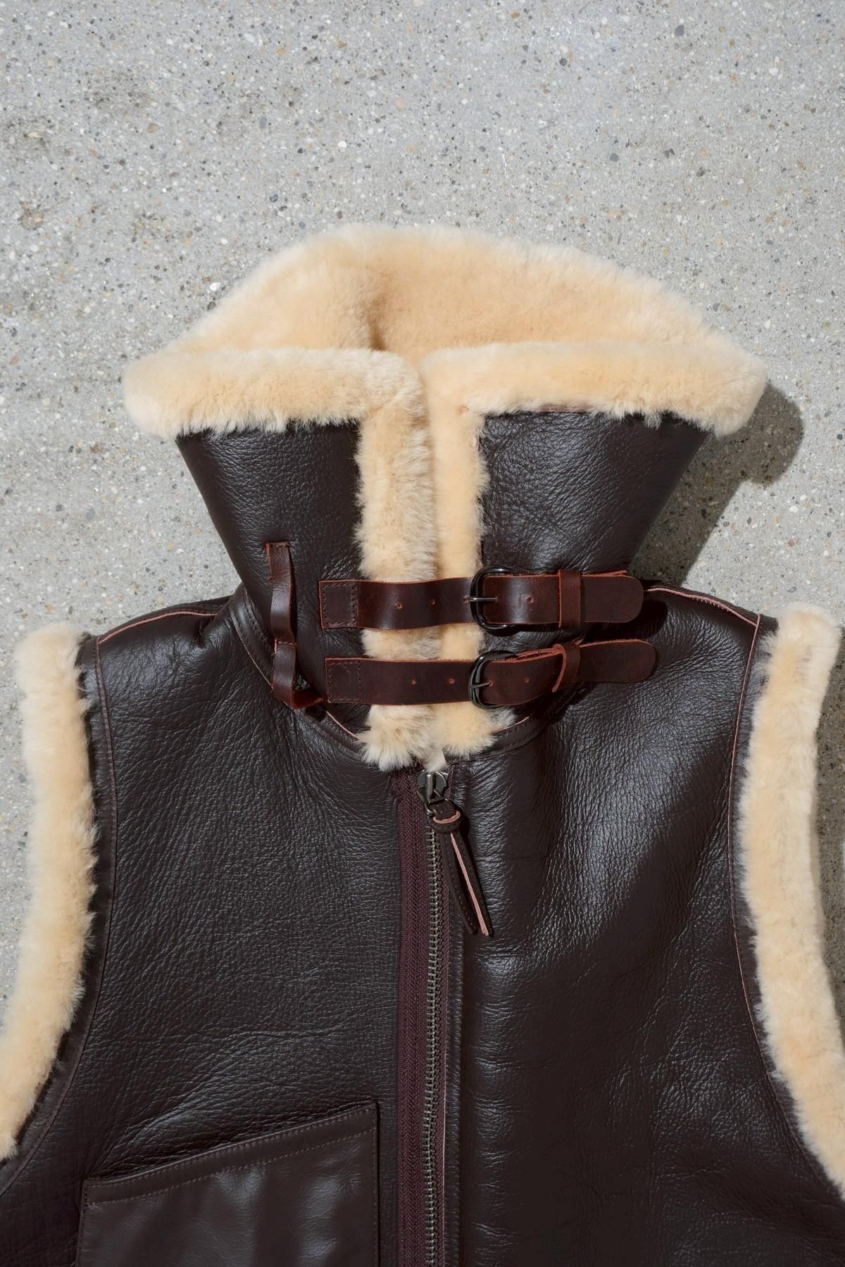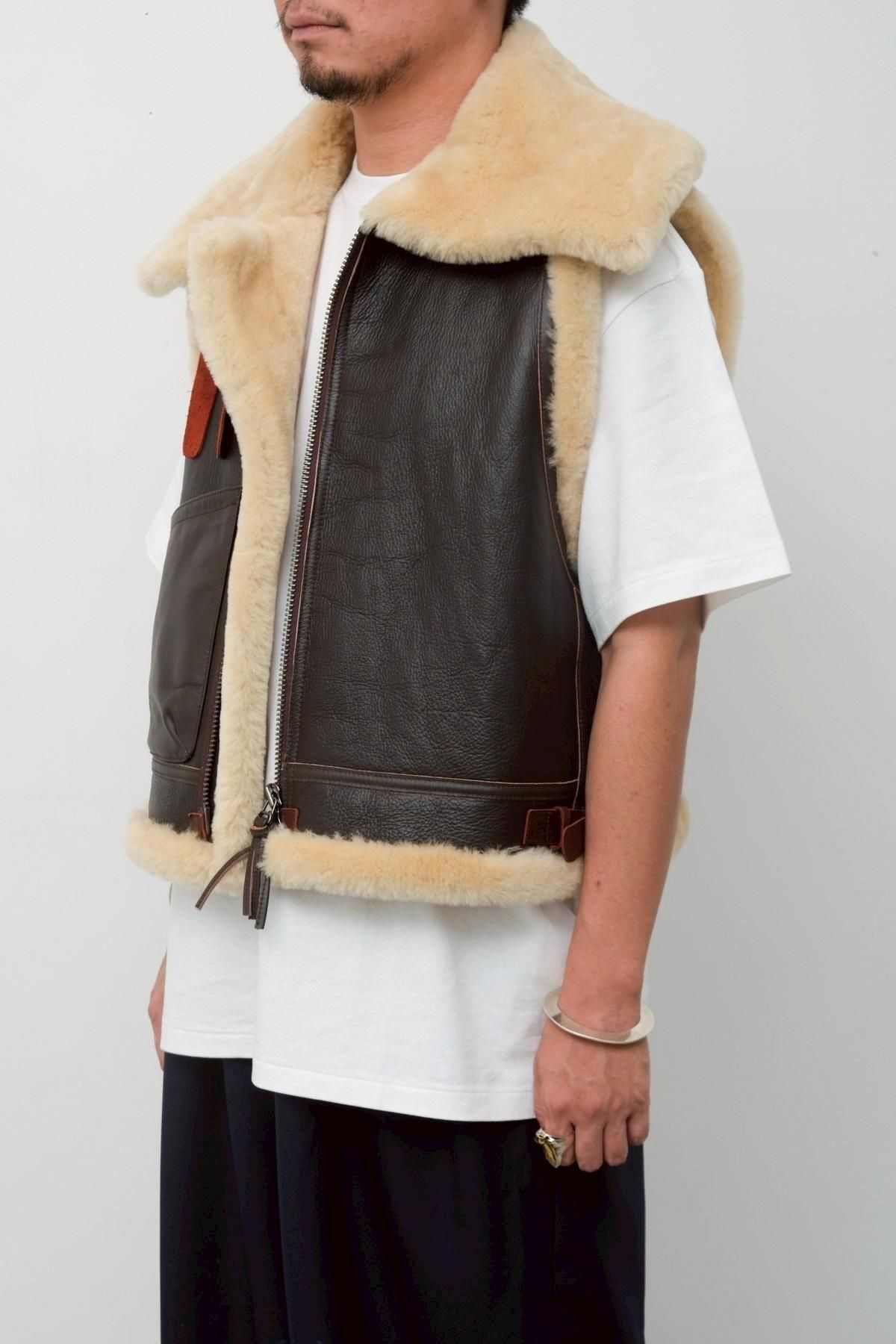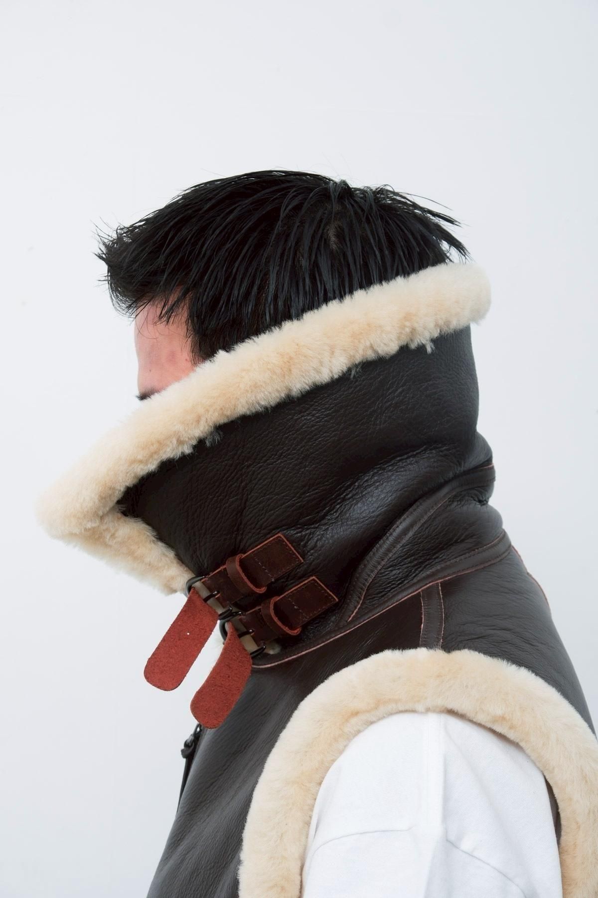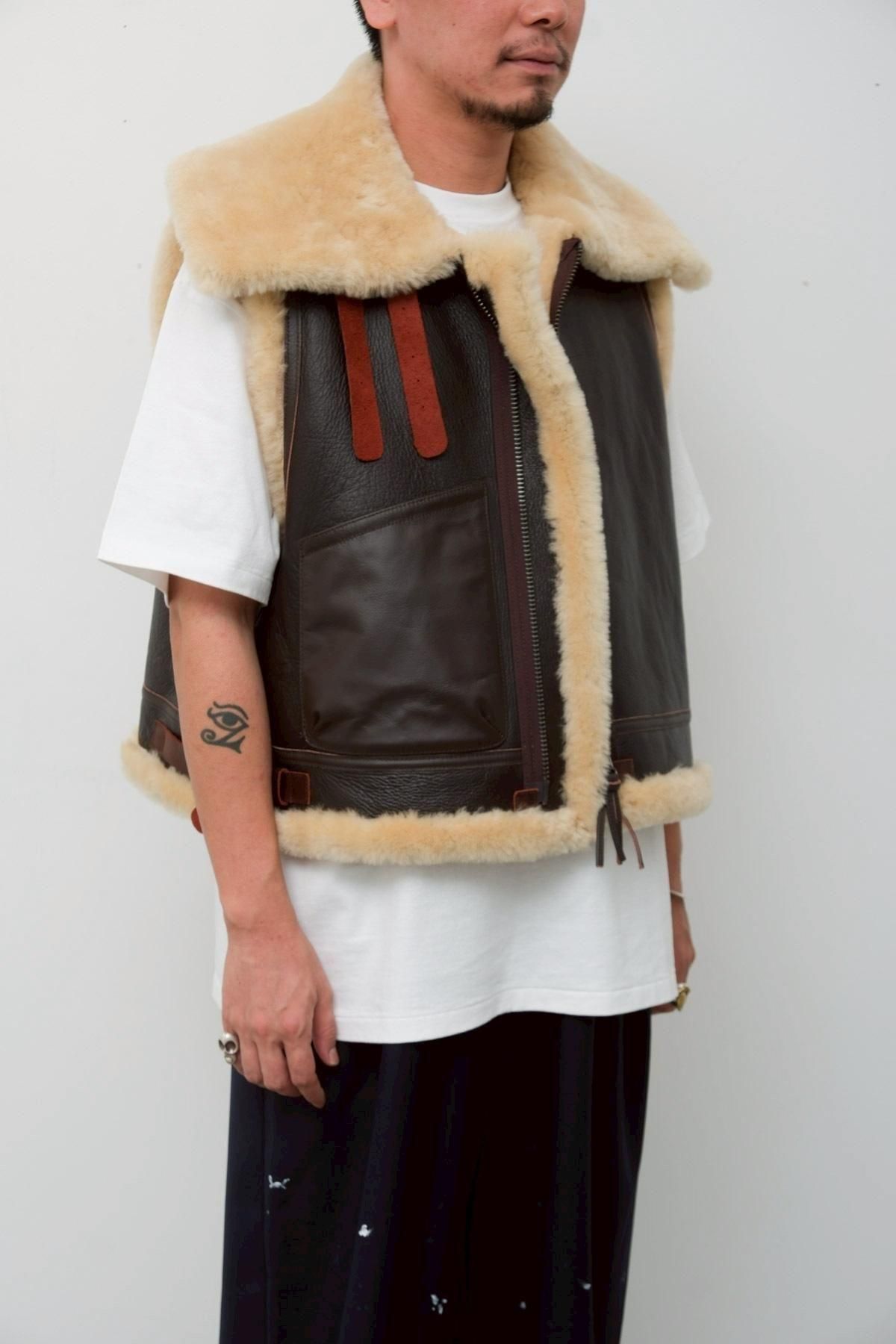 ボマージャケットの代表格として名⾼いType B-3ジャケットをソースに《RHODOLIRION》らしいデフォルメを効かせたムートンベスト。⽑⾜の⻑いムートンを使⽤したデザインが最⼤の特徴で、ヘヴィデューティな⾒た⽬とバツグンの保温⼒を誇る⾸廻りを保護する⼤きな襟や、ウエストのアジャスターベルト、右⾝頃にひとつだけついたパッチポケットなど、デザイン性にも富んだ完成度の⾼いモデルとなっています。アウターの上からでも着用できるアームホールの⼤きさで、様々なレイヤリングコーディネイトが楽しめます。