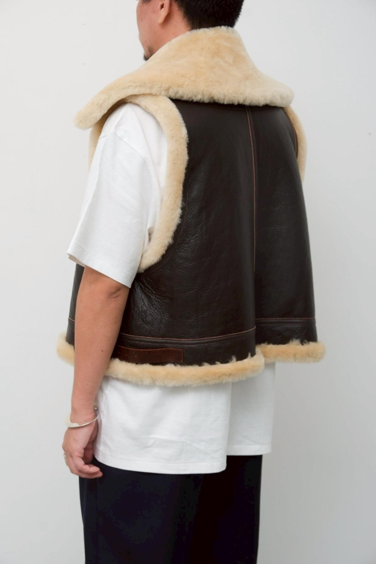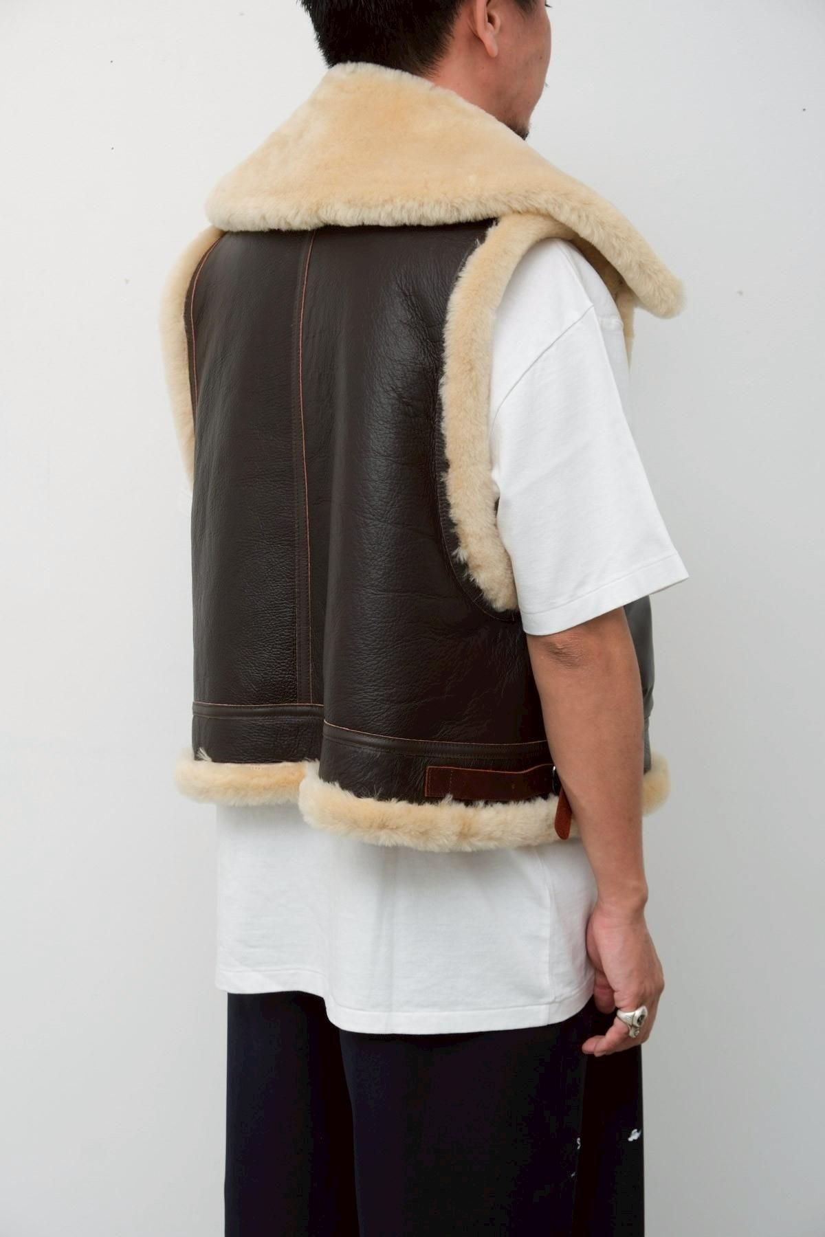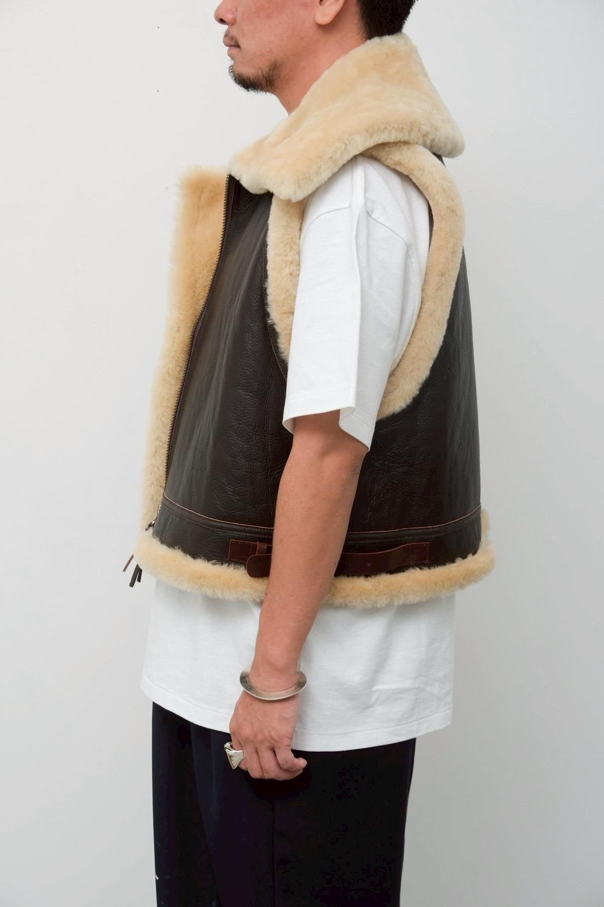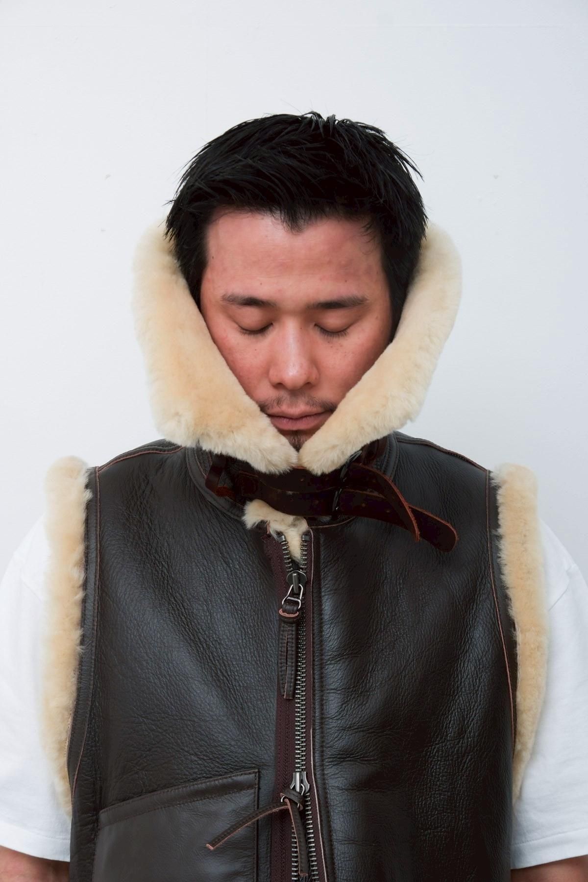 ボマージャケットの代表格として名⾼いType B-3ジャケットをソースに《RHODOLIRION》らしいデフォルメを効かせたムートンベスト。⽑⾜の⻑いムートンを使⽤したデザインが最⼤の特徴で、ヘヴィデューティな⾒た⽬とバツグンの保温⼒を誇る⾸廻りを保護する⼤きな襟や、ウエストのアジャスターベルト、右⾝頃にひとつだけついたパッチポケットなど、デザイン性にも富んだ完成度の⾼いモデルとなっています。アウターの上からでも着用できるアームホールの⼤きさで、様々なレイヤリングコーディネイトが楽しめます。