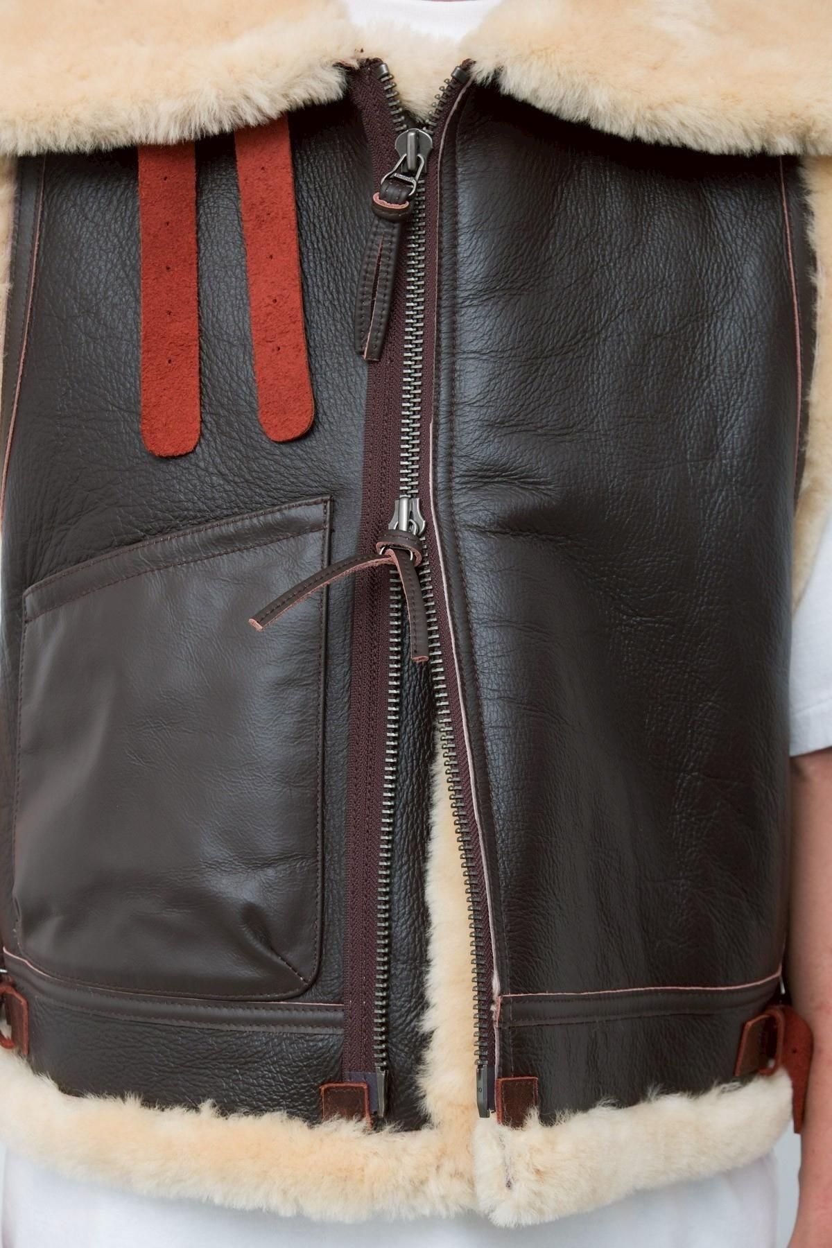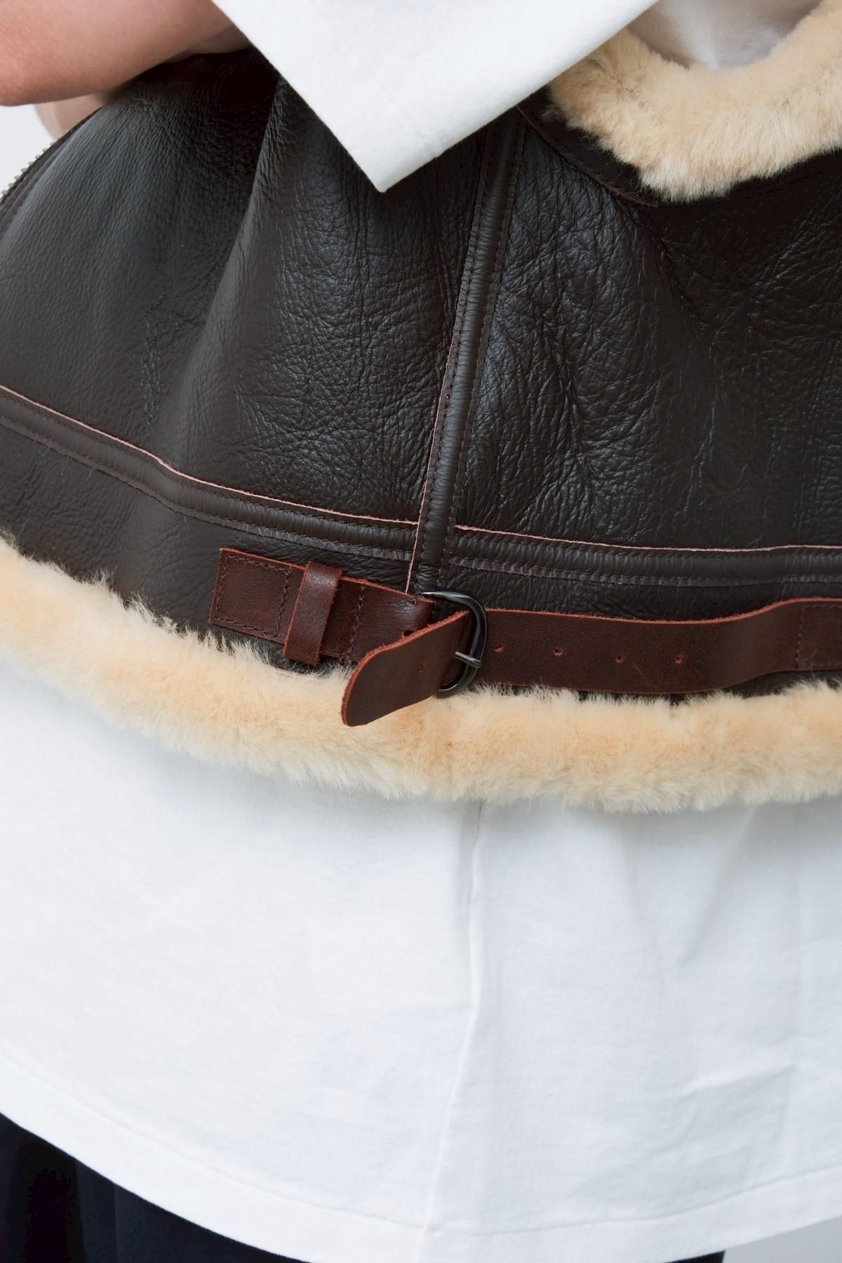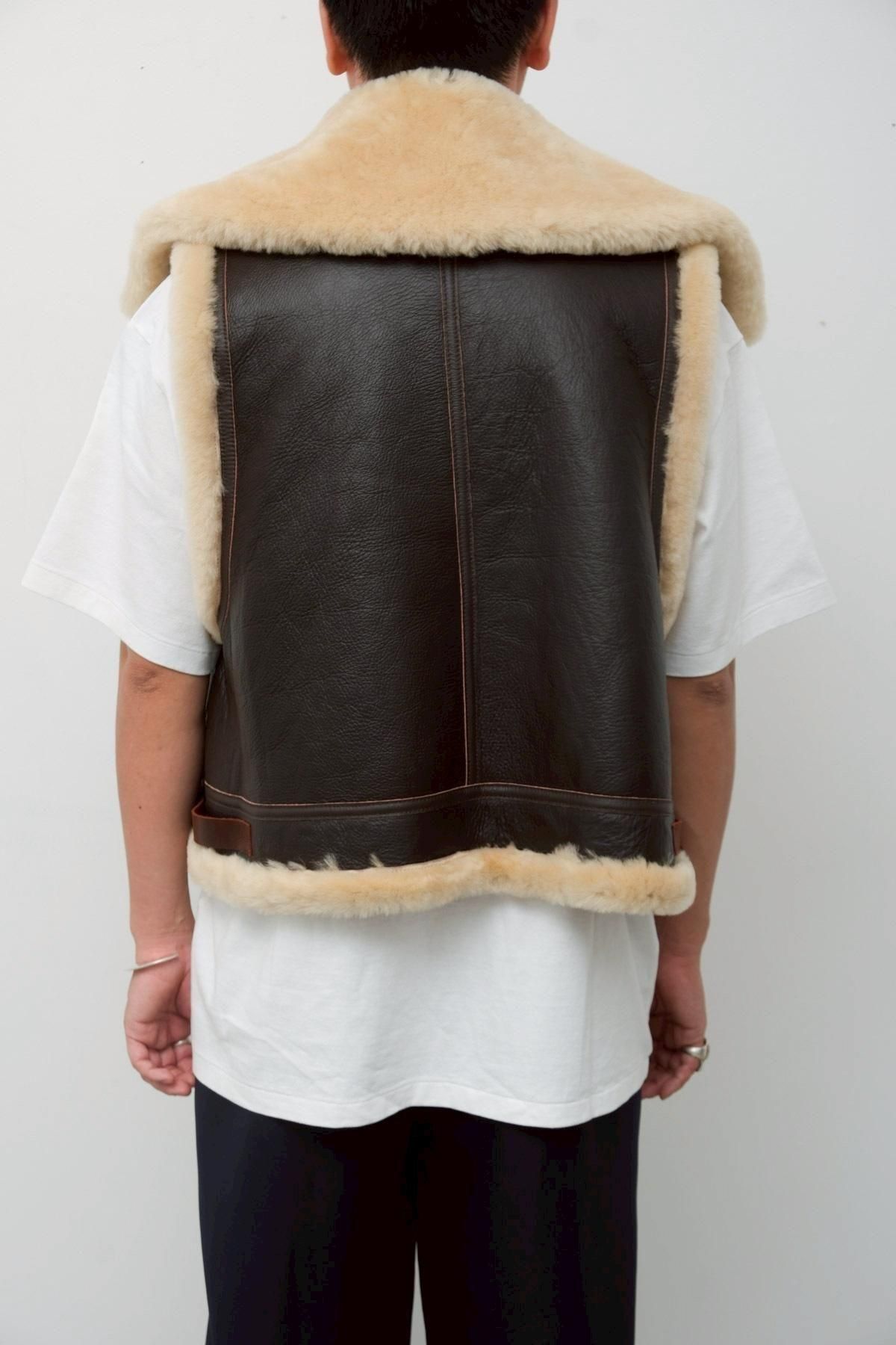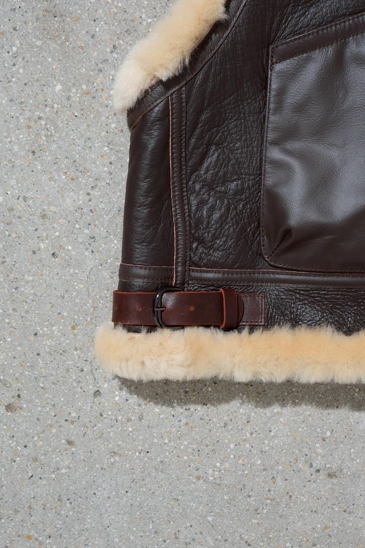 ボマージャケットの代表格として名⾼いType B-3ジャケットをソースに《RHODOLIRION》らしいデフォルメを効かせたムートンベスト。⽑⾜の⻑いムートンを使⽤したデザインが最⼤の特徴で、ヘヴィデューティな⾒た⽬とバツグンの保温⼒を誇る⾸廻りを保護する⼤きな襟や、ウエストのアジャスターベルト、右⾝頃にひとつだけついたパッチポケットなど、デザイン性にも富んだ完成度の⾼いモデルとなっています。アウターの上からでも着用できるアームホールの⼤きさで、様々なレイヤリングコーディネイトが楽しめます。