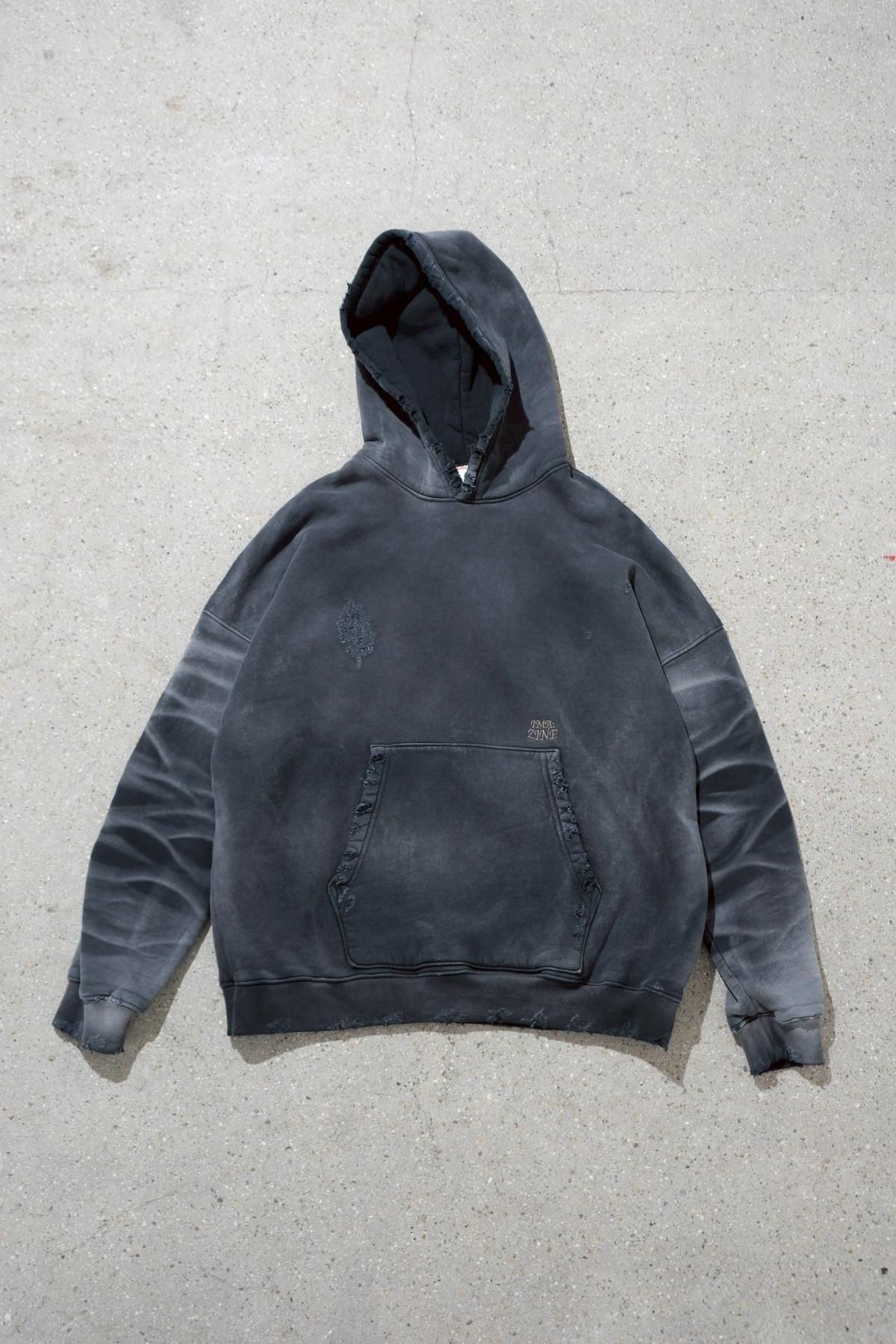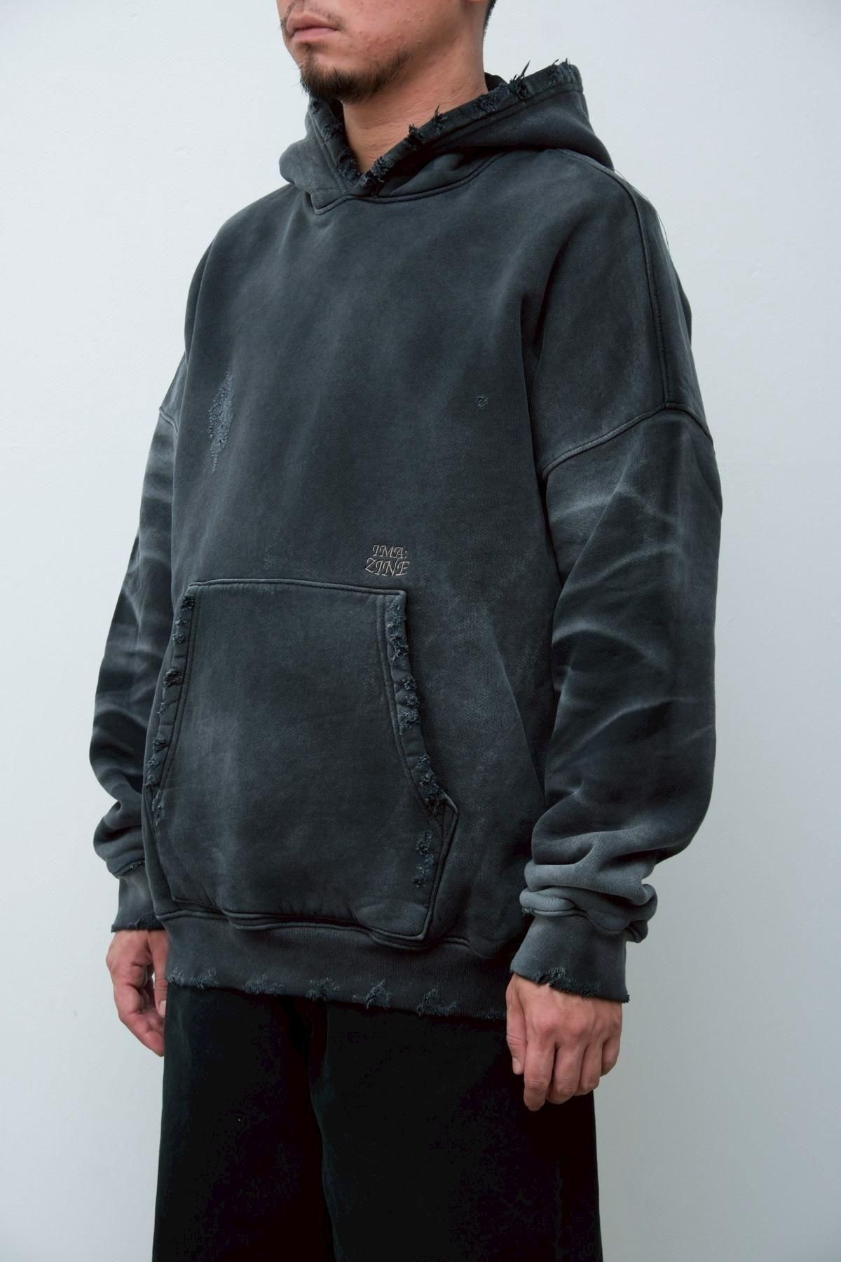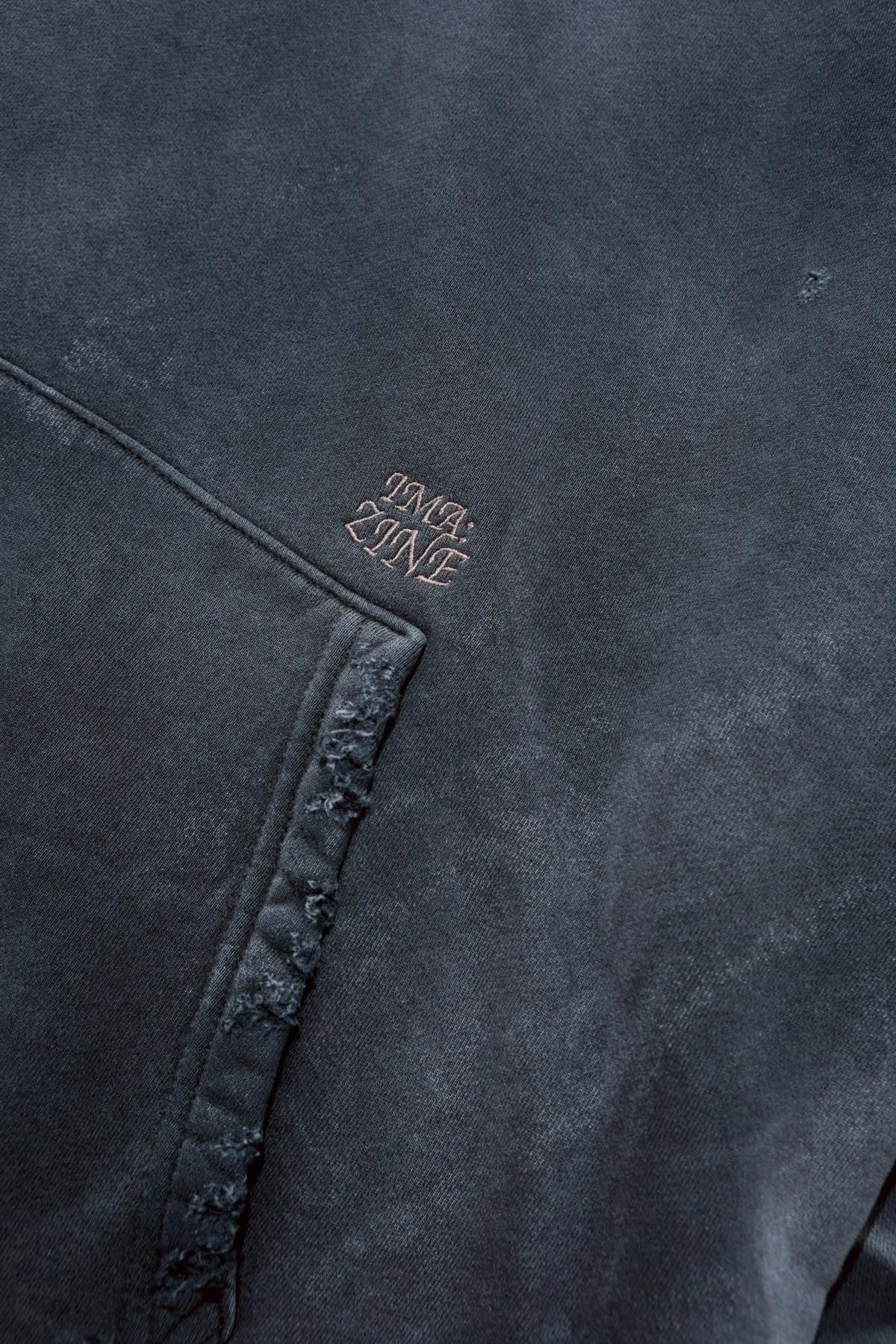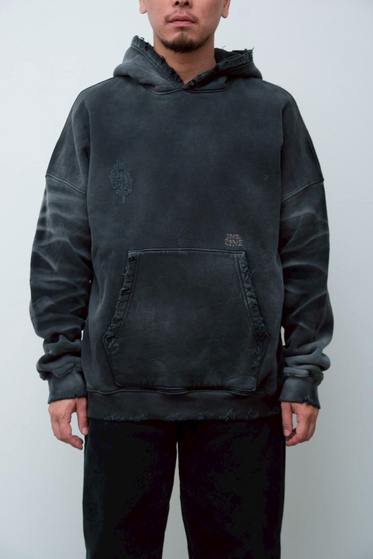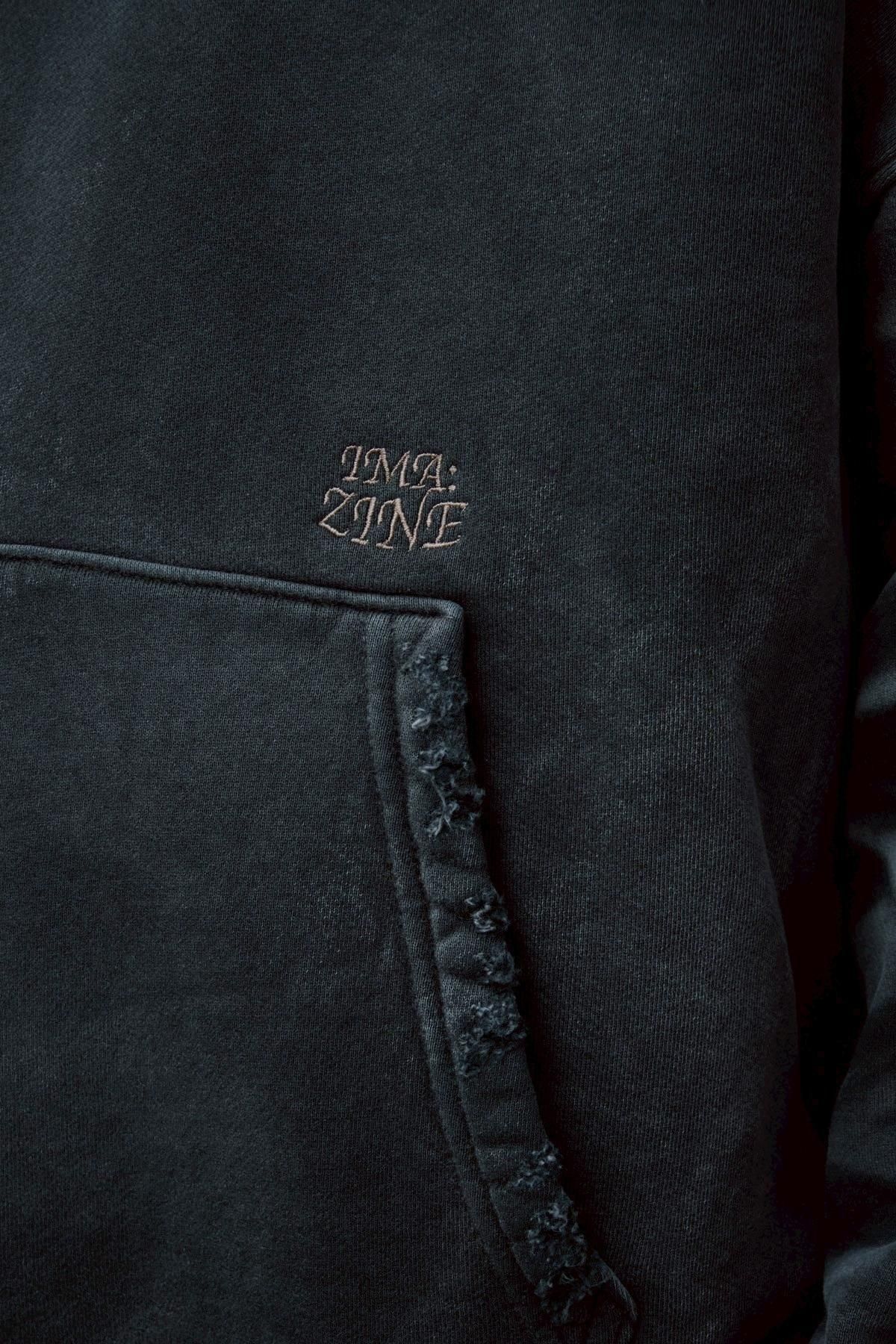 OVERSIZED CROP HOODIE AGEDをベースにハードなダメージ加工を施した日本未発売モデル、OVERSIZED CROP HOODIE IN WISKER。それをキャンバスに、ボディと同色でサイレントにIMA:ZINEのカレッジ風ロゴ刺繍を施したIMA:ZINEエクスクルーシヴです。デザイン性の高い、またクセのあるモノ。美しいシルエットのスラックスやトラウザーズとも好相性な汎用性の高い逸品です。BALCK、SAGE、NAVYの3色がラインナップ。