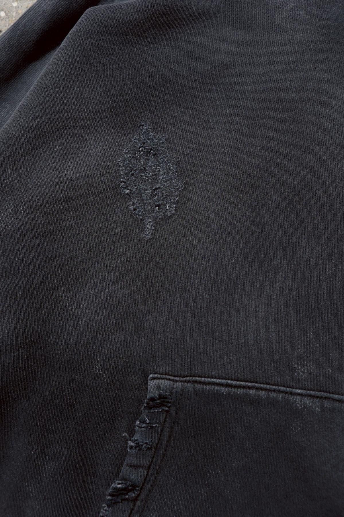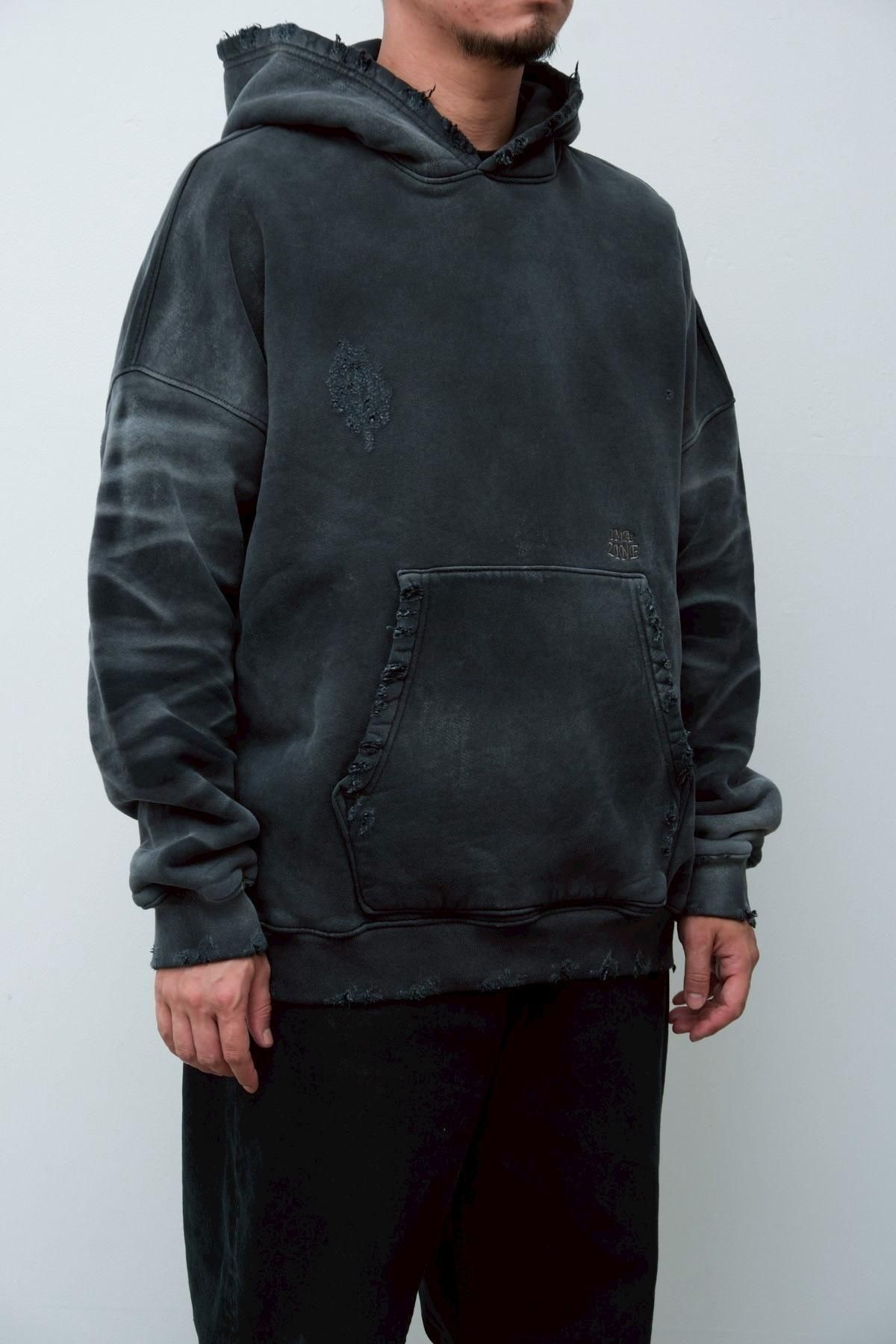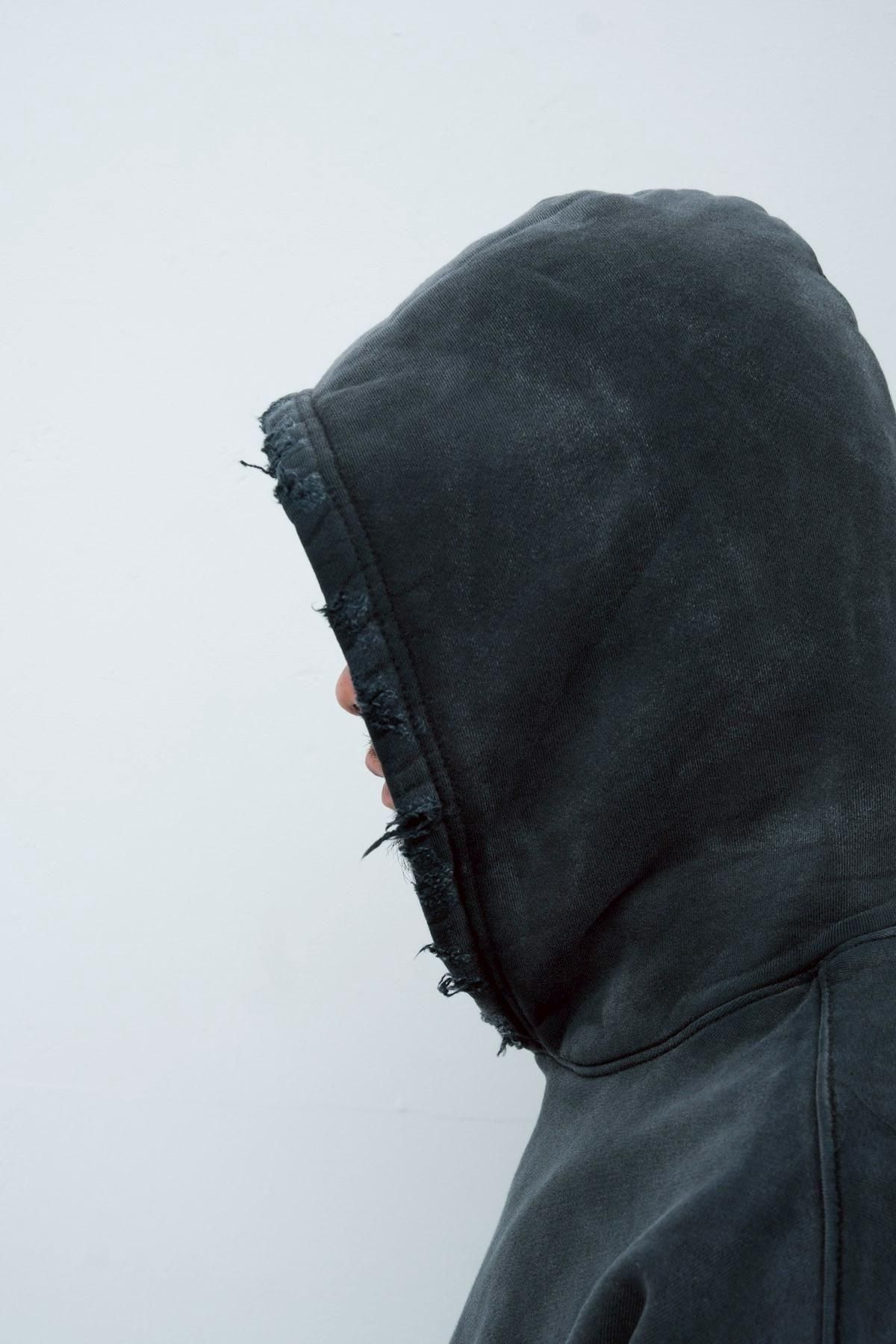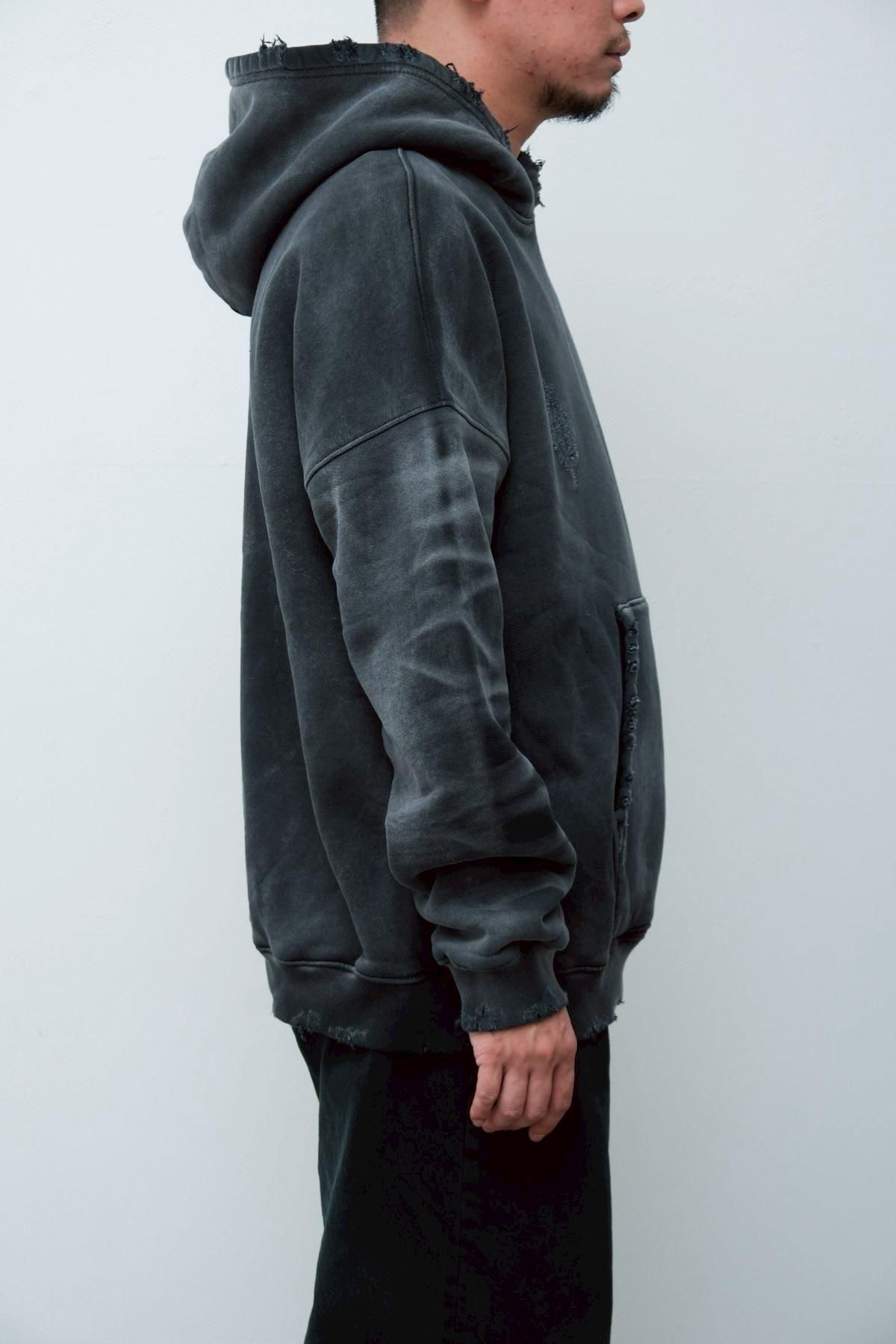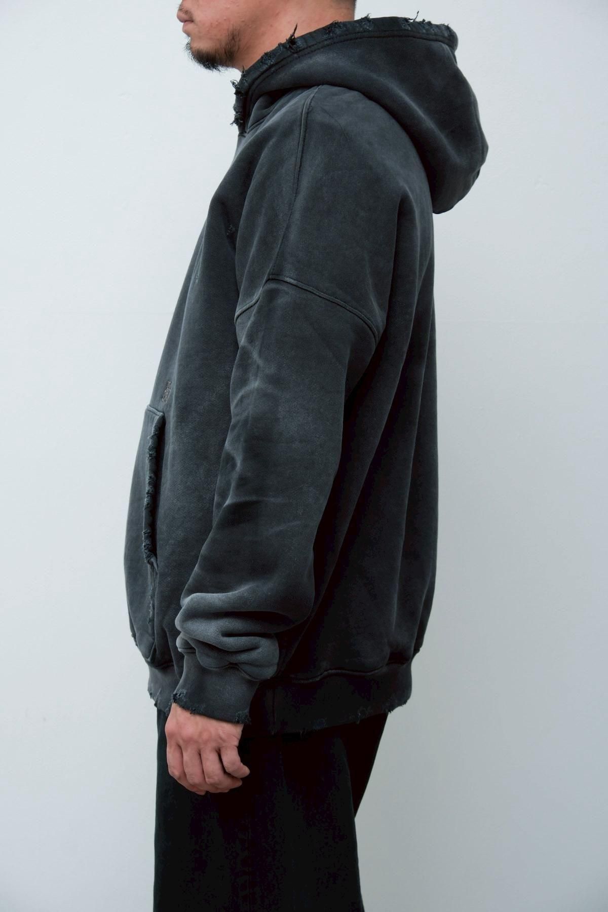OVERSIZED CROP HOODIE AGEDをベースにハードなダメージ加工を施した日本未発売モデル、OVERSIZED CROP HOODIE IN WISKER。それをキャンバスに、ボディと同色でサイレントにIMA:ZINEのカレッジ風ロゴ刺繍を施したIMA:ZINEエクスクルーシヴです。デザイン性の高い、またクセのあるモノ。美しいシルエットのスラックスやトラウザーズとも好相性な汎用性の高い逸品です。BALCK、SAGE、NAVYの3色がラインナップ。