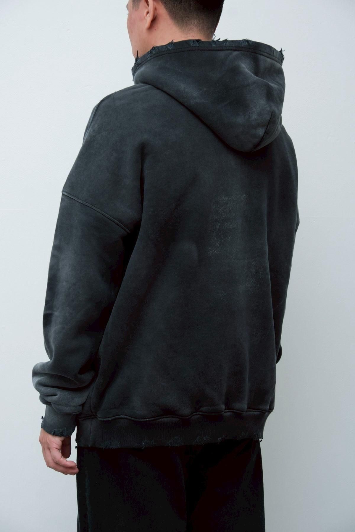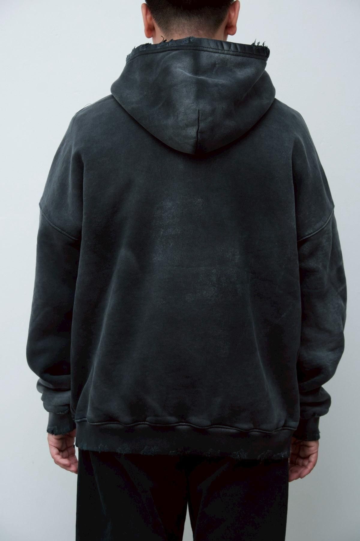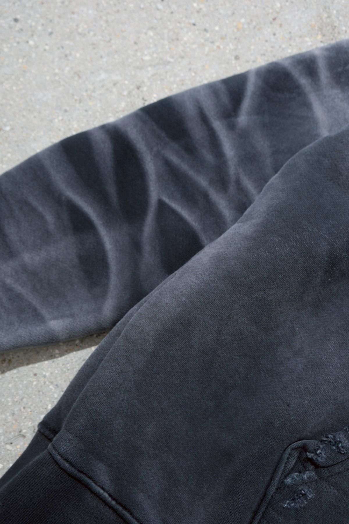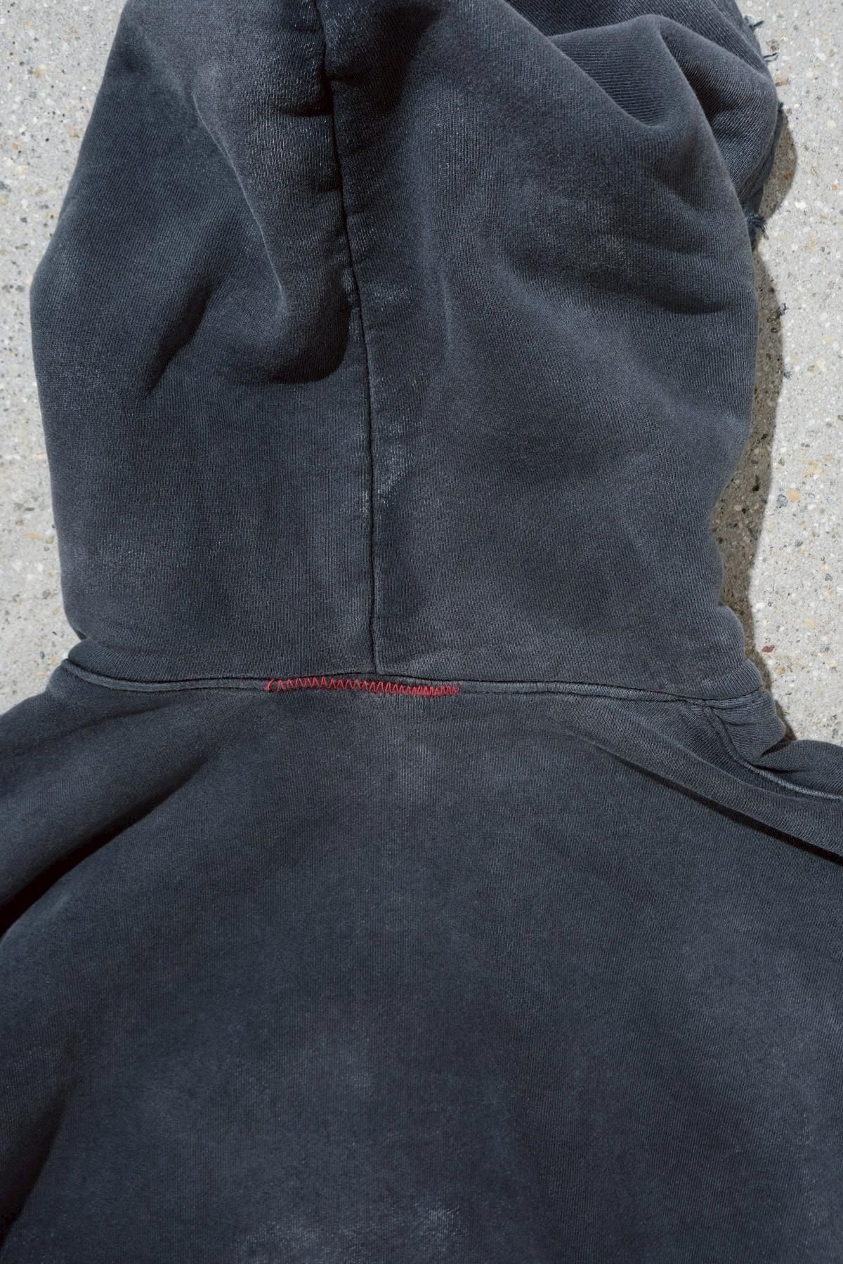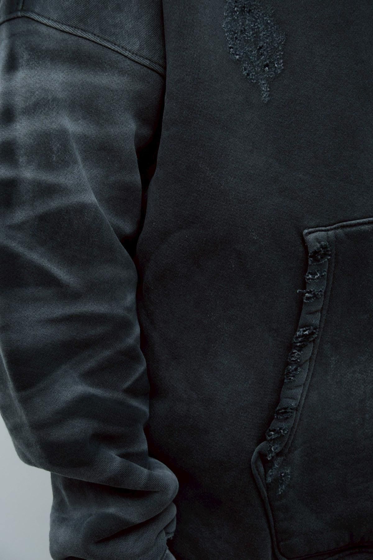 OVERSIZED CROP HOODIE AGEDをベースにハードなダメージ加工を施した日本未発売モデル、OVERSIZED CROP HOODIE IN WISKER。それをキャンバスに、ボディと同色でサイレントにIMA:ZINEのカレッジ風ロゴ刺繍を施したIMA:ZINEエクスクルーシヴです。デザイン性の高い、またクセのあるモノ。美しいシルエットのスラックスやトラウザーズとも好相性な汎用性の高い逸品です。BALCK、SAGE、NAVYの3色がラインナップ。