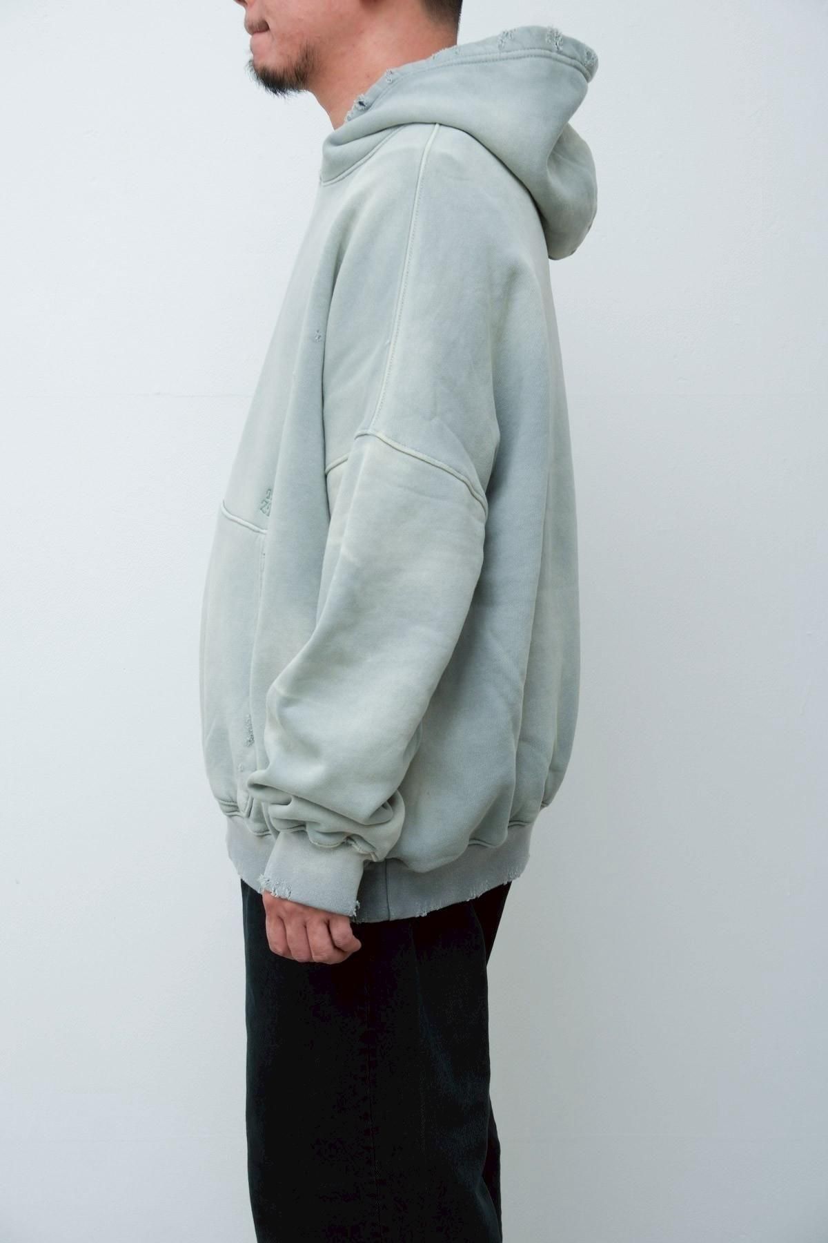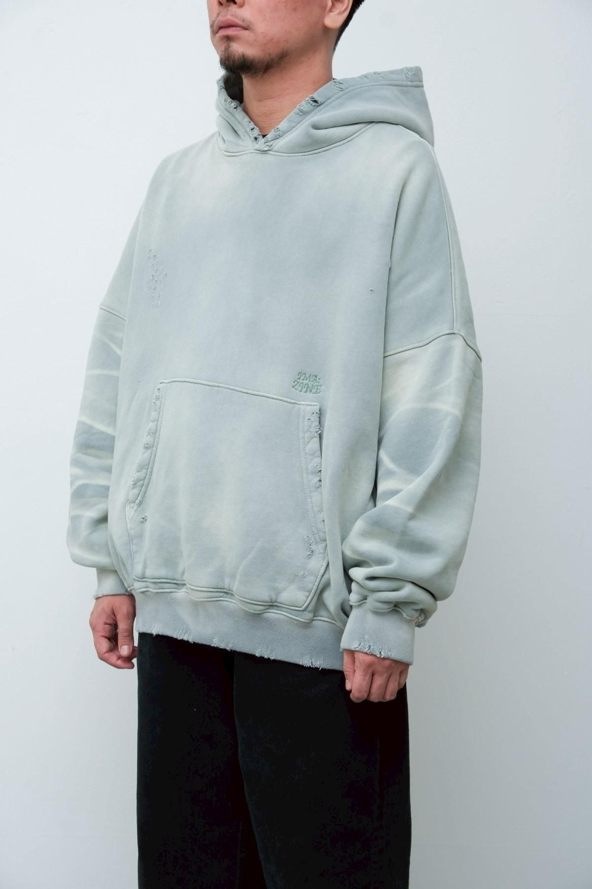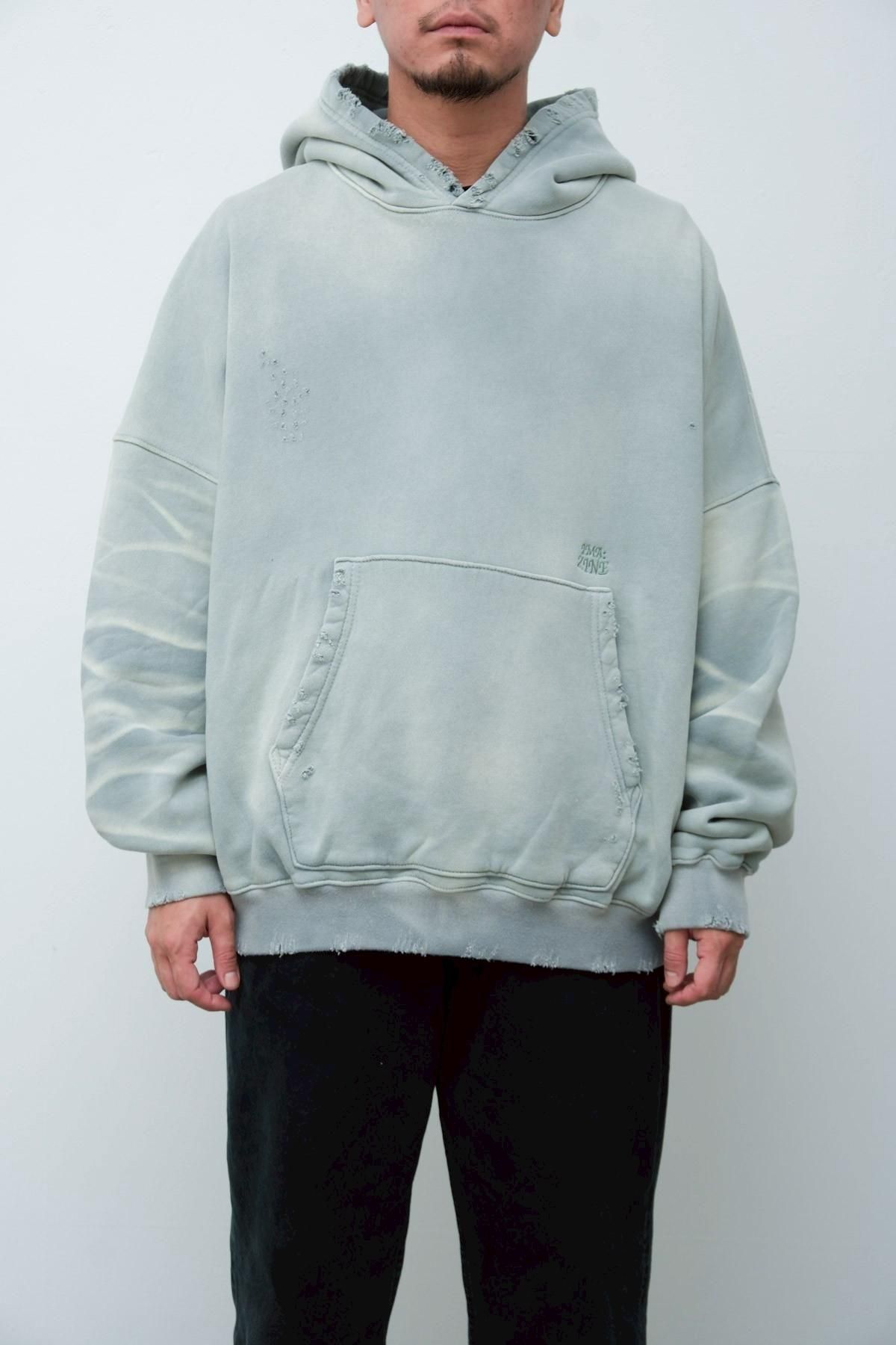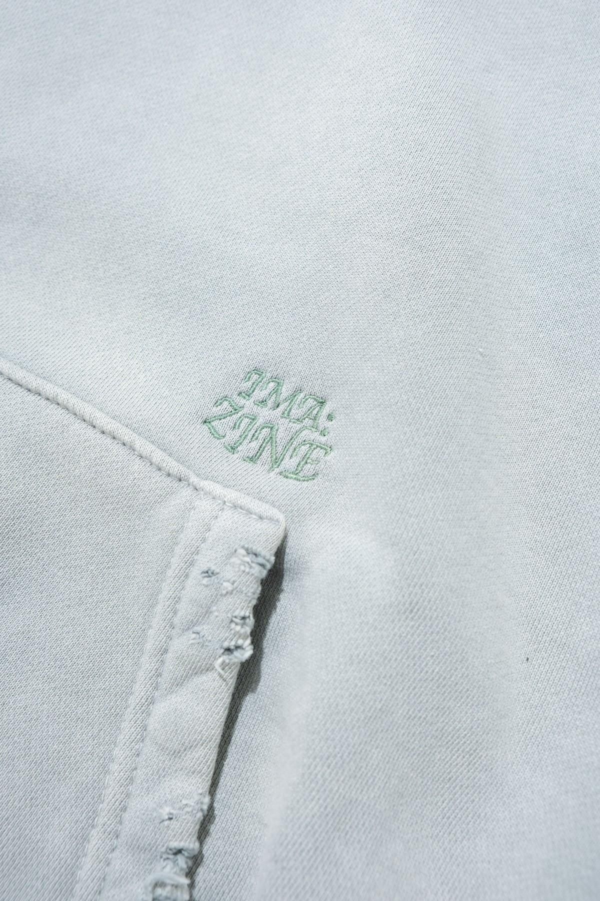 OVERSIZED CROP HOODIE AGEDをベースにハードなダメージ加工を施した日本未発売モデル、OVERSIZED CROP HOODIE IN WISKER。それをキャンバスに、ボディと同色でサイレントにIMA:ZINEのカレッジ風ロゴ刺繍を施したIMA:ZINEエクスクルーシヴです。デザイン性の高い、またクセのあるモノ。美しいシルエットのスラックスやトラウザーズとも好相性な汎用性の高い逸品です。BALCK、SAGE、NAVYの3色がラインナップ。