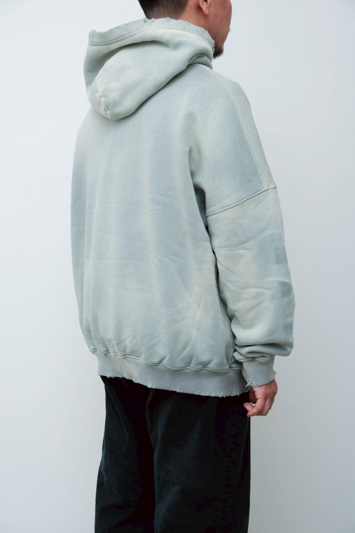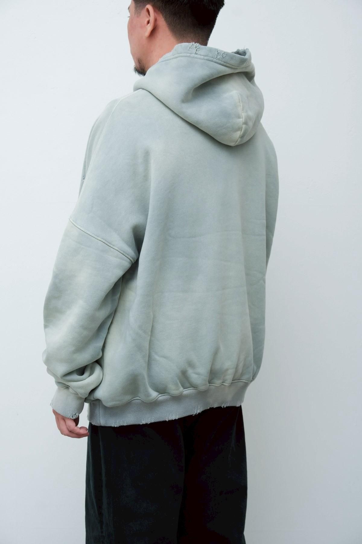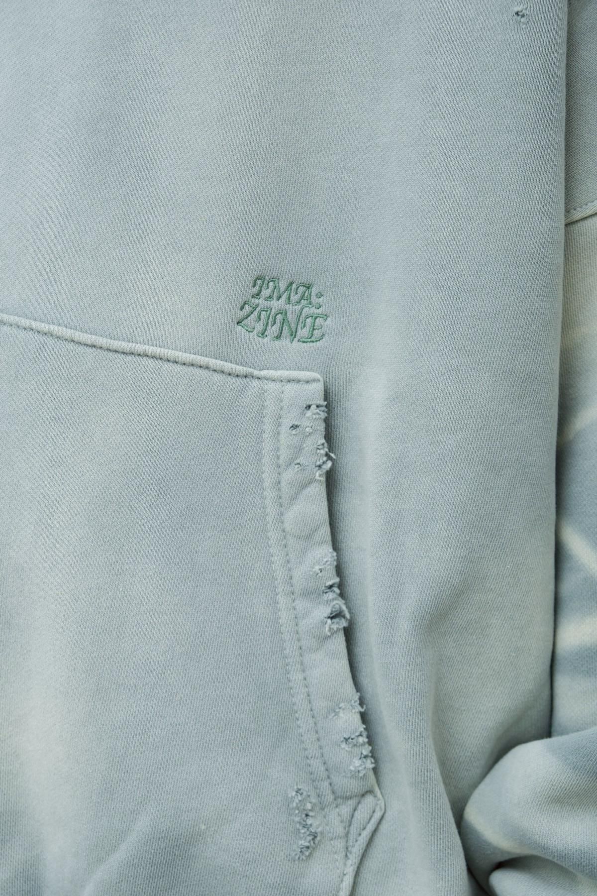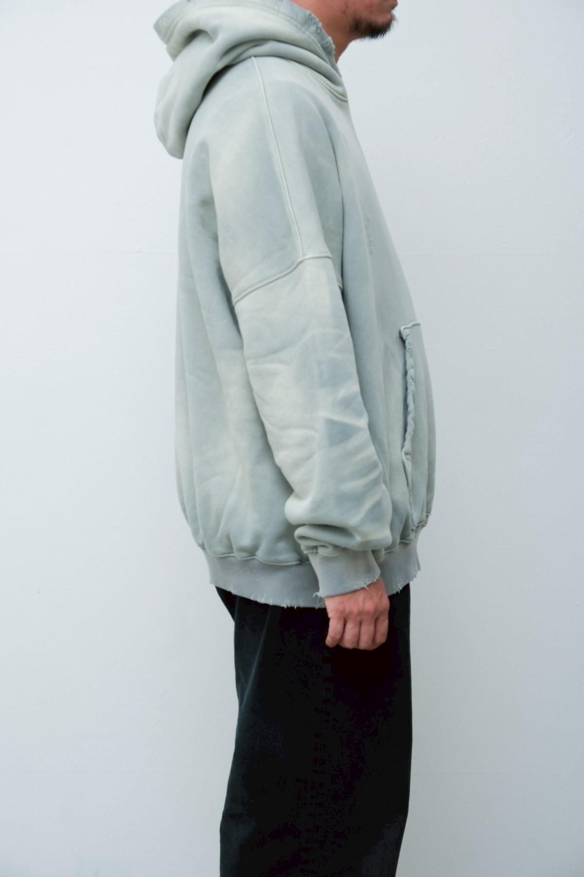 OVERSIZED CROP HOODIE AGEDをベースにハードなダメージ加工を施した日本未発売モデル、OVERSIZED CROP HOODIE IN WISKER。それをキャンバスに、ボディと同色でサイレントにIMA:ZINEのカレッジ風ロゴ刺繍を施したIMA:ZINEエクスクルーシヴです。デザイン性の高い、またクセのあるモノ。美しいシルエットのスラックスやトラウザーズとも好相性な汎用性の高い逸品です。BALCK、SAGE、NAVYの3色がラインナップ。