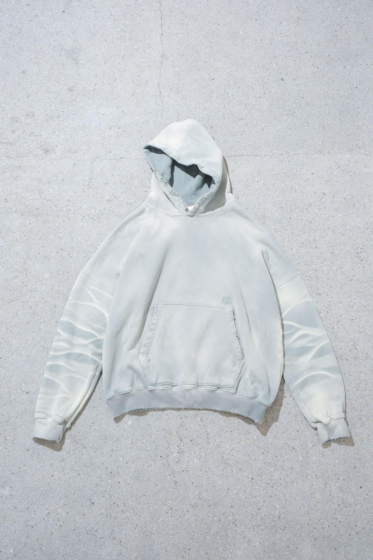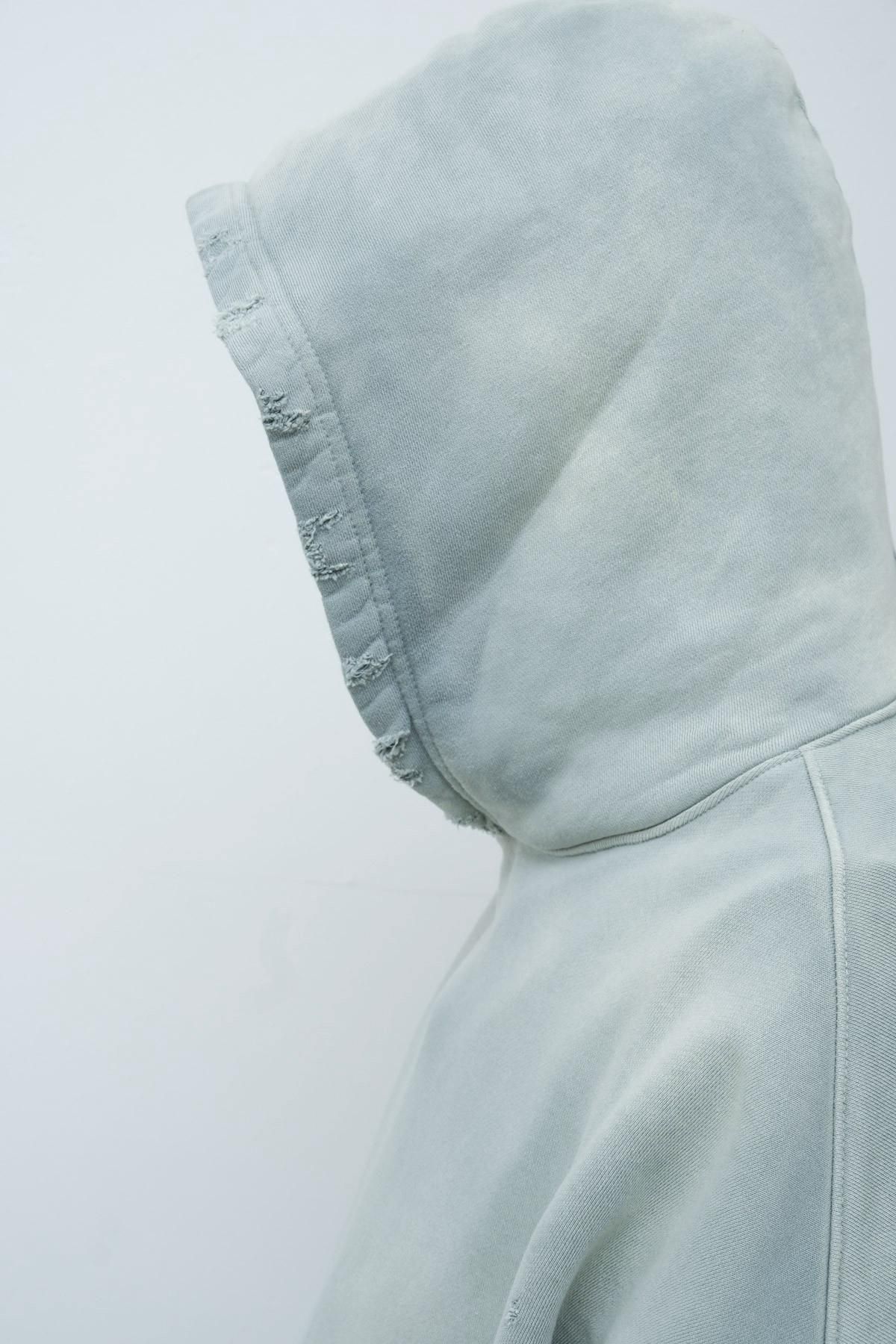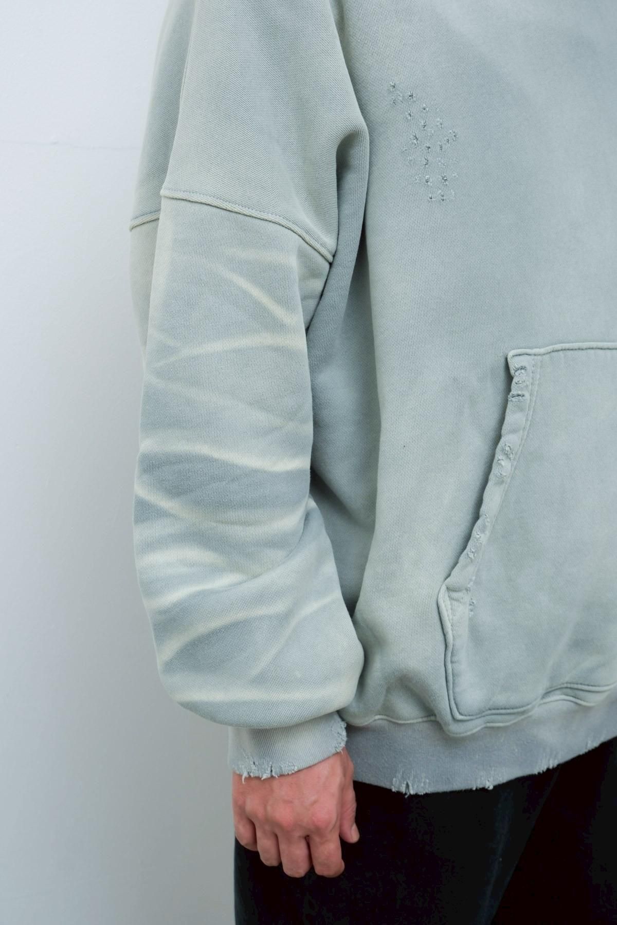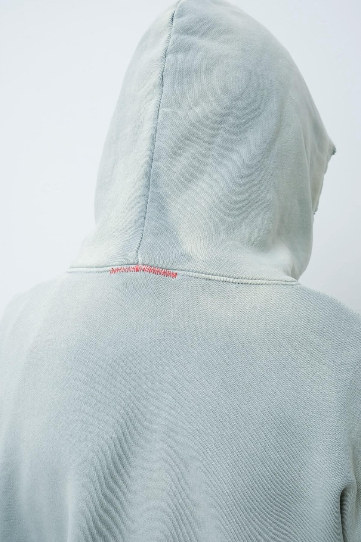 OVERSIZED CROP HOODIE AGEDをベースにハードなダメージ加工を施した日本未発売モデル、OVERSIZED CROP HOODIE IN WISKER。それをキャンバスに、ボディと同色でサイレントにIMA:ZINEのカレッジ風ロゴ刺繍を施したIMA:ZINEエクスクルーシヴです。デザイン性の高い、またクセのあるモノ。美しいシルエットのスラックスやトラウザーズとも好相性な汎用性の高い逸品です。BALCK、SAGE、NAVYの3色がラインナップ。
