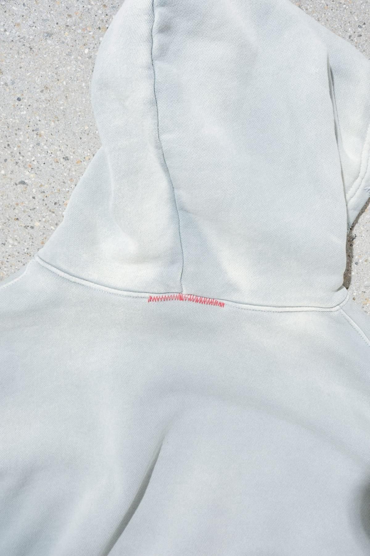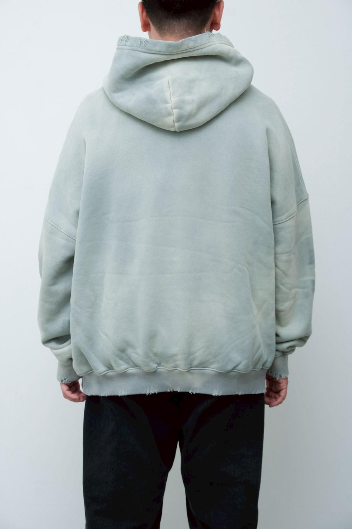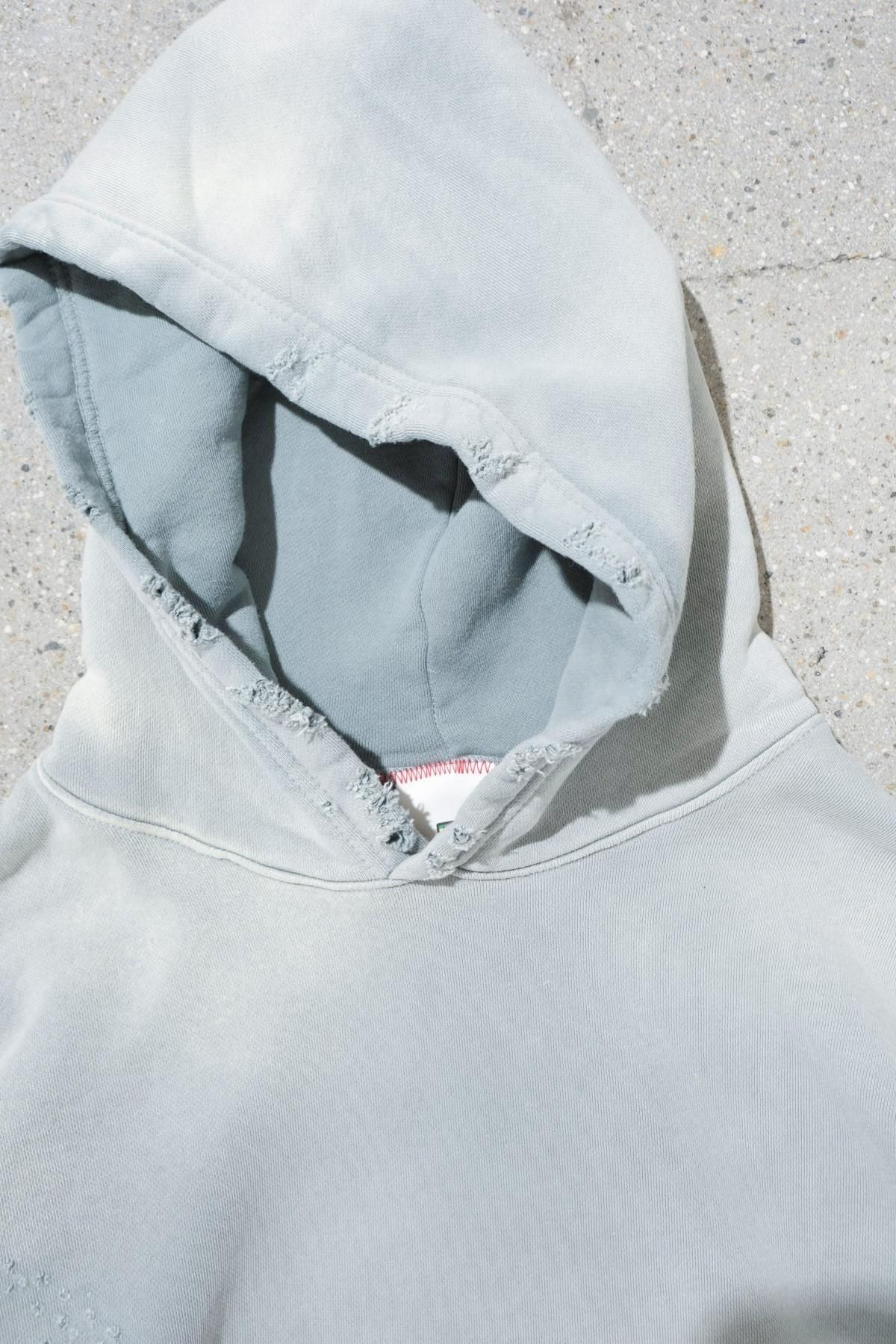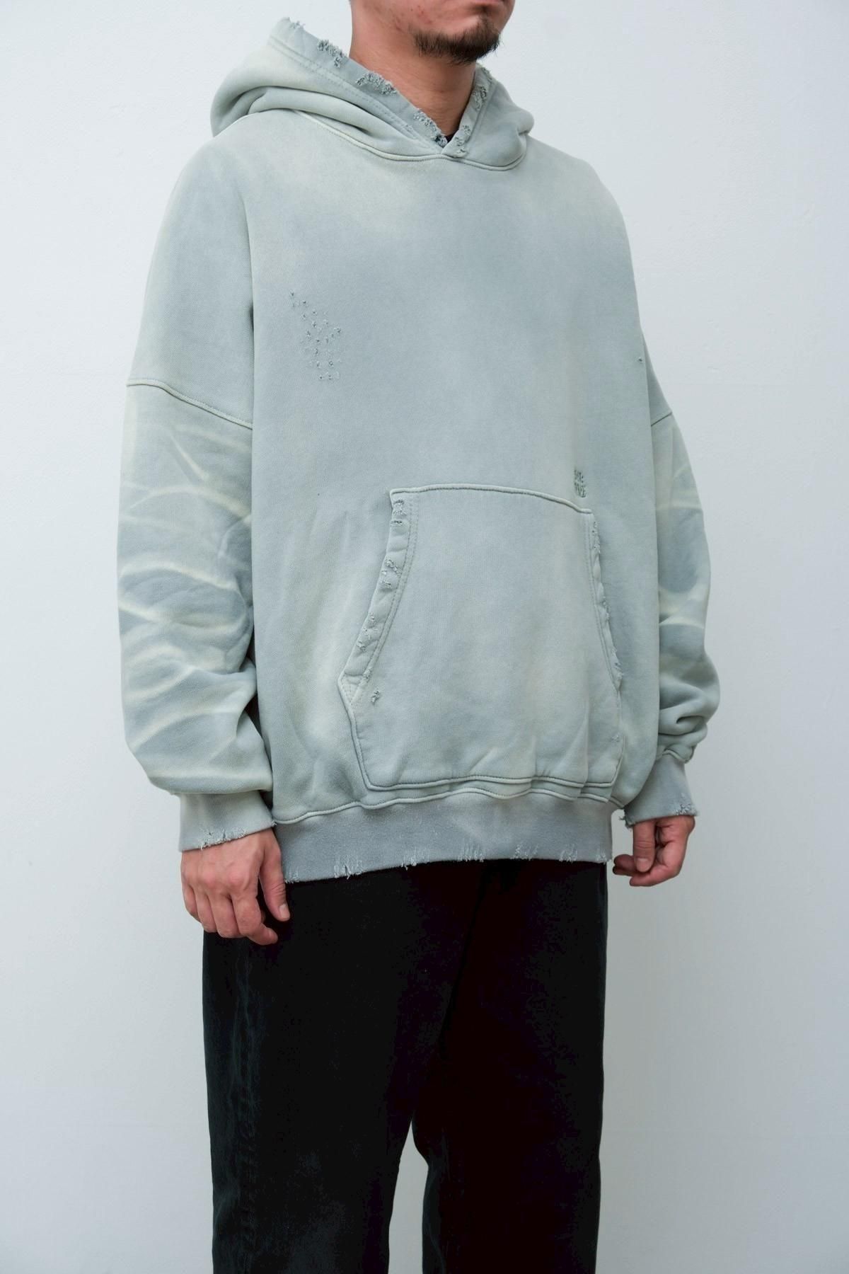 OVERSIZED CROP HOODIE AGEDをベースにハードなダメージ加工を施した日本未発売モデル、OVERSIZED CROP HOODIE IN WISKER。それをキャンバスに、ボディと同色でサイレントにIMA:ZINEのカレッジ風ロゴ刺繍を施したIMA:ZINEエクスクルーシヴです。デザイン性の高い、またクセのあるモノ。美しいシルエットのスラックスやトラウザーズとも好相性な汎用性の高い逸品です。BALCK、SAGE、NAVYの3色がラインナップ。
