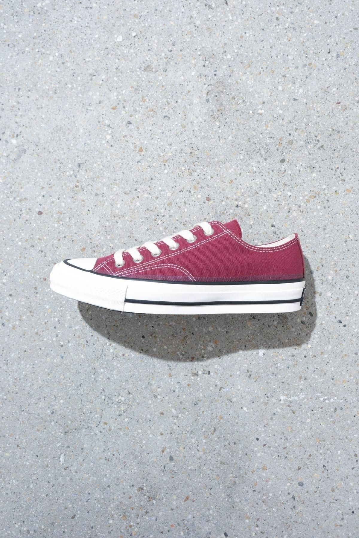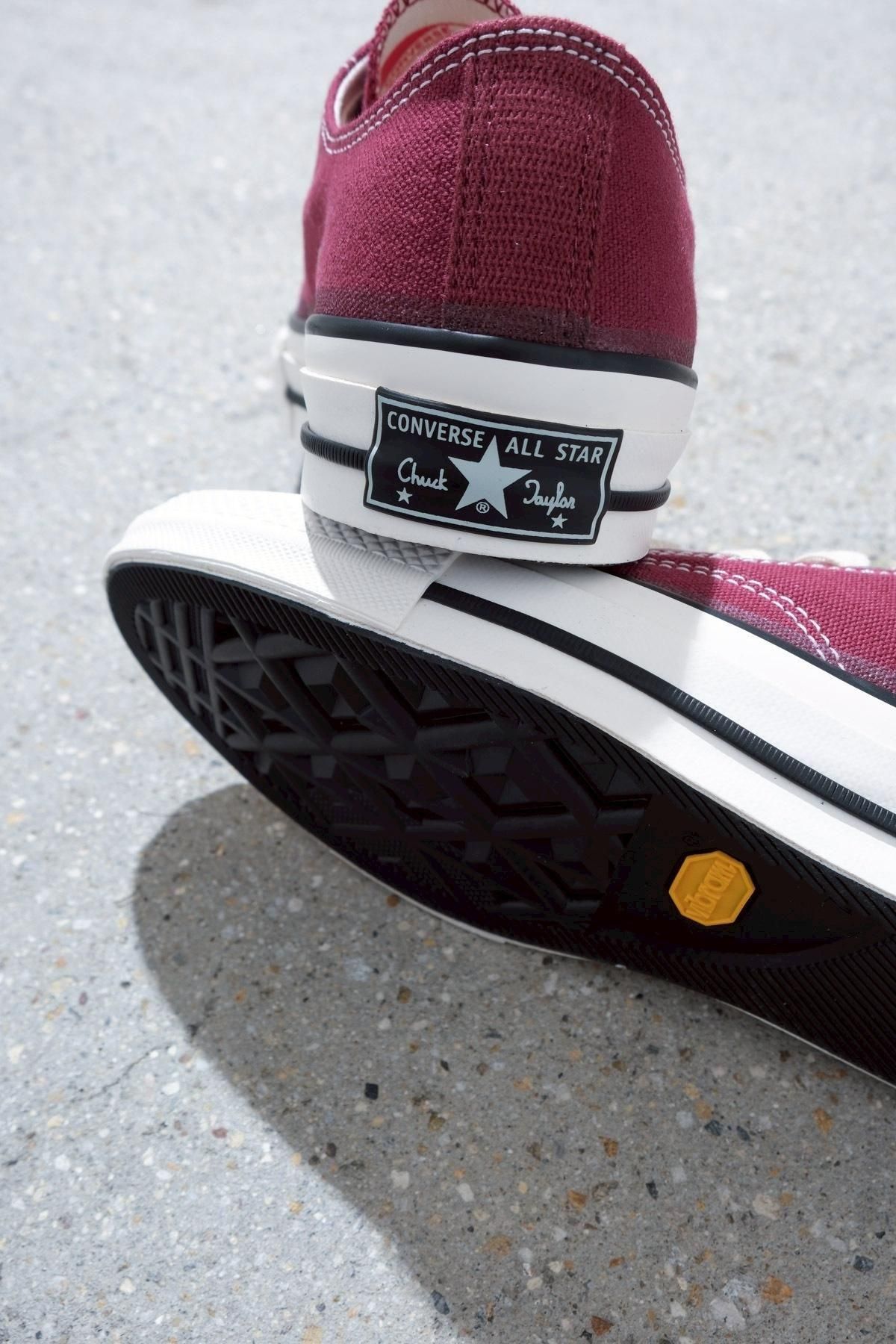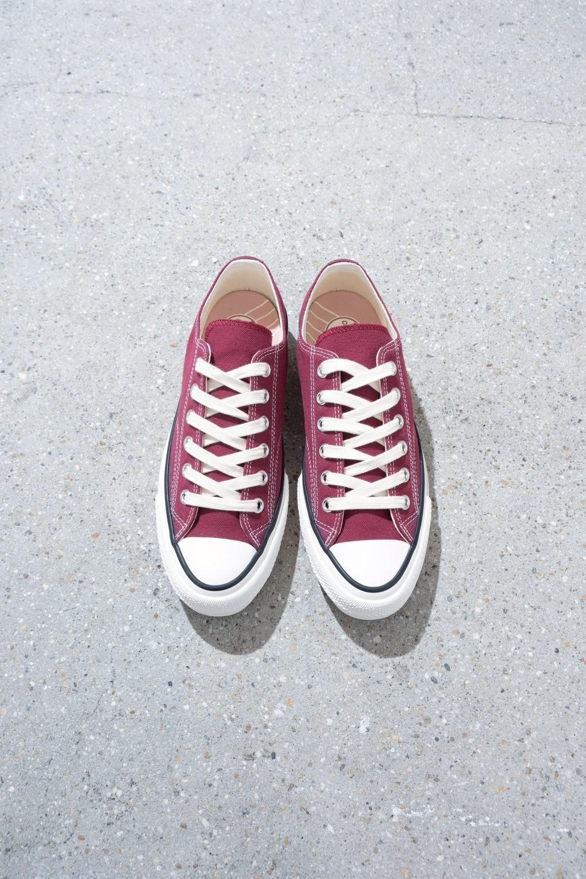 CONVERSE ADDICTの2025 HOLIDAY COLLECTION。ヴィンテージ市場でも人気の高い、深みのあるレッドカラー「マルーン」を採用。アッパーには国産シャトル織り機で紡いだ風合い豊かなキャンバスを使用。1960年代のALL STARに見られる三ツ星ヒールラベルやサイドステッチ、ソールの糊のはみ出しなど当時のディテールを再現。クッション性に優れたE.V.A.と「PORON®」の2重構造に加え、安定した歩行をサポートするTPUシャンクを組み合わせたカップインソール、防滑性と耐摩耗性に優れ全天候に対応した「HIGH PERFORMANCE RUBBER COMPOUND」の「VIBRAM® MEGAGRIP」ソールなど、ハイスペックな機能を搭載し快適な履き心地を実現。