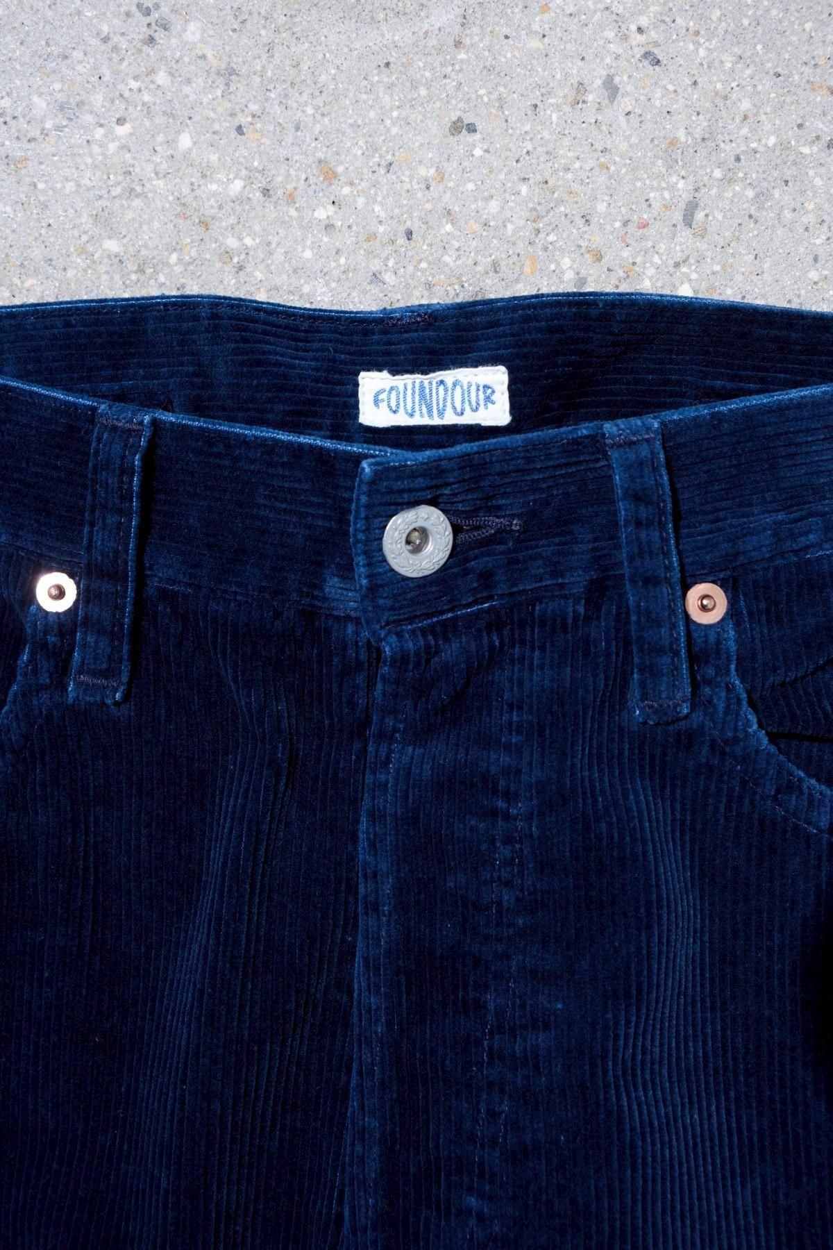 通称“37 モデル”と呼ばれる、美しいラインのヴィンテージデニムがあります。腰回りにゆとりがあり、膝下からストレートに落ちるシルエットは、ジャストで穿いても、サイズを上げても綺麗にハマり、どこにも無駄が見当たりません。 《FOUNDOUR》では前回もそのパンツをリファレンスに、シンチバックや股下のリベットにもこだわって、普遍的なデニム地でアイテムを作成しましたが、今回はそのコーデュロイバージョン。太畝でボリュームのある生地を採用し、重厚感のあるアイテムになっています。丸みを帯びた柔らかなムードと、コーデュロイ特有の微光沢が品を与え、どこか高級感のある仕上がりになっていて気に入っています。共地でつくったトラッカージャケットも用意しているので、是非セットアップで試してみてください。もともとはワークウェアにも関わらず、その上品さゆえに、しっかりとファッションとして通じるアイテムになっています。(金子恵治)