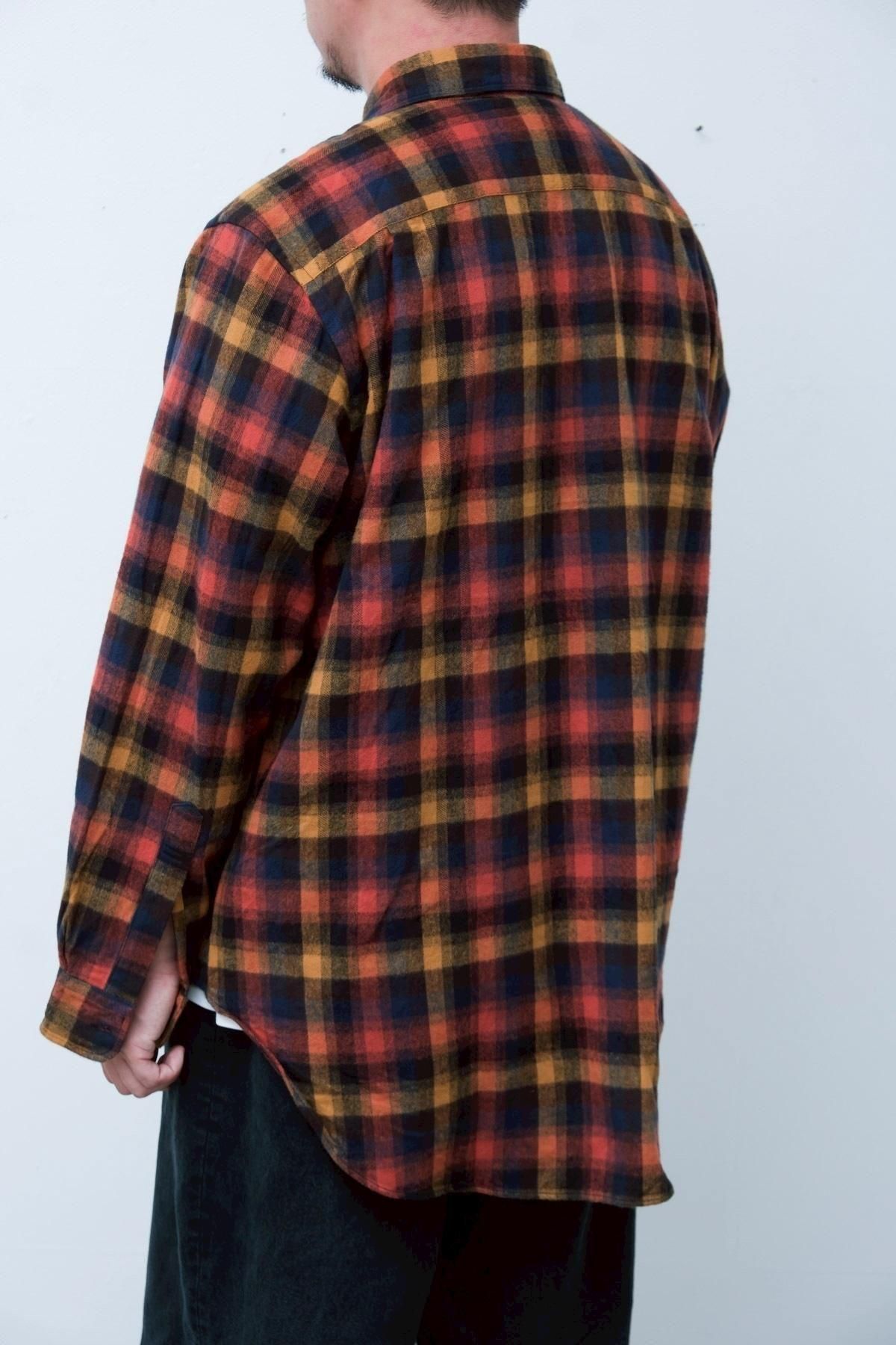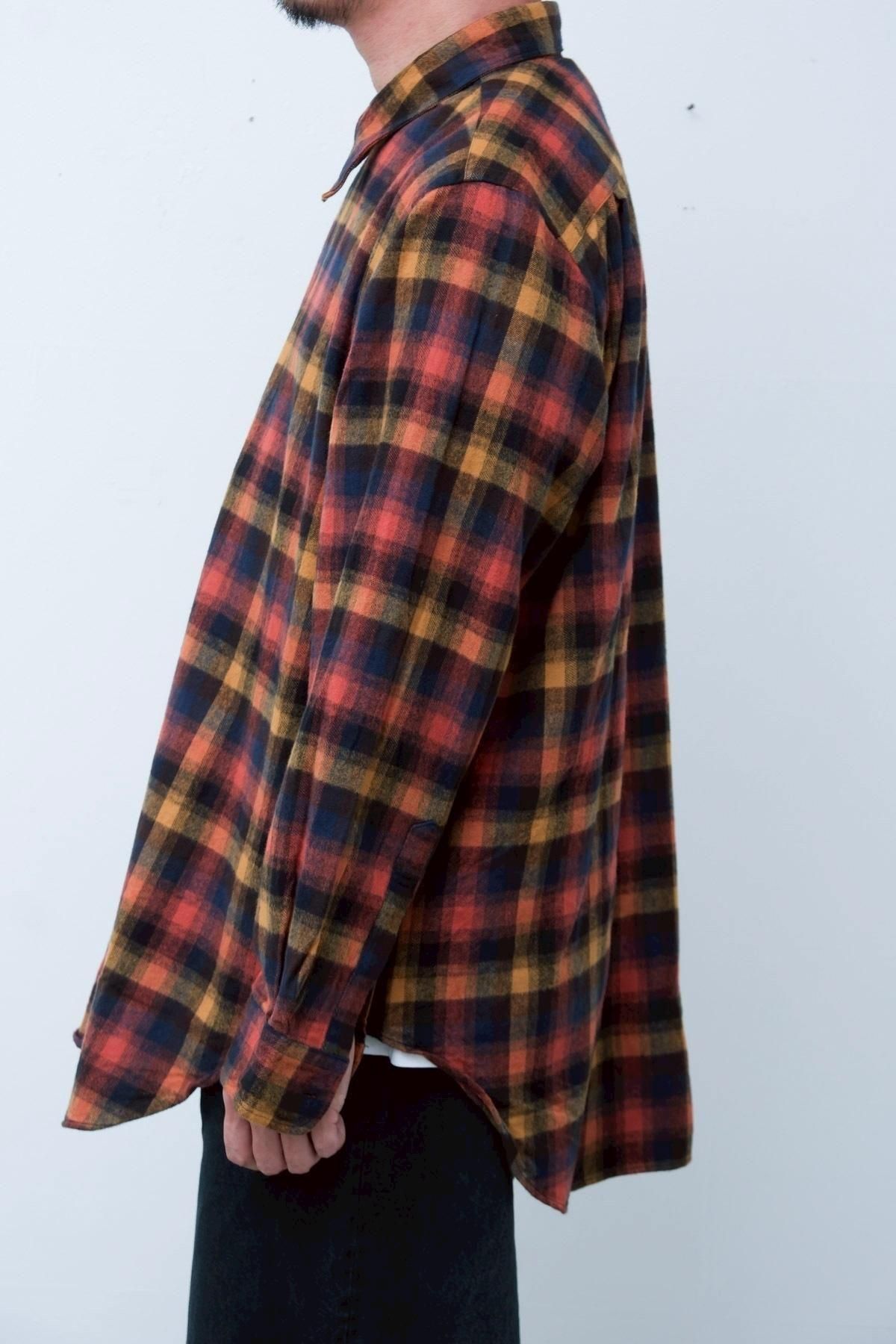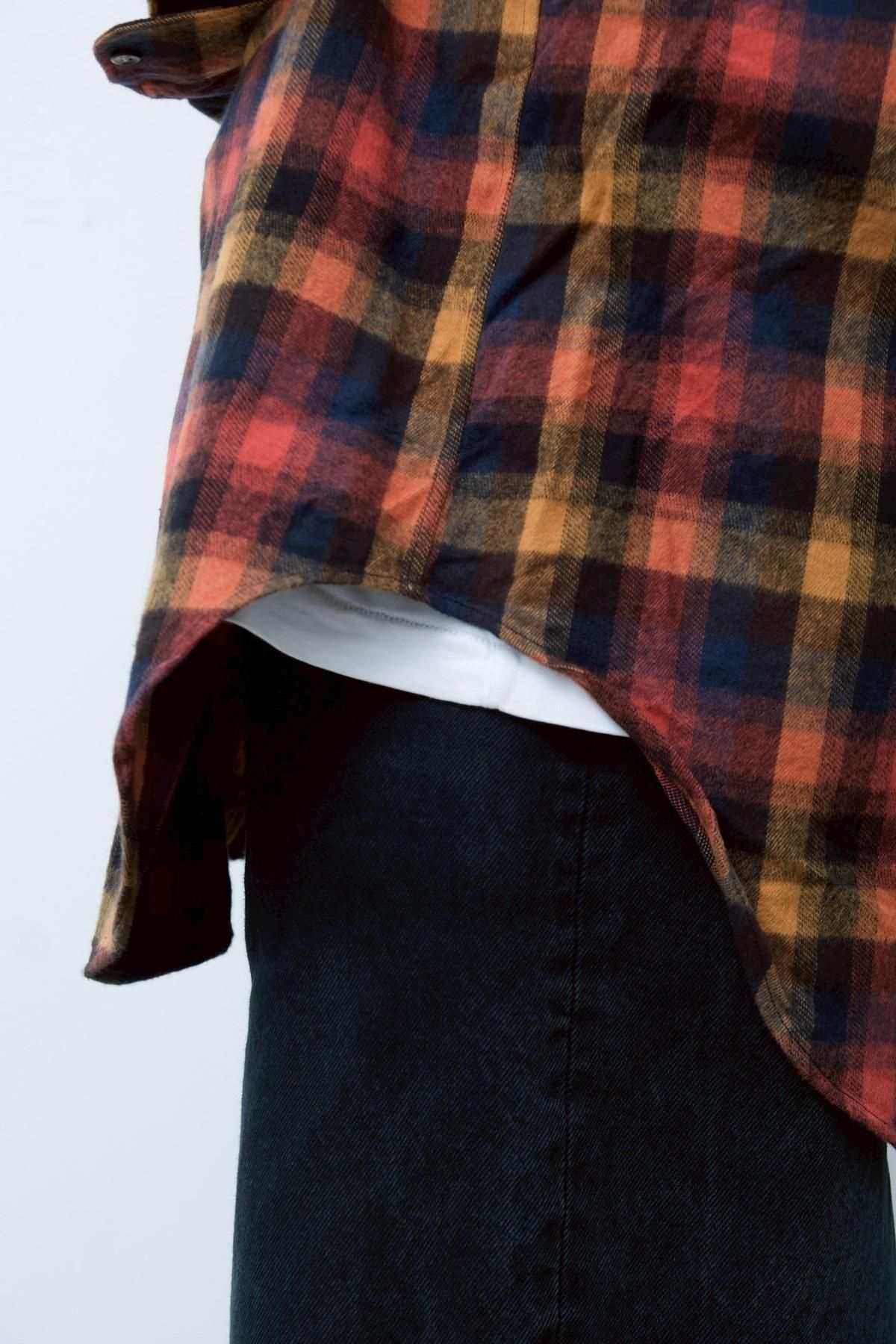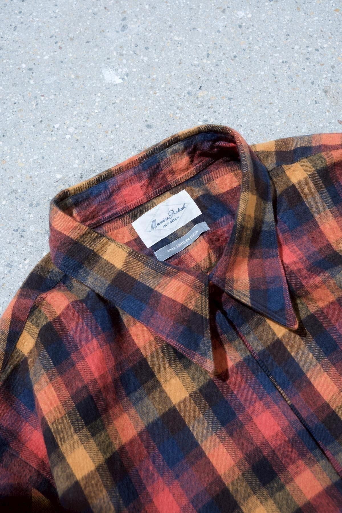 IMA:ZINE全スタッフが大好きなシャツブランド《Marvine Pontiak Shirt Makers》への今シーズンの別注は、誰もが一度は手にしたことのあるチェックシャツに着目しました。深めに入ったスリットが絶妙なヌケ感を醸し出す《Marvine Pontiak Shirt Makers》の定番、スキッパーシャツをベースに、今季展開されているオープンカラーシャツのオンブレチェック生地を使用。グラデーションしているかのようなイエローとレッドのコンビネーションがスタイルを彩ります。縦縞と横縞の交差によってできるチェック柄のように、《Marvine Pontiak Shirt Makers》とIMA:ZINEが交わることでできた最高峰のカジュアルシャツ。コンフォートフィットな1サイズ展開です。