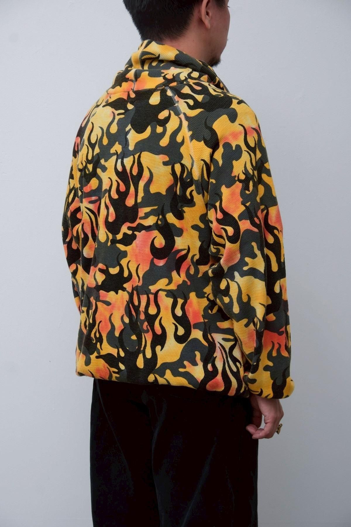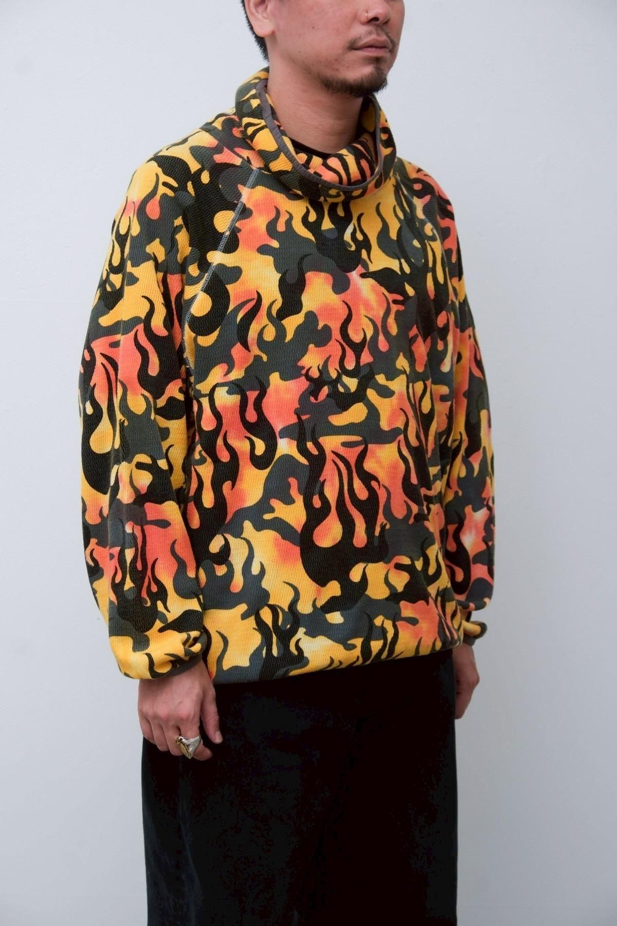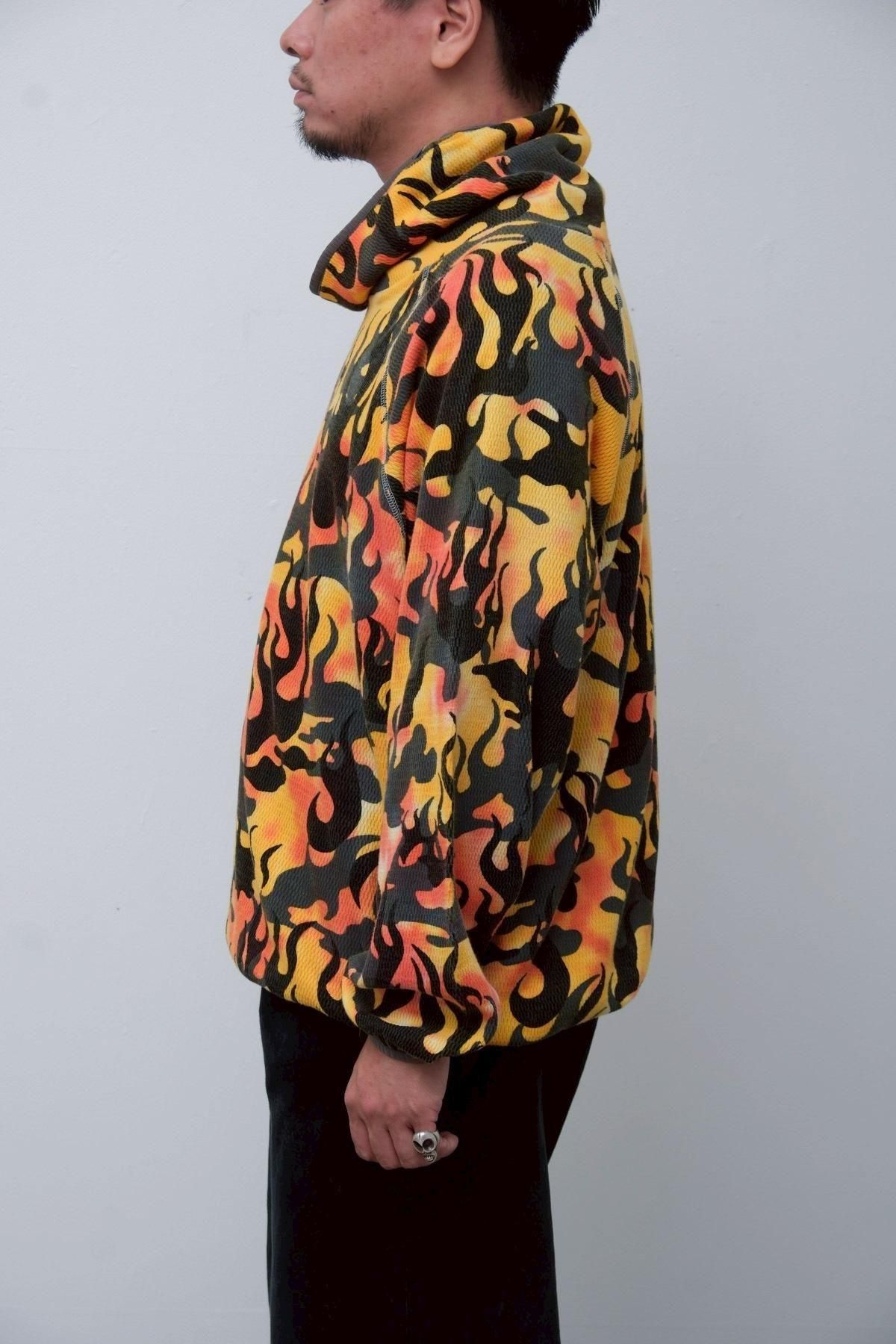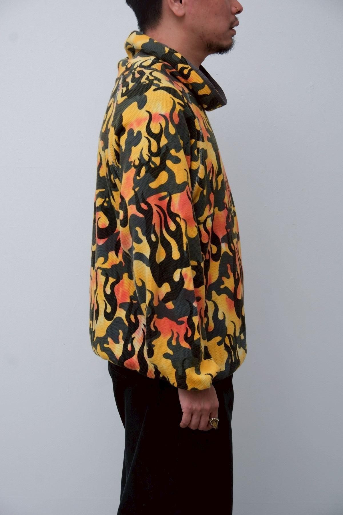 ファイヤーパターンをモチーフに、オリジナルカモのサーマル生地を使用したタートルネック。ベースカラーをメラメラと燃え盛るようなオレンジ×イエローに別注したIMA:ZINEエクスクルーシヴ。アウトドアギアをモチーフに、ボリュームのあるタートルネック部分にはイヤーフラップを付け、耳に引っ掛けることでマスクとしても着用して頂けます。顔の半分を覆い隠すような、存在感抜群のボリューム感を楽しめます。エッジ部分はリブではなくパイピング処理されており、膨らみのあるフォルムに形成。職人の手によって染められたタイダイ柄は、ファイヤーパターンにさらなる力強さを加え、ファッションの楽しさを表現しています。