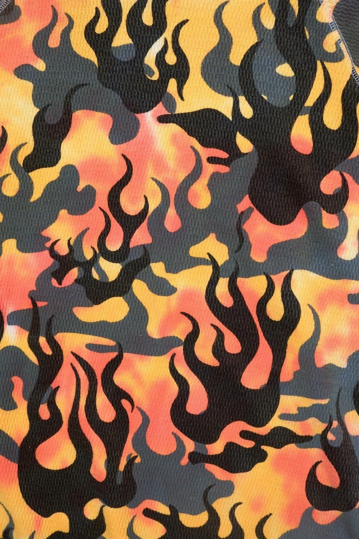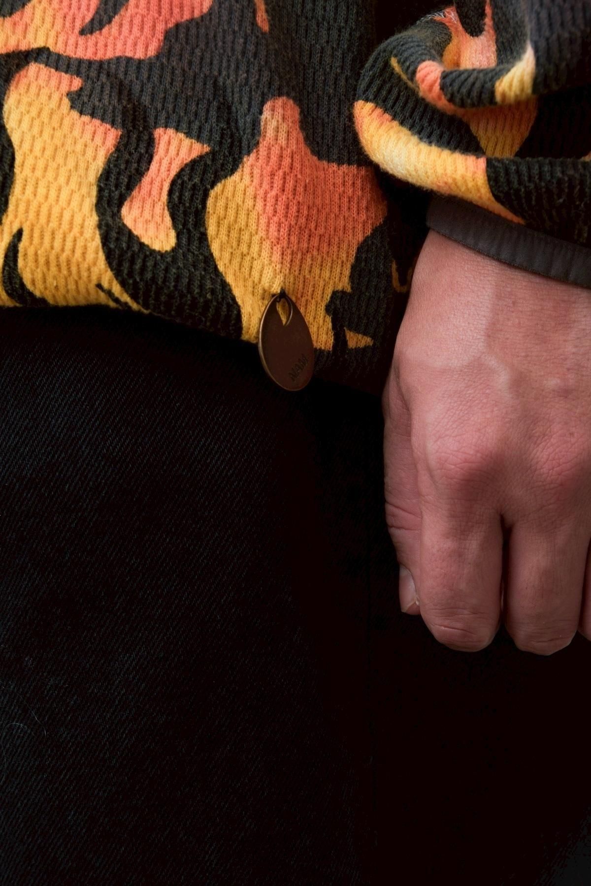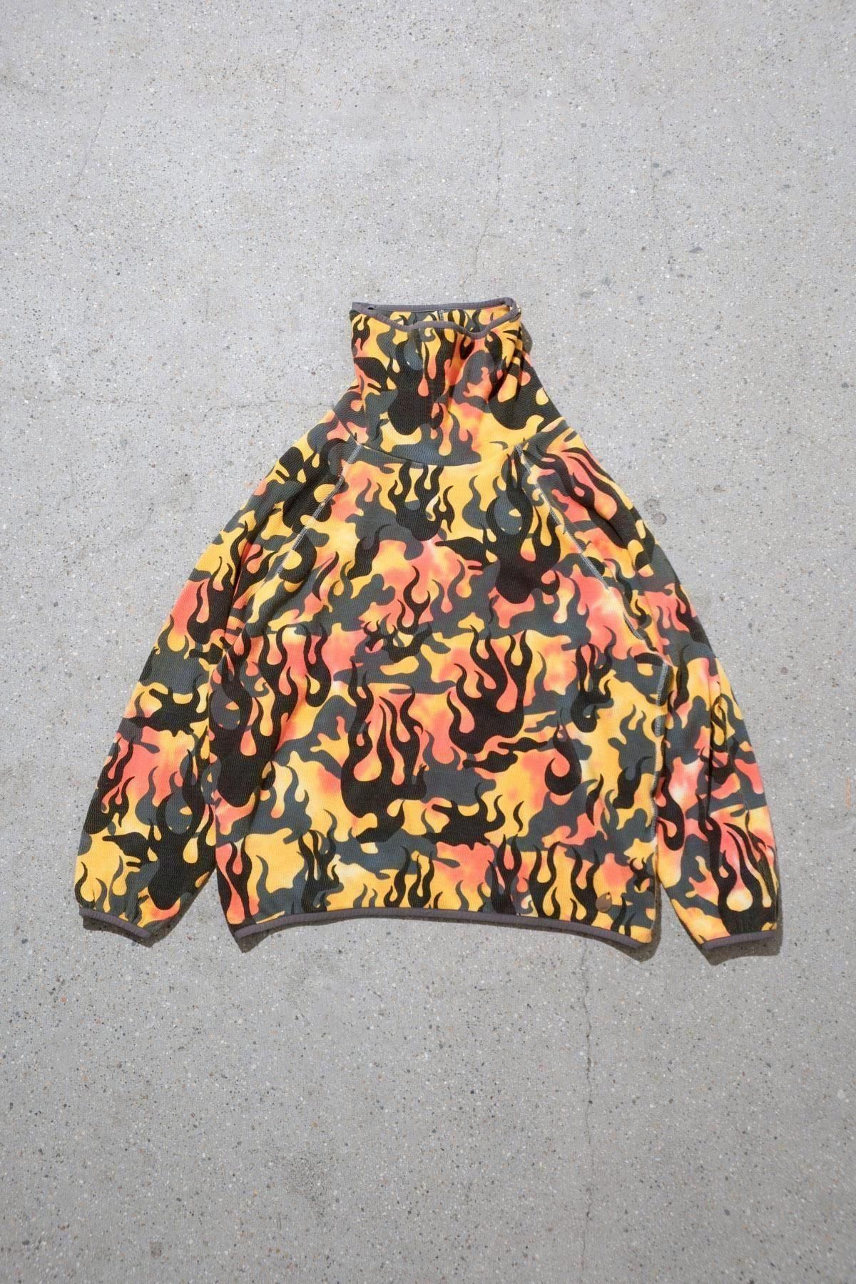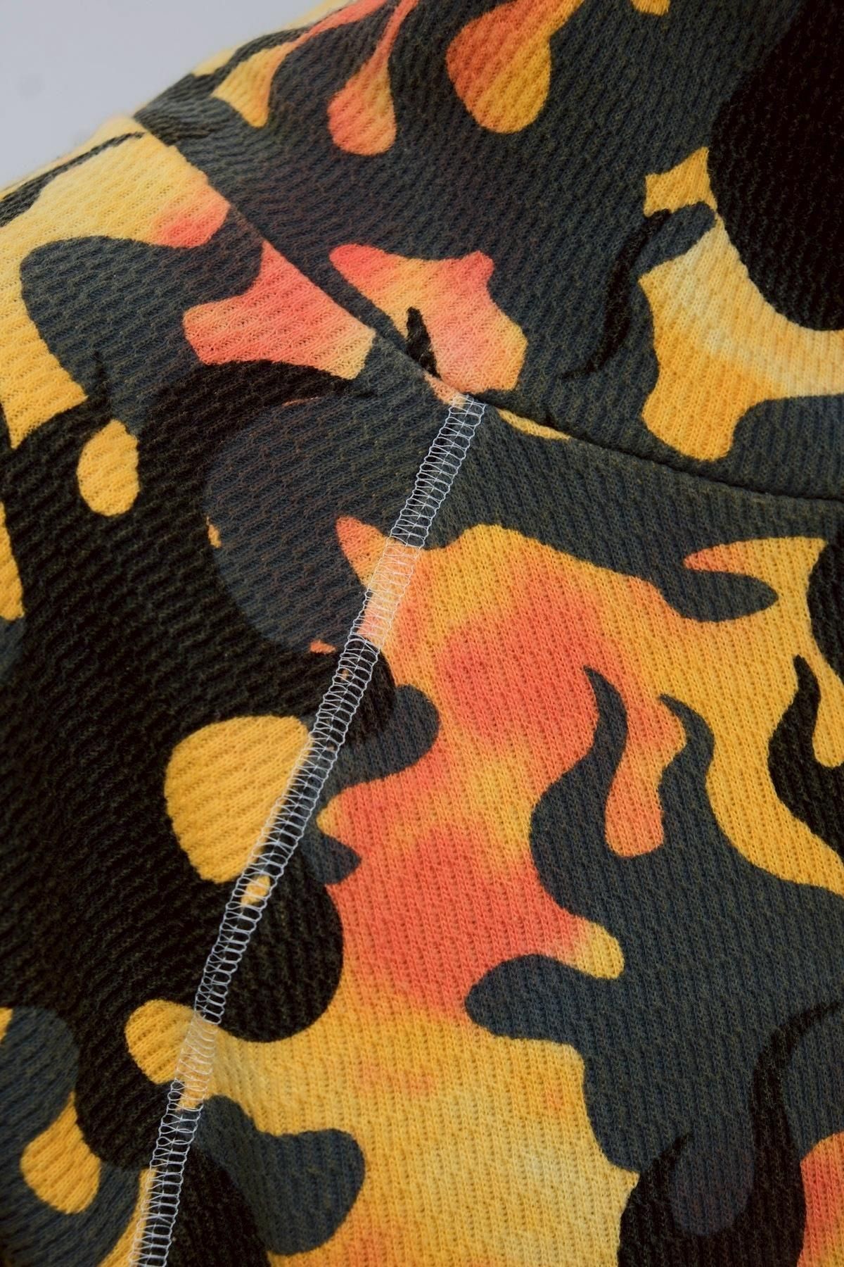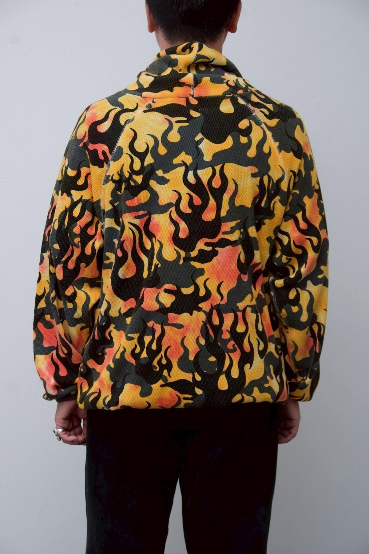 ファイヤーパターンをモチーフに、オリジナルカモのサーマル生地を使用したタートルネック。ベースカラーをメラメラと燃え盛るようなオレンジ×イエローに別注したIMA:ZINEエクスクルーシヴ。アウトドアギアをモチーフに、ボリュームのあるタートルネック部分にはイヤーフラップを付け、耳に引っ掛けることでマスクとしても着用して頂けます。顔の半分を覆い隠すような、存在感抜群のボリューム感を楽しめます。エッジ部分はリブではなくパイピング処理されており、膨らみのあるフォルムに形成。職人の手によって染められたタイダイ柄は、ファイヤーパターンにさらなる力強さを加え、ファッションの楽しさを表現しています。