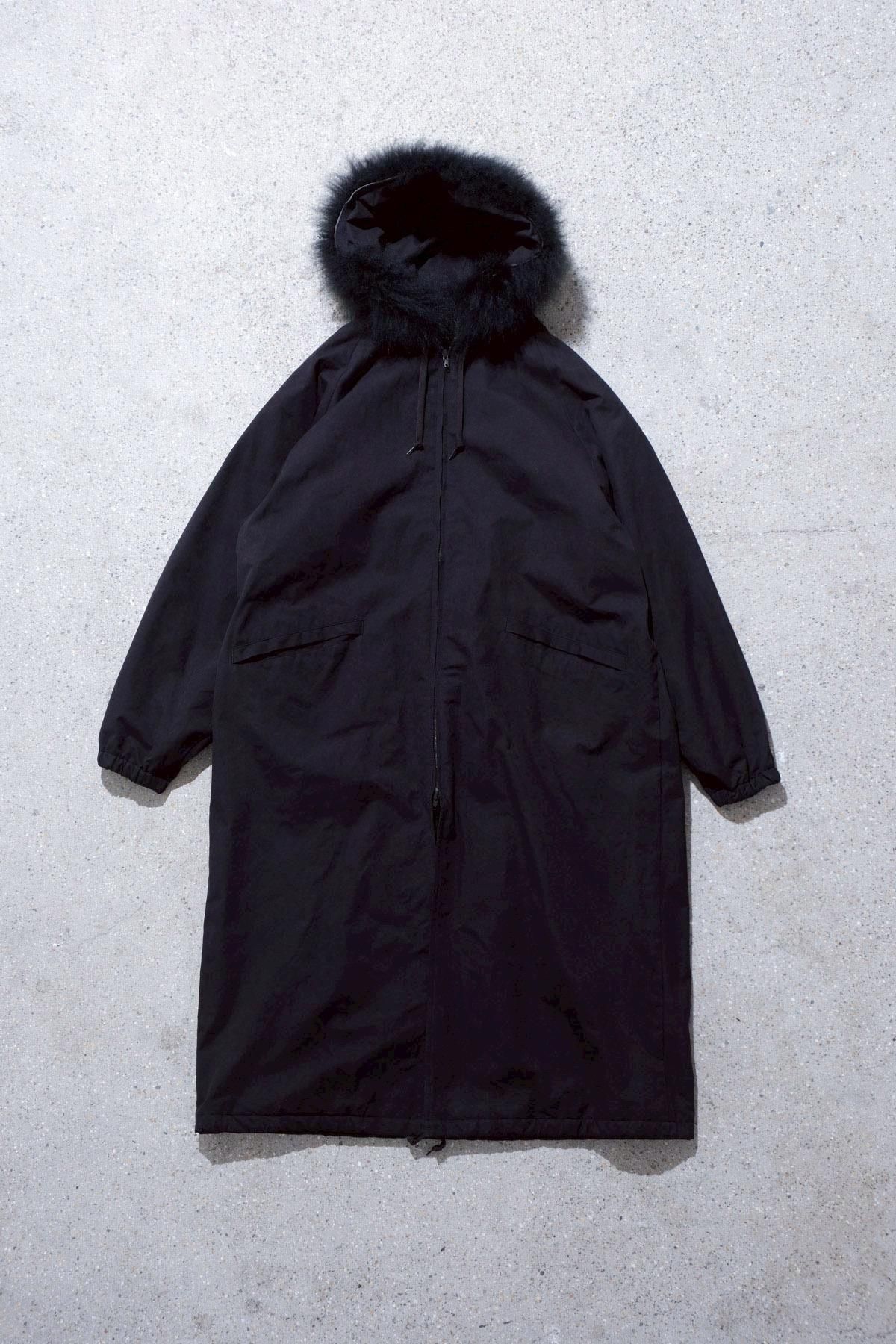 カシミアのファーが付いたフーデッドロングコート。少しのヌメ感とハリのある表地に対し、裏地はウール起毛の生地を使用することで、とても優しい着心地に。着用を重ねることでアタリが生まれ、経年変化を楽しめます。