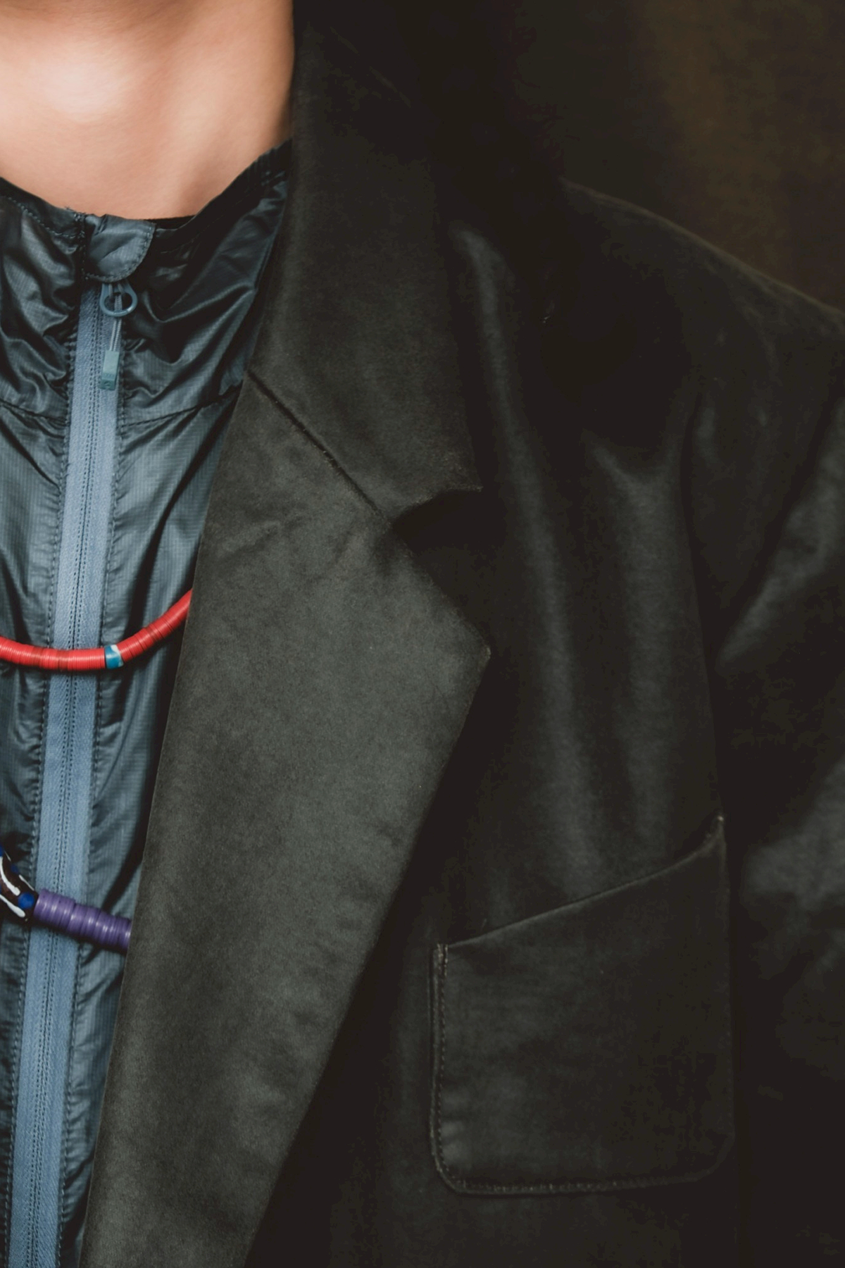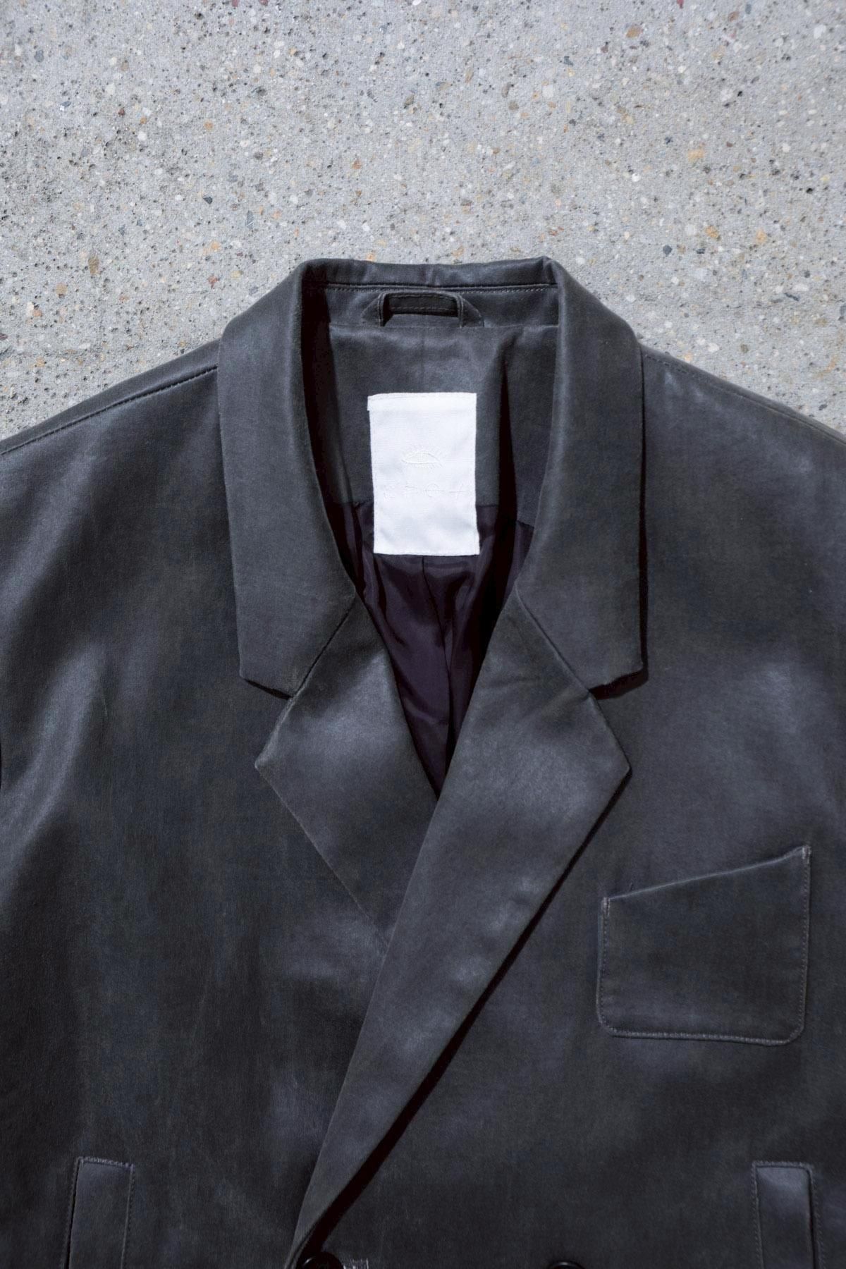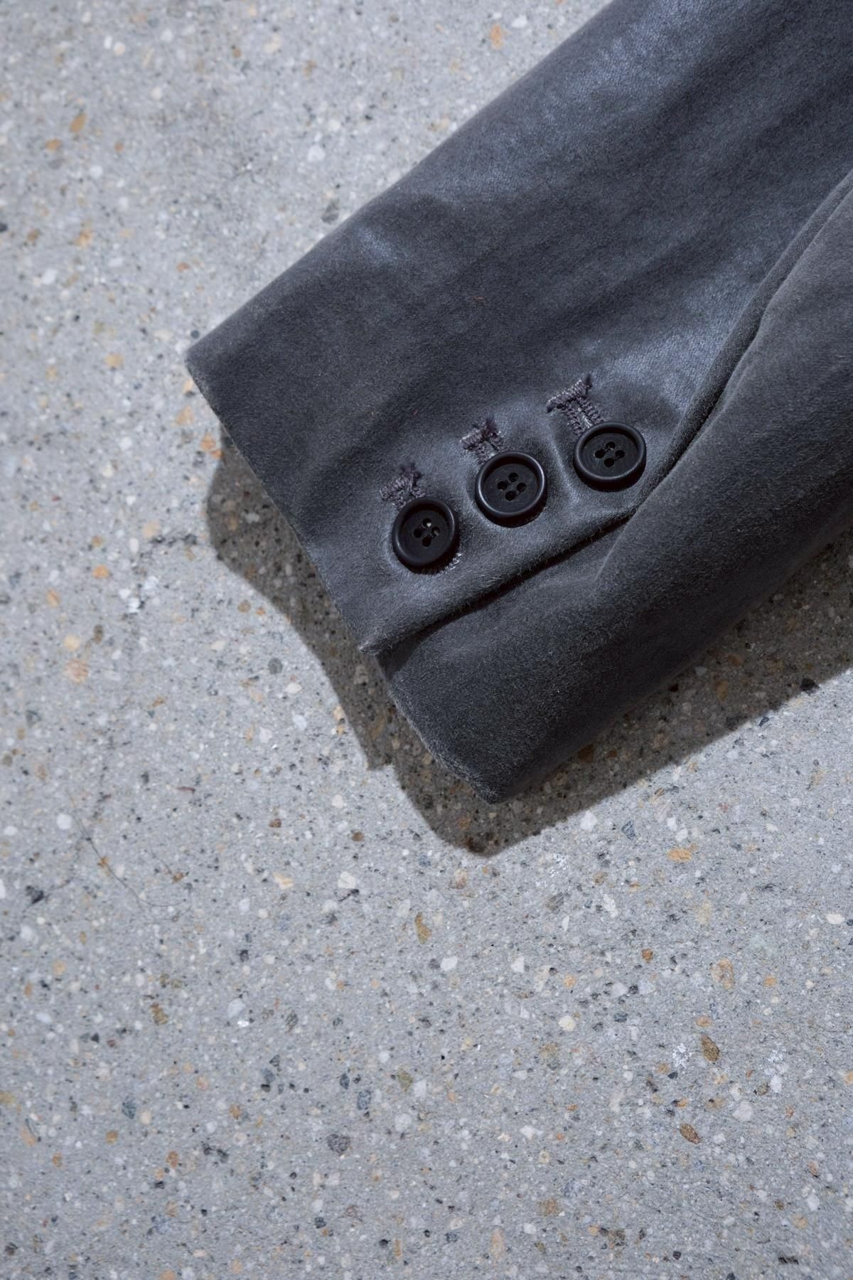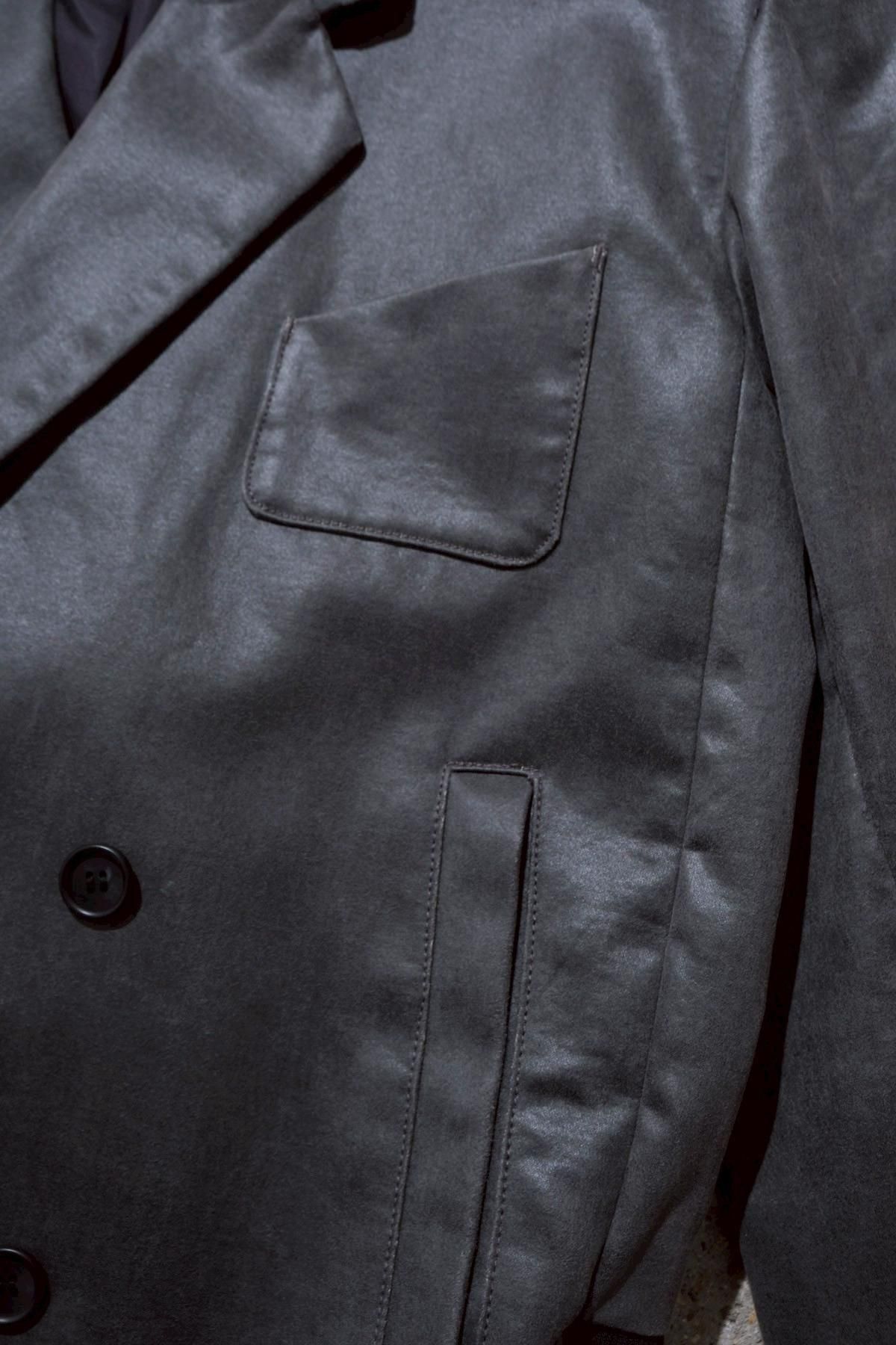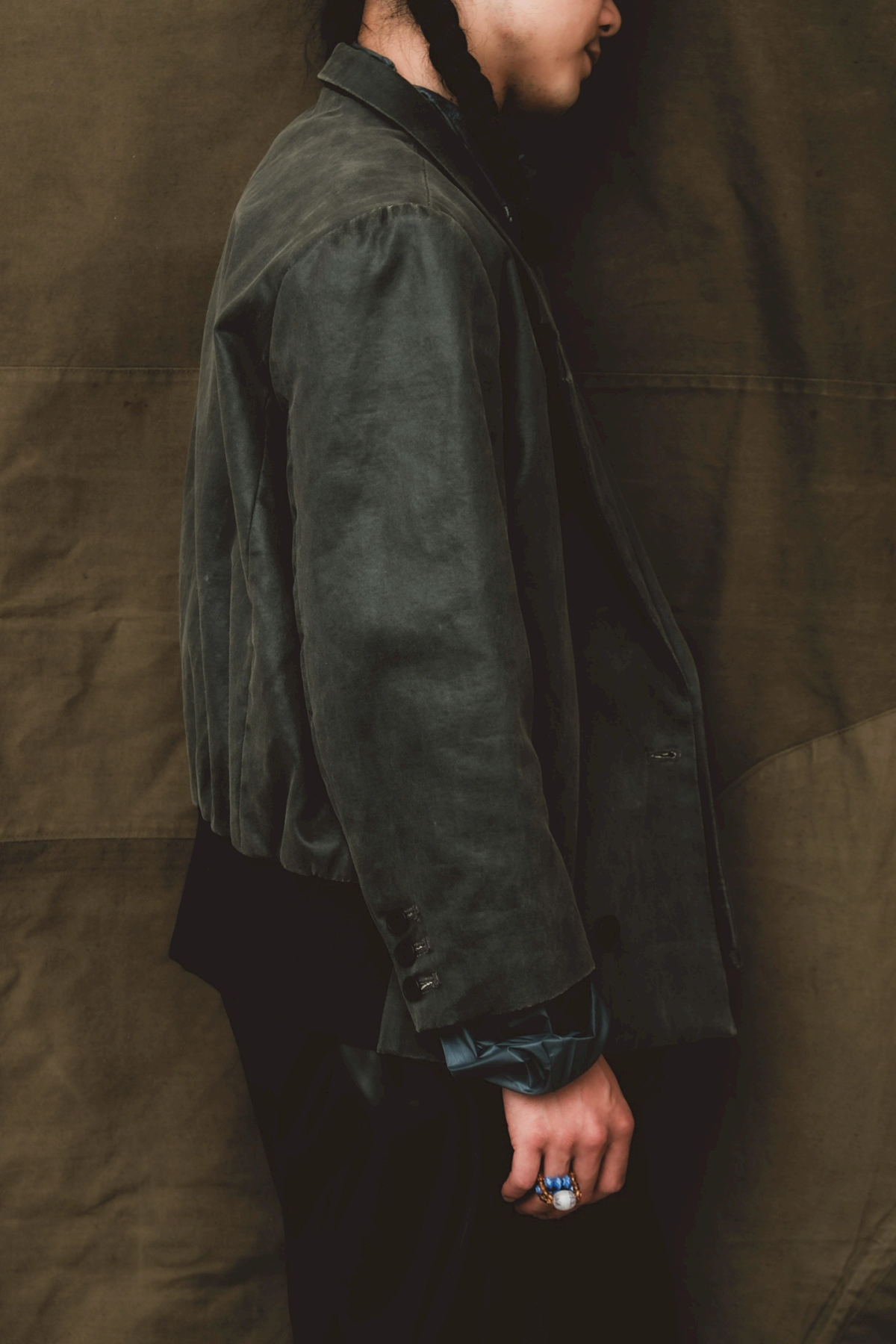 ツイルコットンのスエード生地にアクリルコーティングを施した、3/4スリーブジャケット。本切羽の袖口、裏襟にカラークロス、肩に薄裄ワタと毛芯パッドを当てがいテーラー仕様に。七分袖にショート丈、裾は伸縮性のあるリブ仕様にするなど、クールさとカジュアルさが絶妙に合わさったデザインに。スレやアタリによって、経年変化が楽しみます。