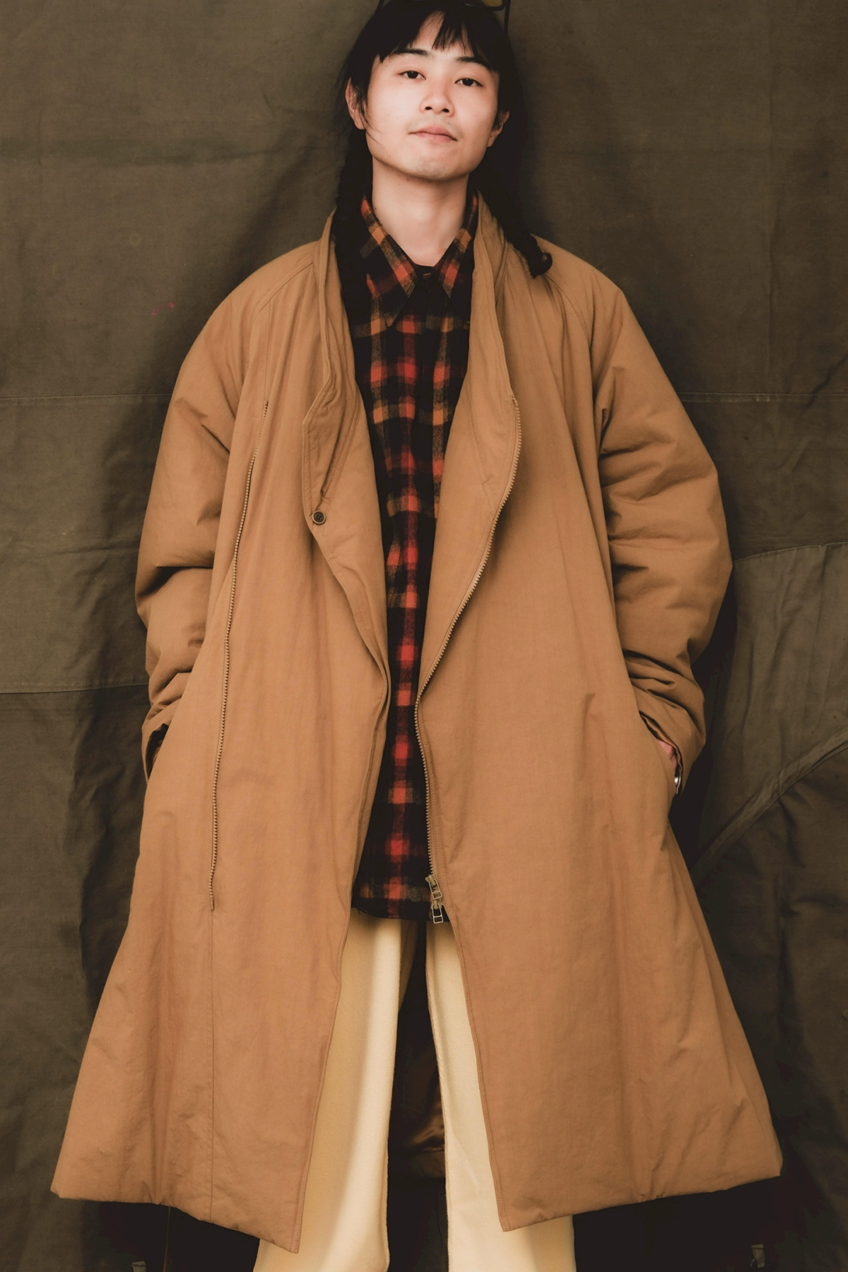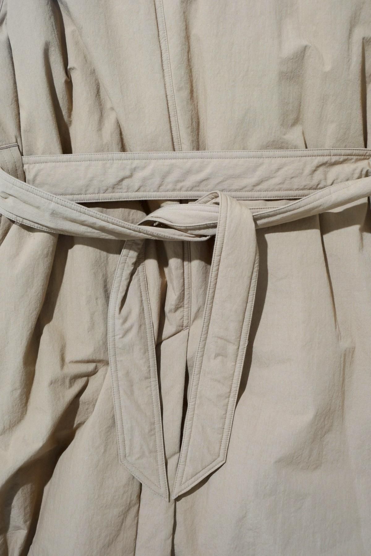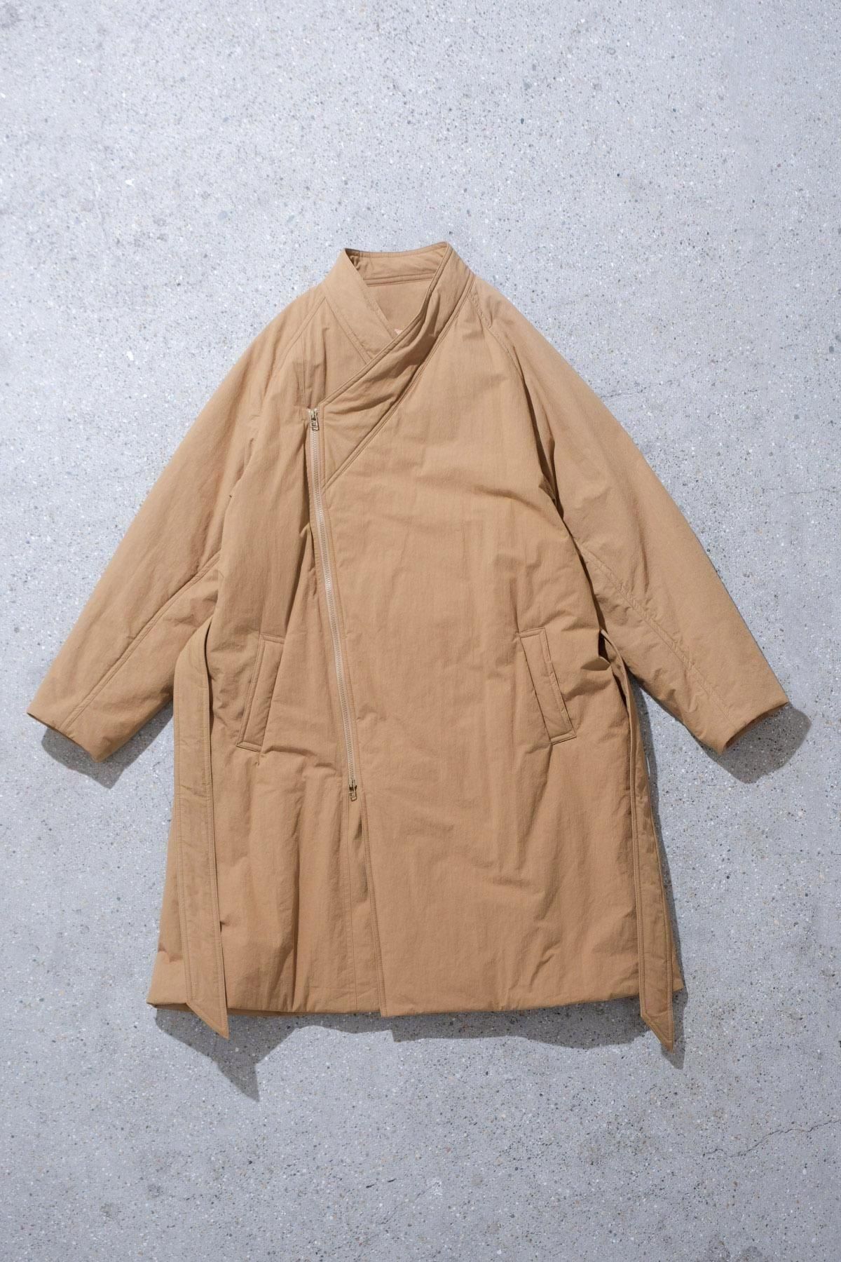 日本の伝統的な着物ををベースに、《whowhat》が現代的に解釈したKIMONO COAT。コットン50%、ナイロン50%を混紡した素材に撥水加工を施した生地を使用。ポリエステルの中綿、ライニングにはキュプラを使用し、風になびくような軽い着用感となっています。
