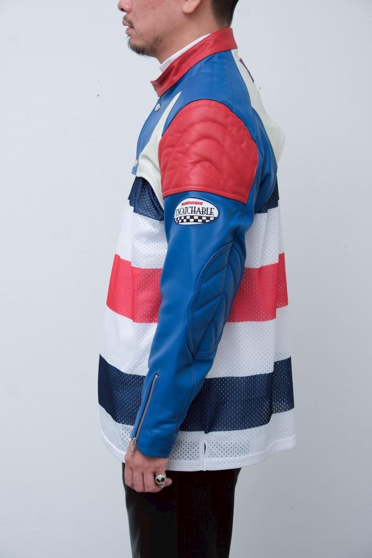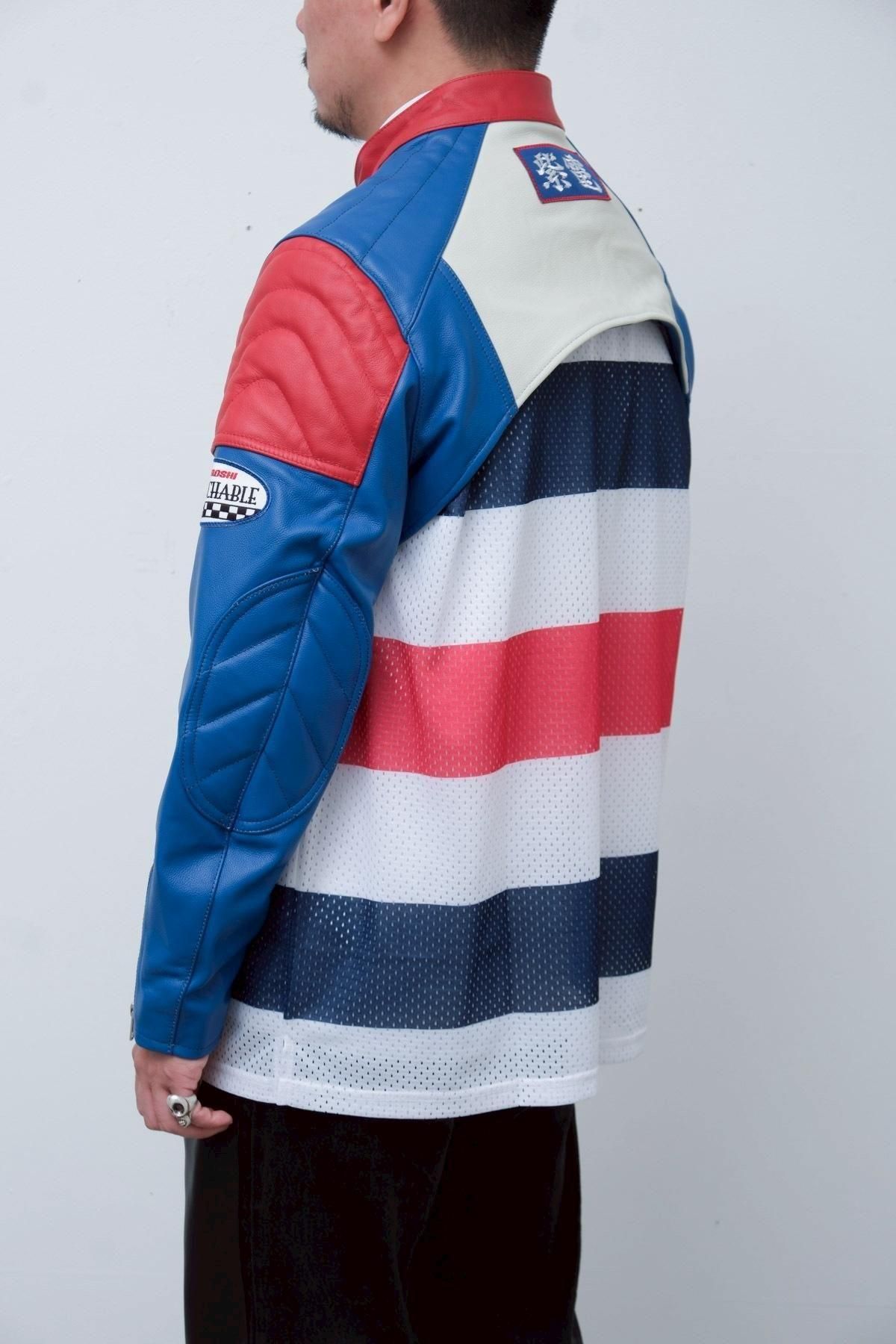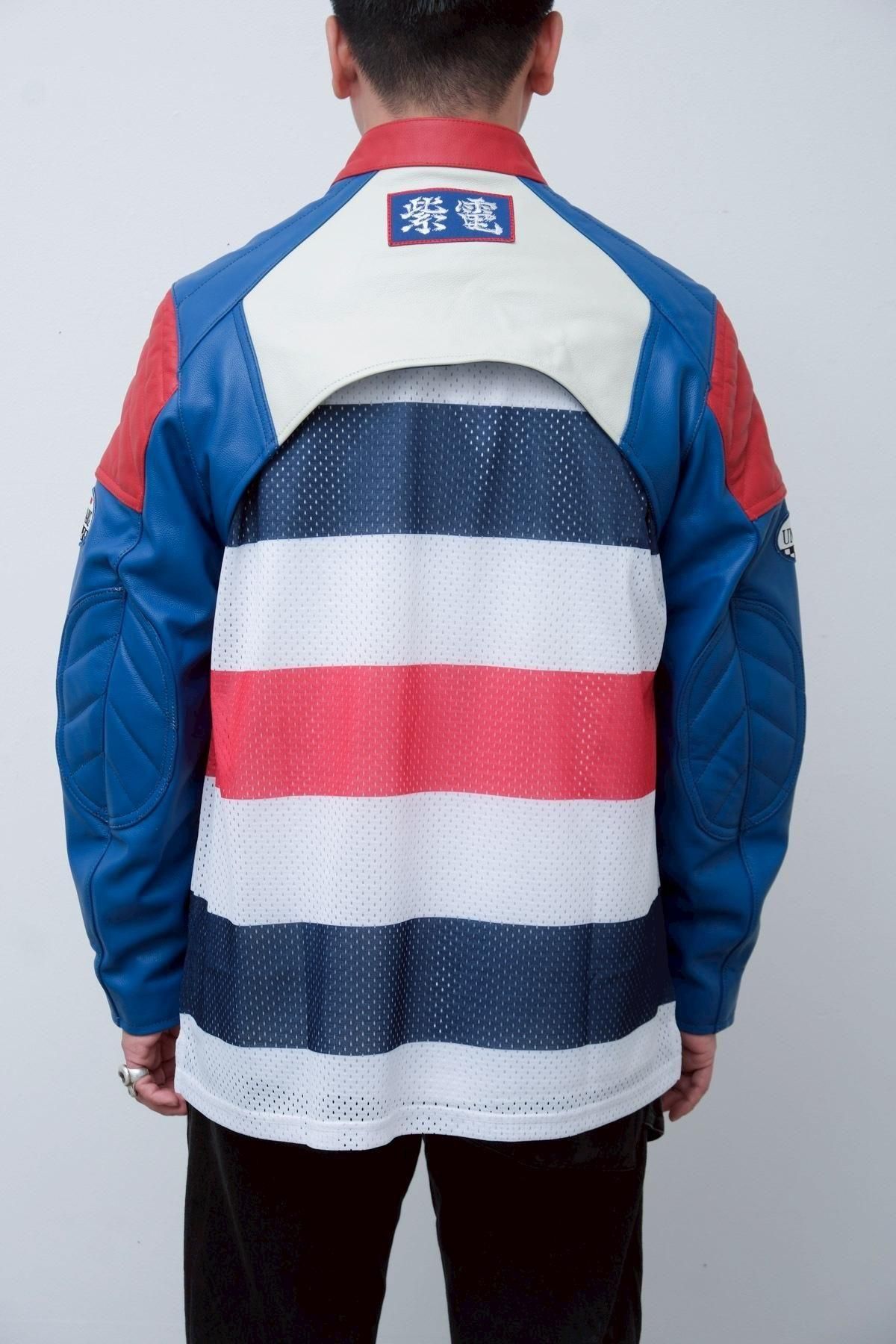 ショルダーやエルボーの補強などモーターサイクルジャケットの無骨なデザインを踏襲したモーターサイクルスリーブジャケット。カウハイドを使用し、胸やスリーブに縫い付けたオリジナルのワッペンなど、本格モーターサイクルウエアの要素が目を惹きつつ、ジャケットとのレイヤードの可能性を提示するかのような一着です。