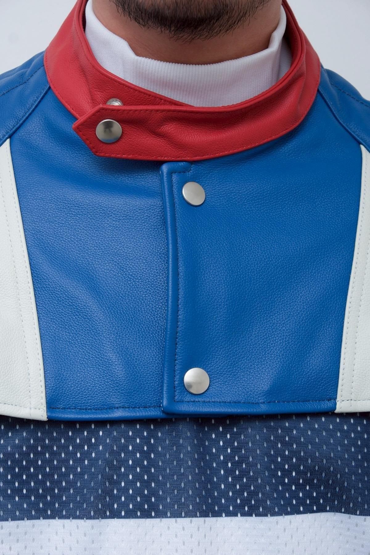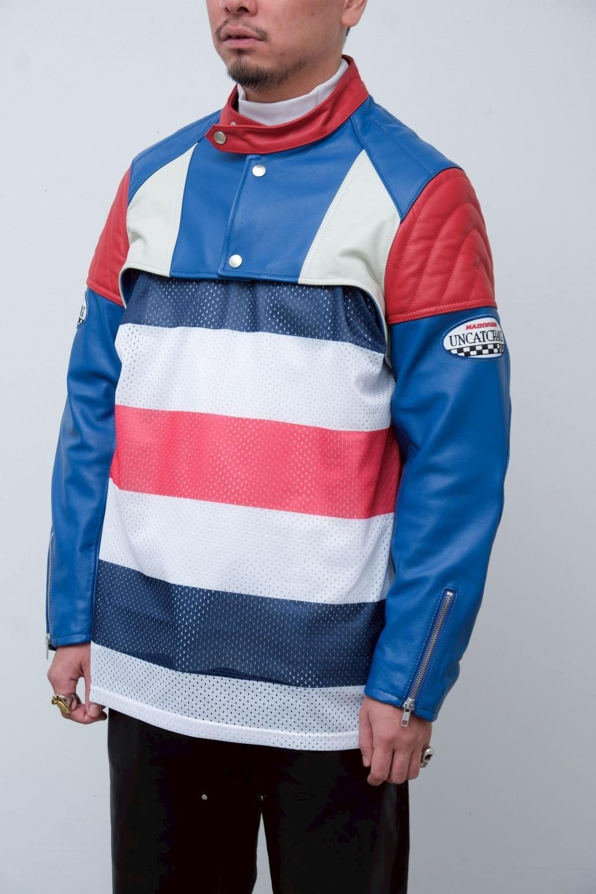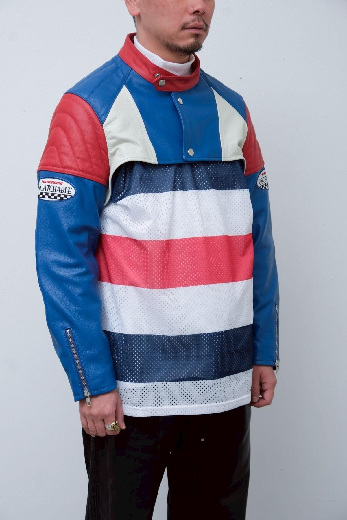 ショルダーやエルボーの補強などモーターサイクルジャケットの無骨なデザインを踏襲したモーターサイクルスリーブジャケット。カウハイドを使用し、胸やスリーブに縫い付けたオリジナルのワッペンなど、本格モーターサイクルウエアの要素が目を惹きつつ、ジャケットとのレイヤードの可能性を提示するかのような一着です。