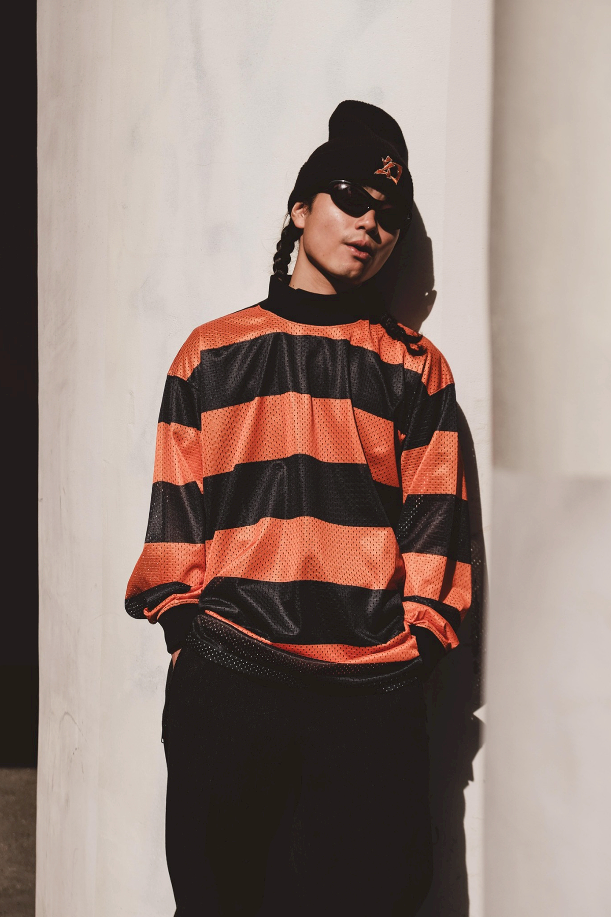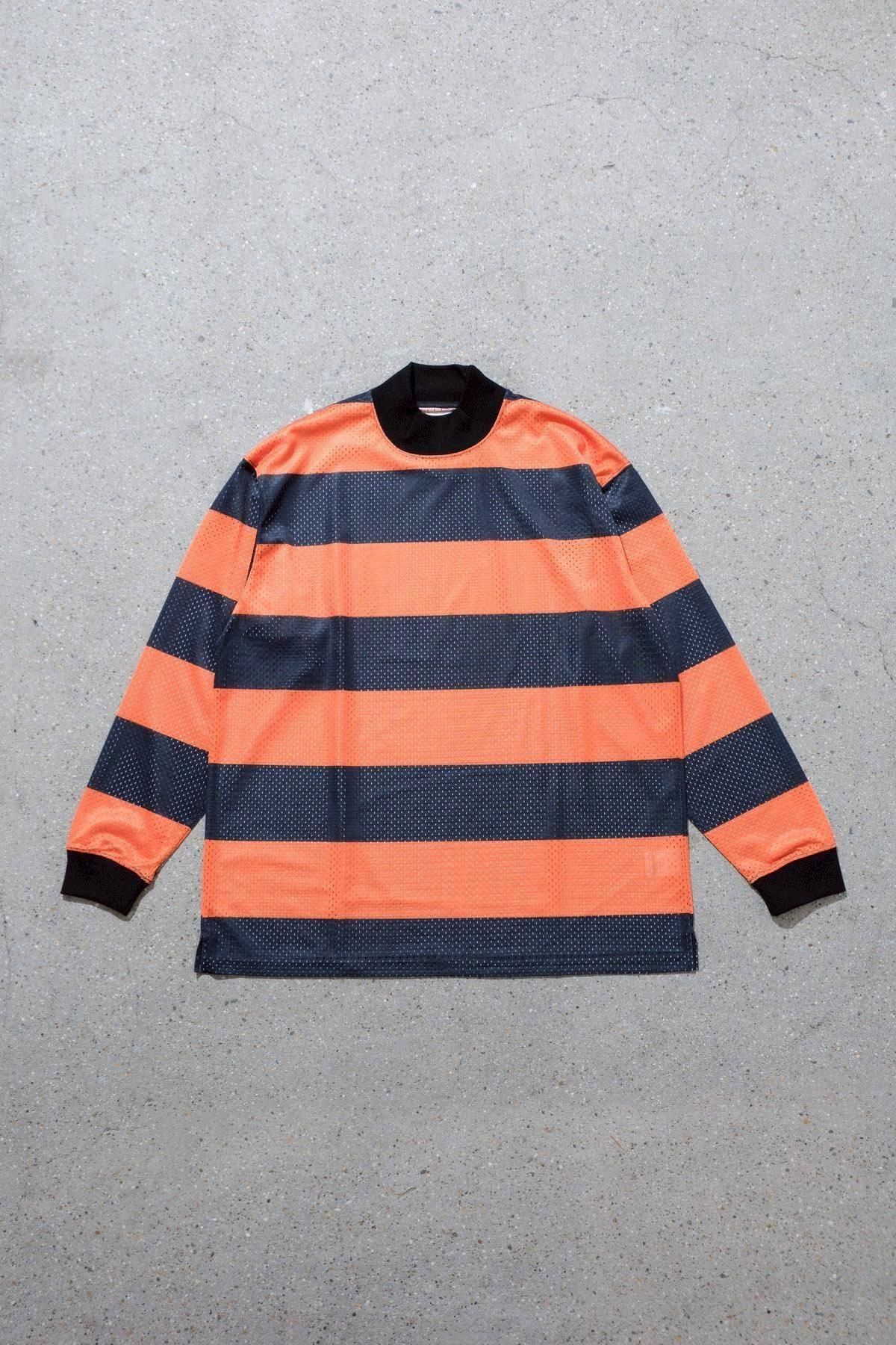 やや高さのあるネック型と透け感のあるメッシュの素材使いが特徴的なロングスリーブTシャツ。通気性や速乾性などの機能はもちろん、透け感を活かしたスタイリングも楽しめるユニークなアイテムです。非常にワイドなピッチのストライプがプリントされ、スポーティさとクラシックな表情を兼ね備えた仕上がりとなっています。ブラック/オレンジとトリコロールの2色展開。