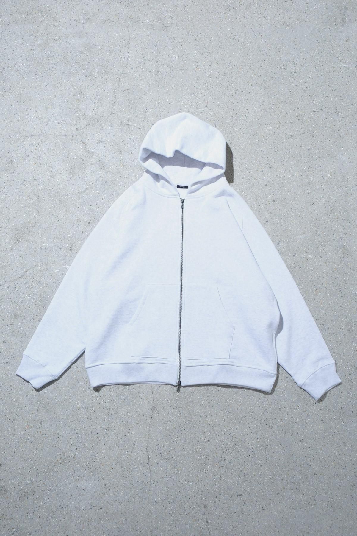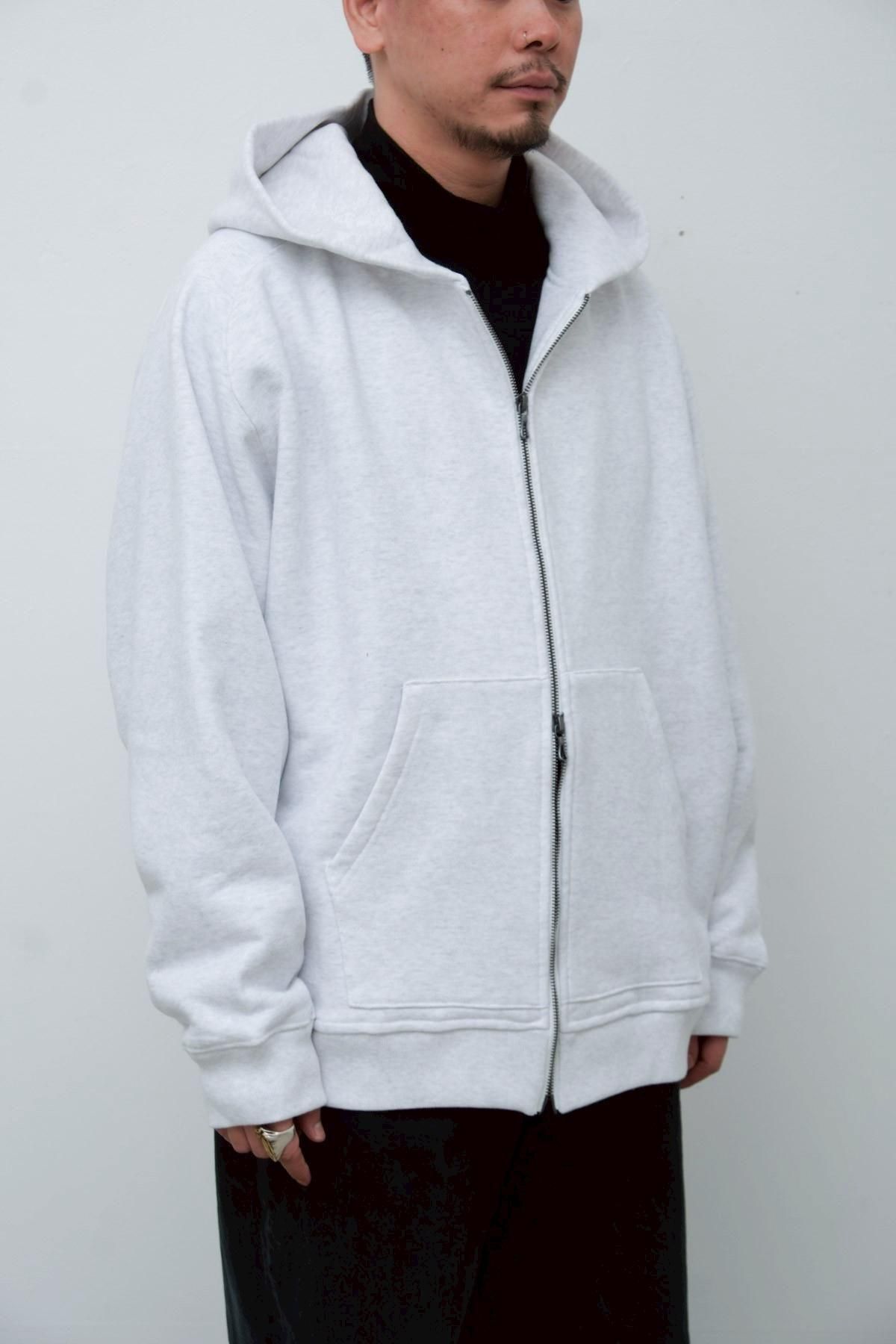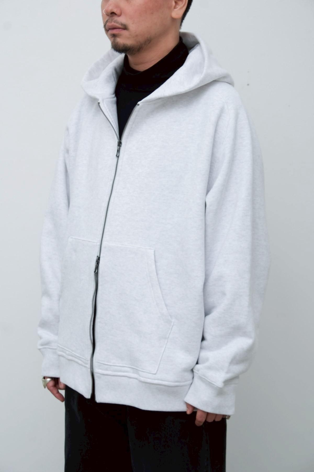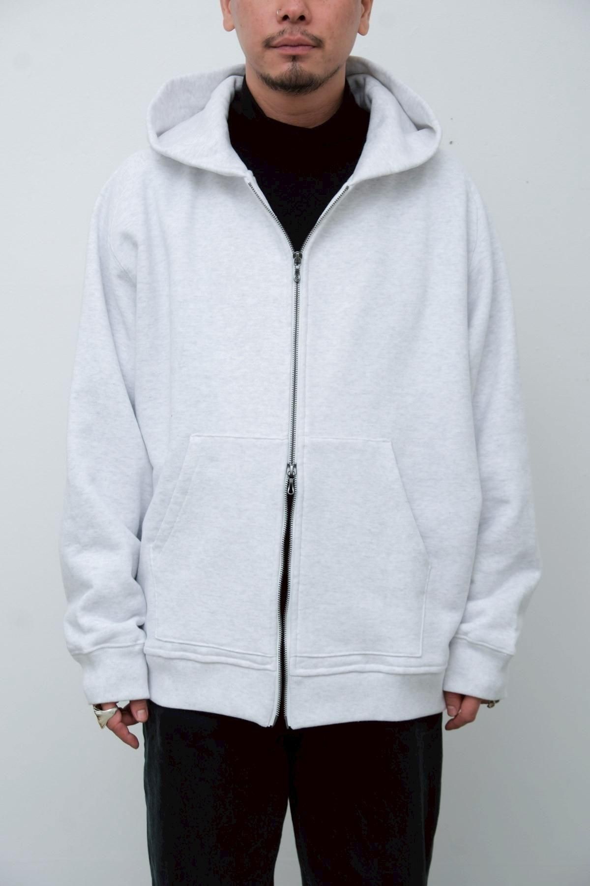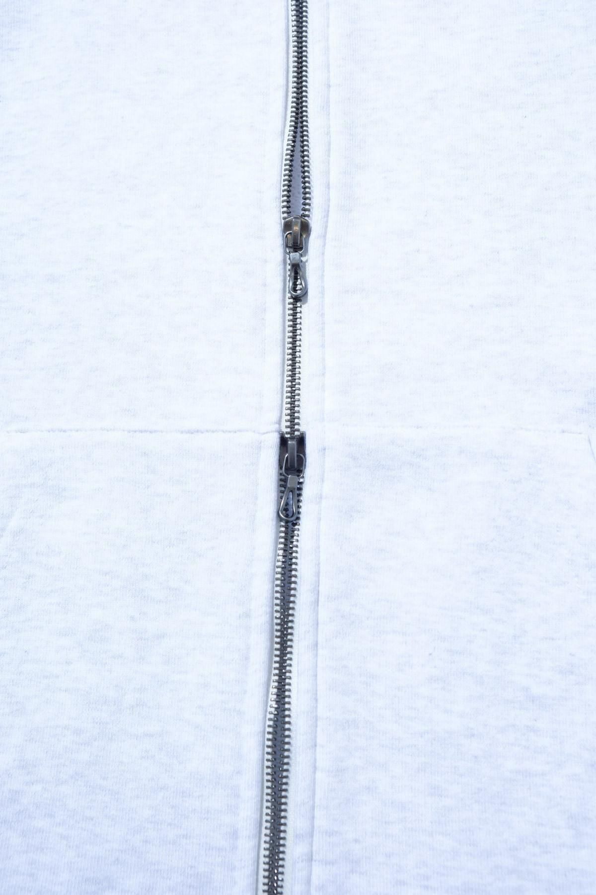 現存する古い織機を用い、表面はソリッドな艶感と美しい印象のヘヴィーオンスに織り上げ、肌にあたる部分は滑らかで風合いある裏毛仕様に。アメリカ物のヘヴィオンスならではのカジュアル感を残しながらも独特の高級感を与えるバランスに設計。全体的に丸みを持たせることで、着るひとを選ばないゆったりとしたシルエットに。また、国内では珍しいIDEALのシルバーニッケル色のダブルジップを使用するなど、ミニマルながらも随所にこだわりを注入しています。スタイルのベースとして、またメインとして長く愛用いただけるジップアップパーカーです。昨年に続くブラックと、新色トップホワイトの2色展開。