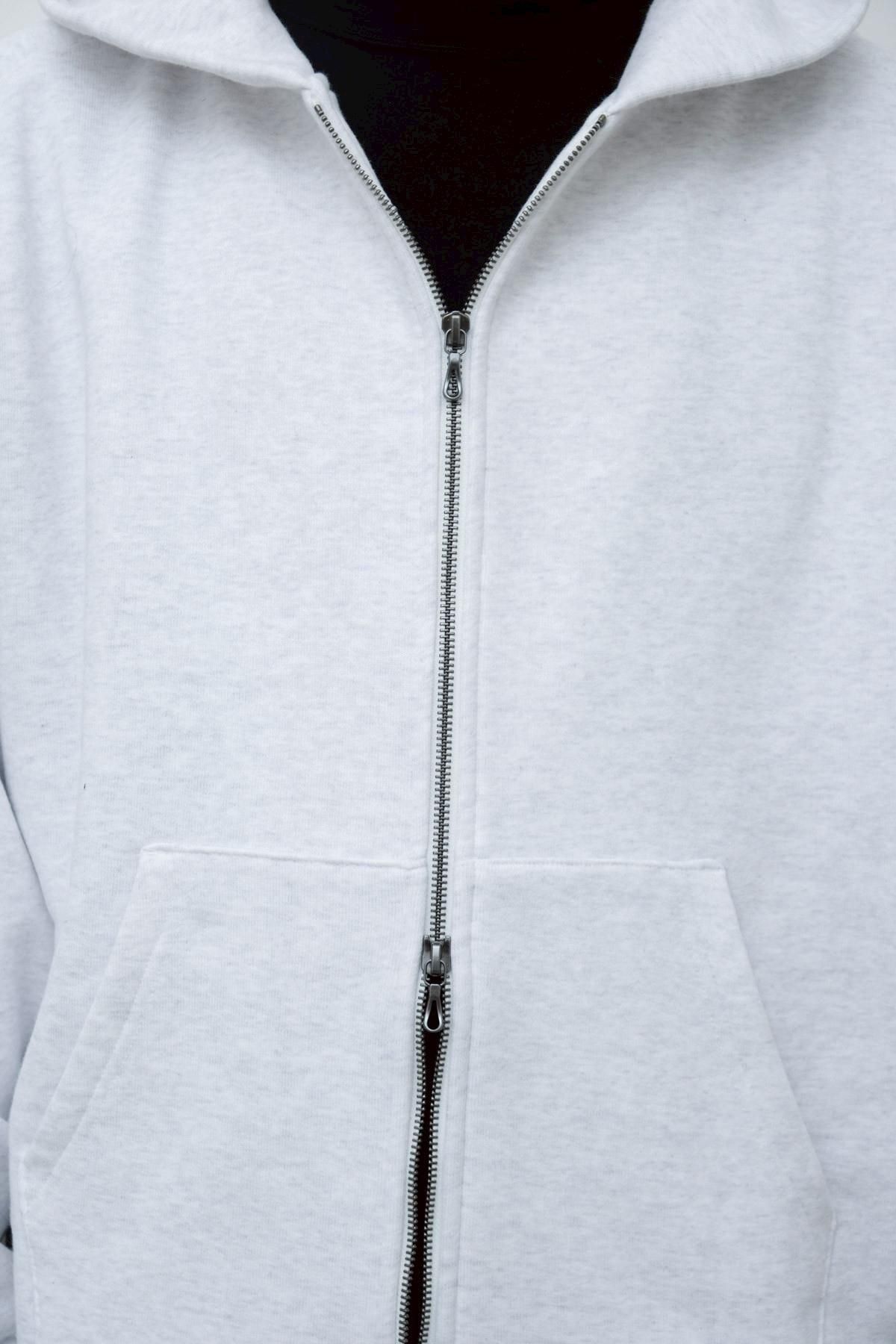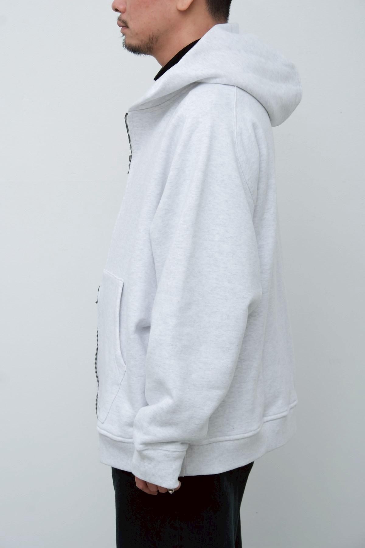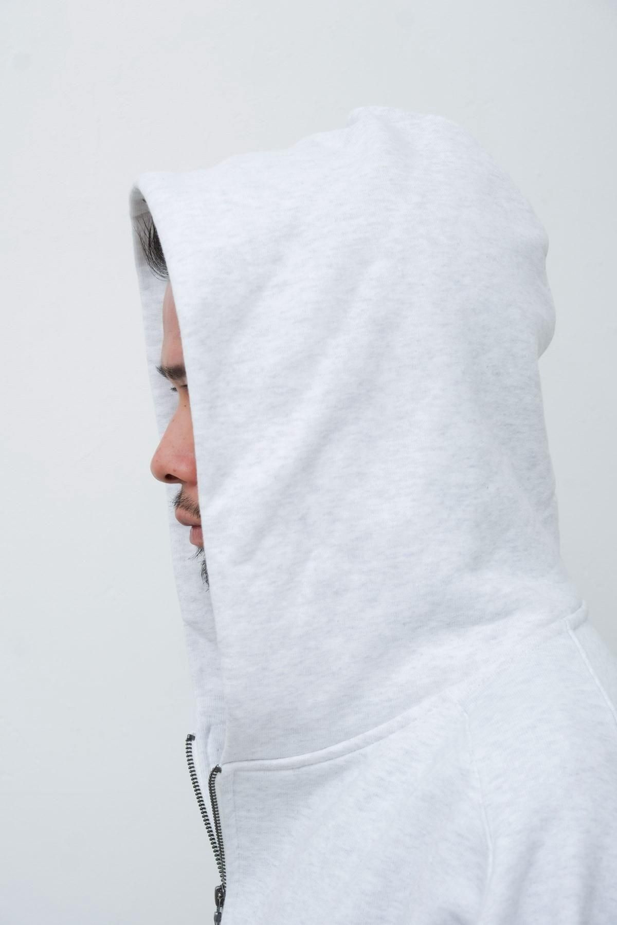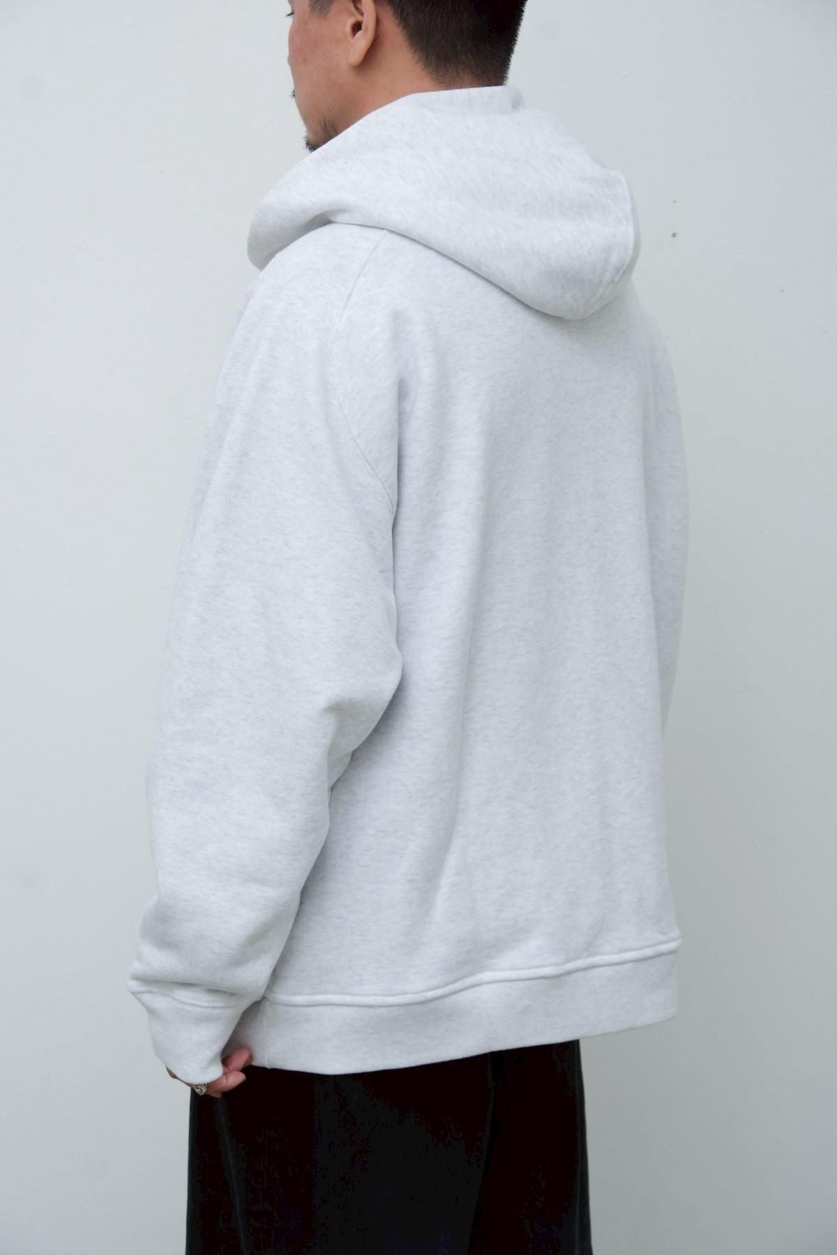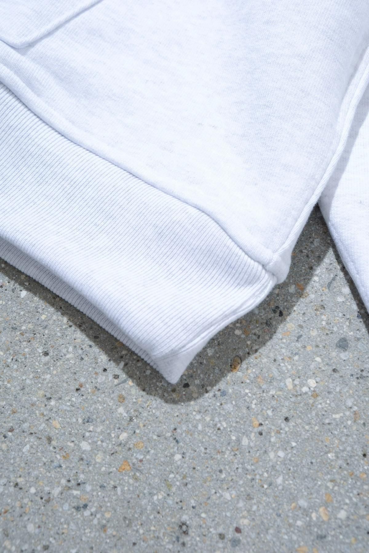 現存する古い織機を用い、表面はソリッドな艶感と美しい印象のヘヴィーオンスに織り上げ、肌にあたる部分は滑らかで風合いある裏毛仕様に。アメリカ物のヘヴィオンスならではのカジュアル感を残しながらも独特の高級感を与えるバランスに設計。全体的に丸みを持たせることで、着るひとを選ばないゆったりとしたシルエットに。また、国内では珍しいIDEALのシルバーニッケル色のダブルジップを使用するなど、ミニマルながらも随所にこだわりを注入しています。スタイルのベースとして、またメインとして長く愛用いただけるジップアップパーカーです。昨年に続くブラックと、新色トップホワイトの2色展開。