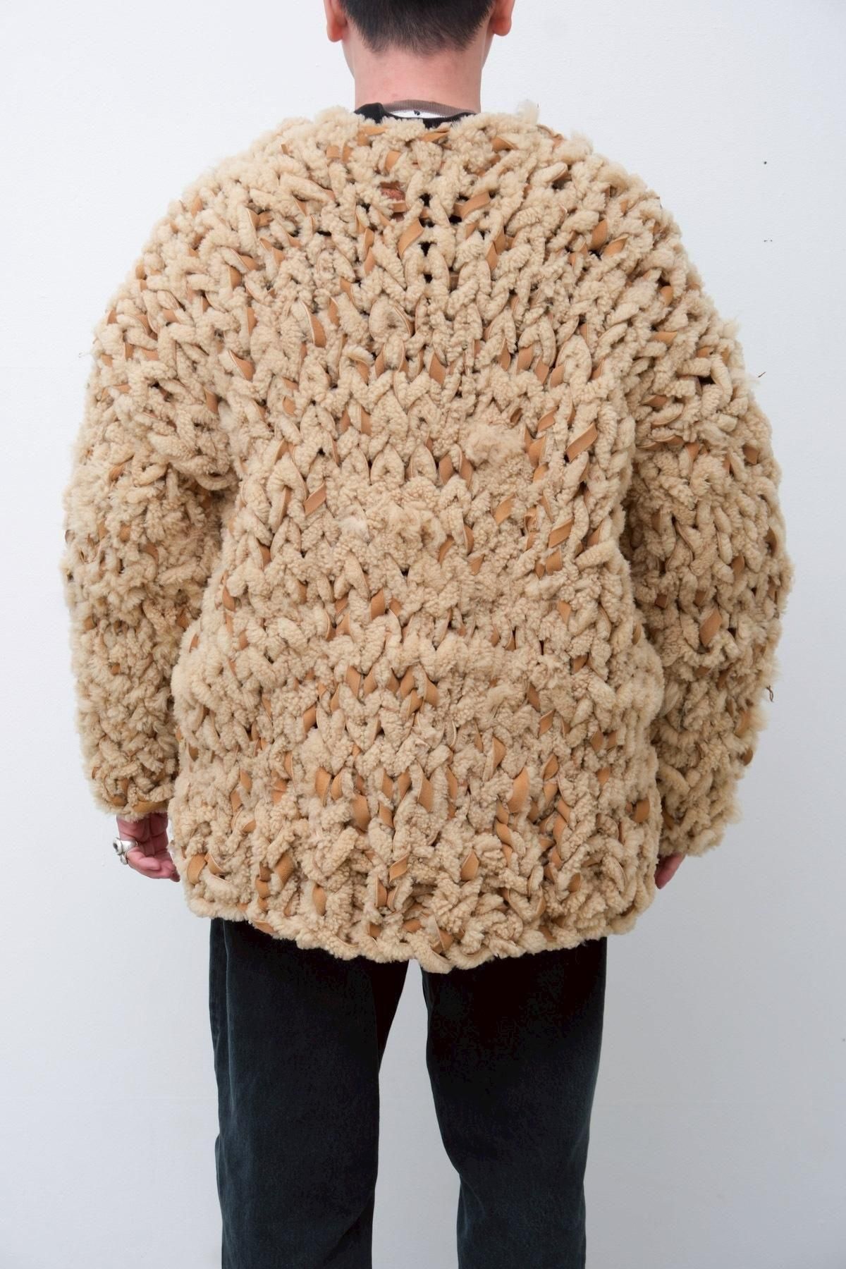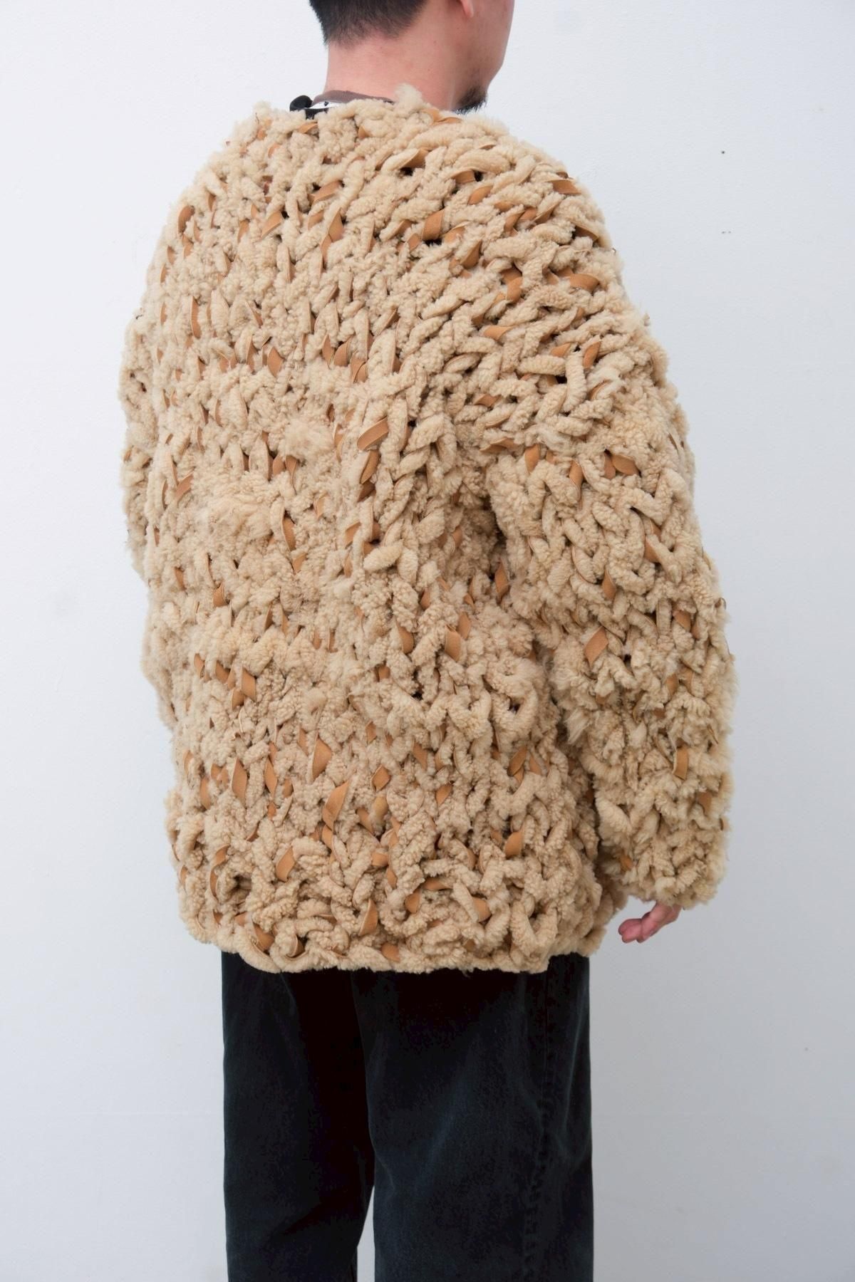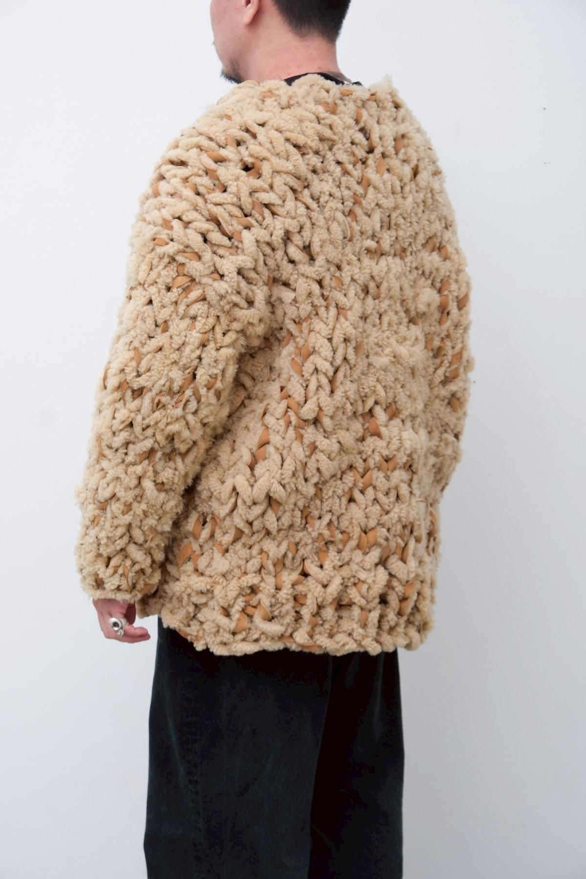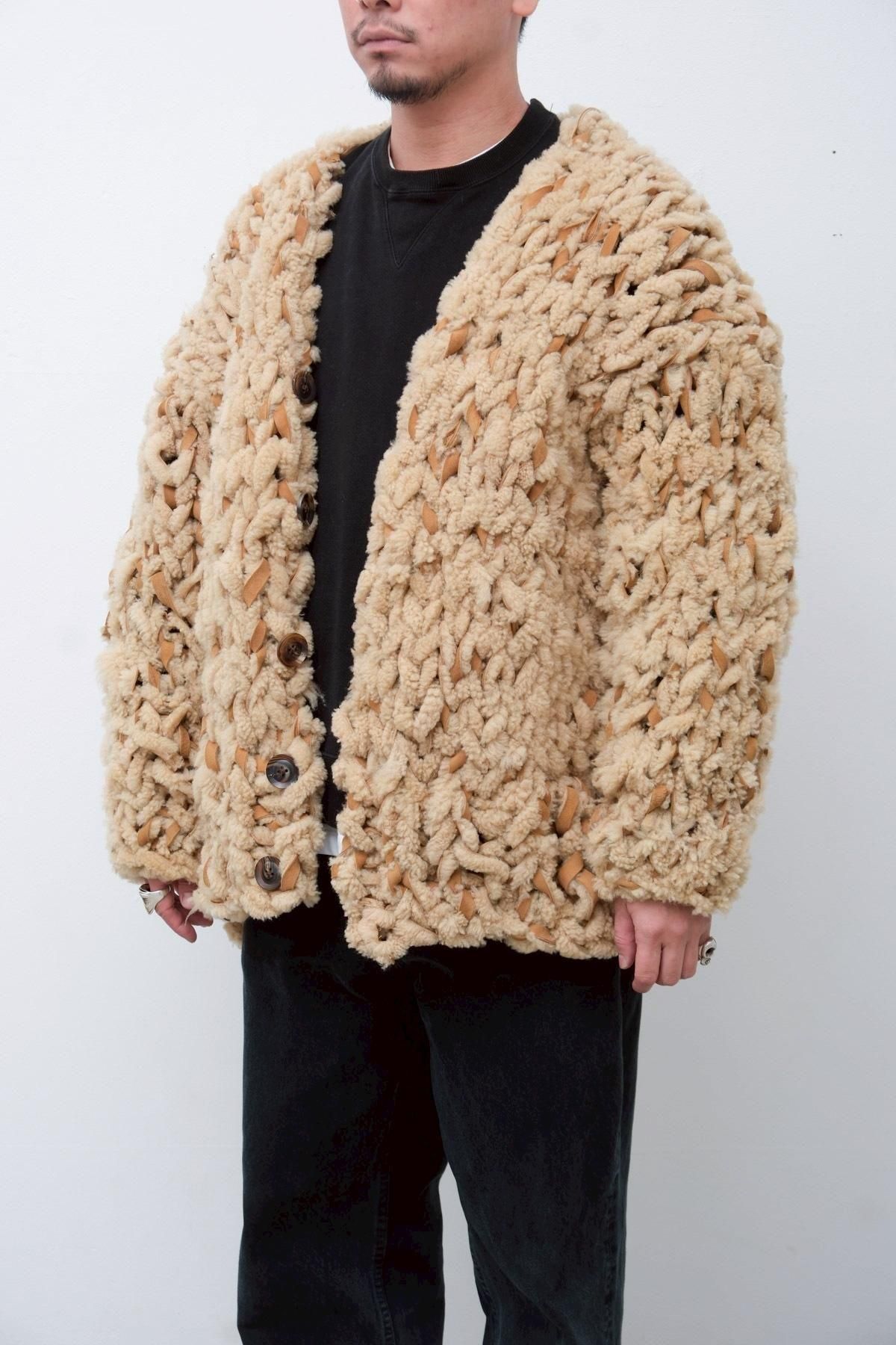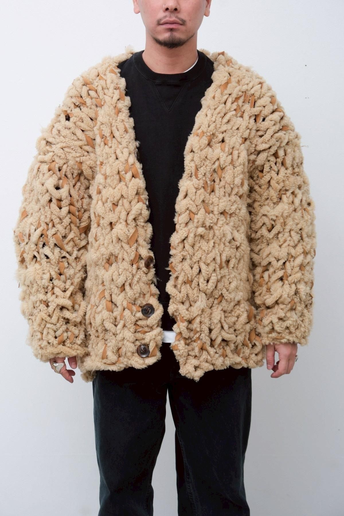 《GOOD KARMA DEVELOPMENT》のNEWモデル。ムートンのアイテムを生産した際に出る端切れ(はぎれ)を無駄にすることなく活用出来ないか、という考えのもと誕生した、ムートンカーディガン"チャーリー"。ムートンを細く裁断。それら繋ぎ合わせ一本の糸にし、原皮と組み合わせ、熟練の職人による手編みで1点づつ丁寧に仕上げたとてもオーラのある《GOOD KARMA DEVELOPMENT》ならではのアイテムです。表面(毛の面)と皮面(スウェード面)がランダムかつ、ざっくりと編み込まれた独特の表情がおもしろい、どれも全く同じ物が存在しない完全なる一点物に。着込むほどに少しづつ伸び、ゆったりとしたシルエットに変化していきます。ボタンにはバッファローボタン(水牛の角)を使用。ワンサイズ展開となります。