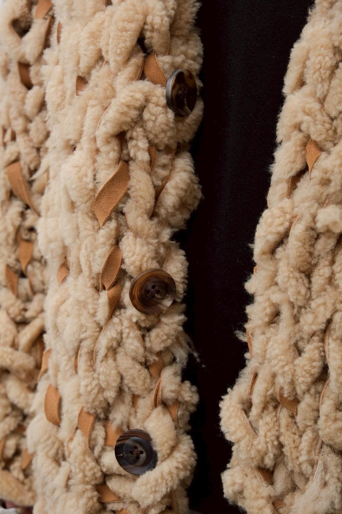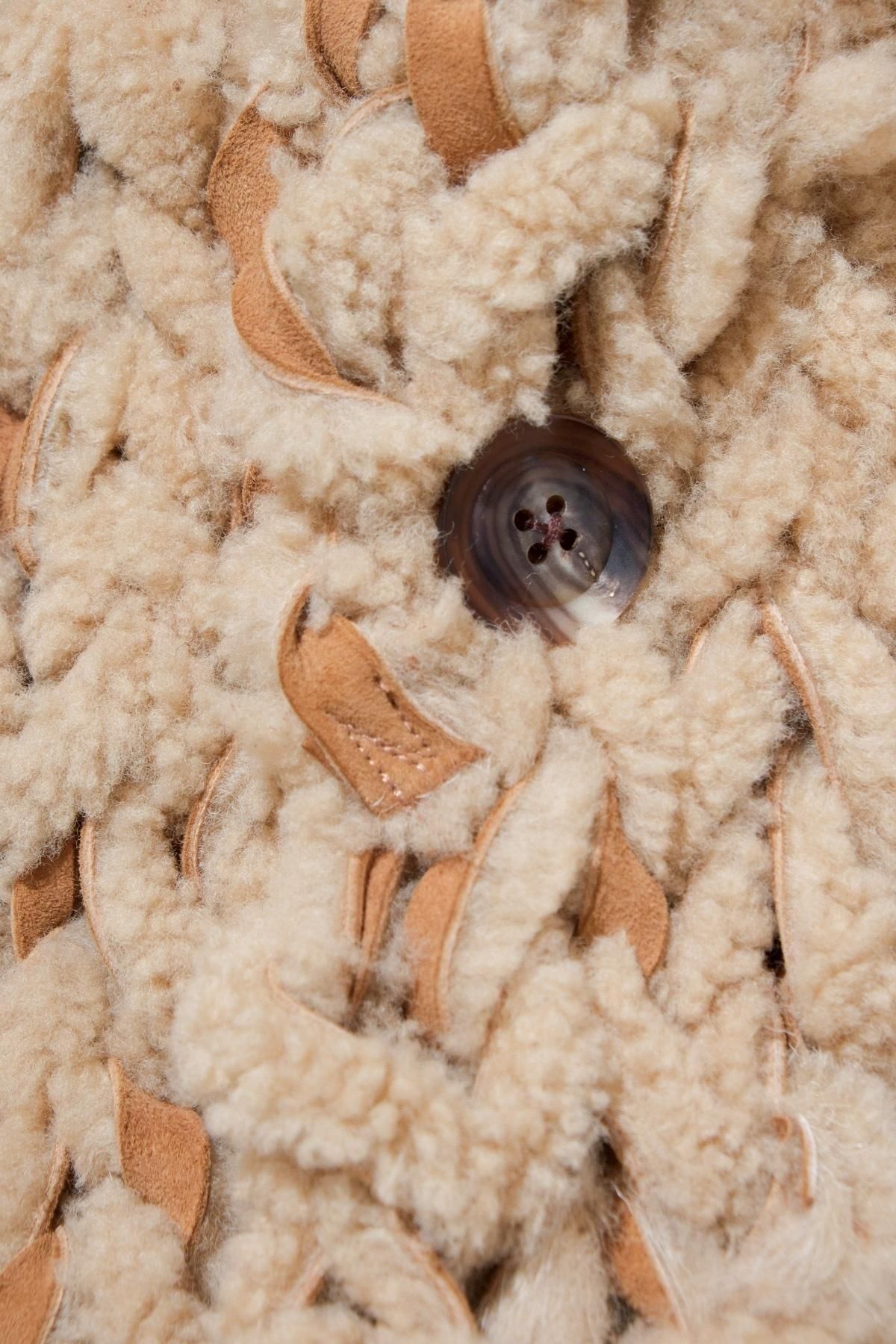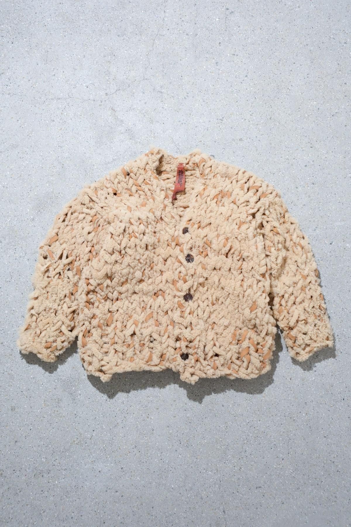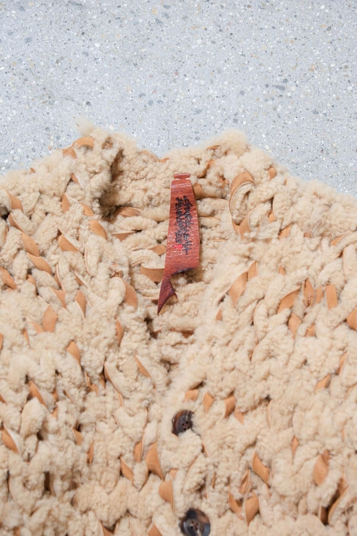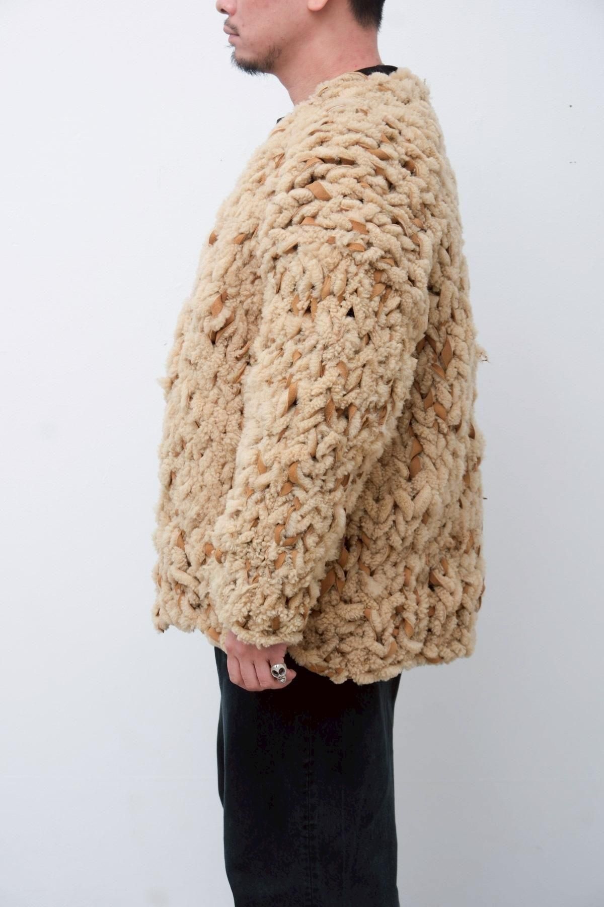 《GOOD KARMA DEVELOPMENT》のNEWモデル。ムートンのアイテムを生産した際に出る端切れ(はぎれ)を無駄にすることなく活用出来ないか、という考えのもと誕生した、ムートンカーディガン"チャーリー"。ムートンを細く裁断。それら繋ぎ合わせ一本の糸にし、原皮と組み合わせ、熟練の職人による手編みで1点づつ丁寧に仕上げたとてもオーラのある《GOOD KARMA DEVELOPMENT》ならではのアイテムです。表面(毛の面)と皮面(スウェード面)がランダムかつ、ざっくりと編み込まれた独特の表情がおもしろい、どれも全く同じ物が存在しない完全なる一点物に。着込むほどに少しづつ伸び、ゆったりとしたシルエットに変化していきます。ボタンにはバッファローボタン(水牛の角)を使用。ワンサイズ展開となります。