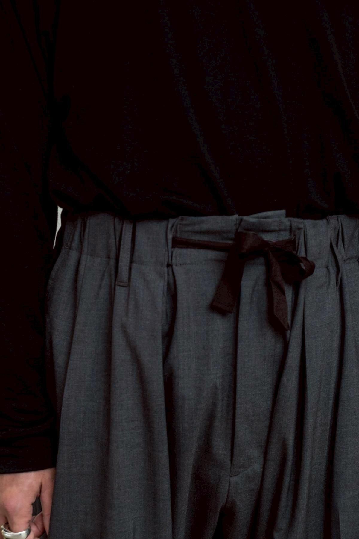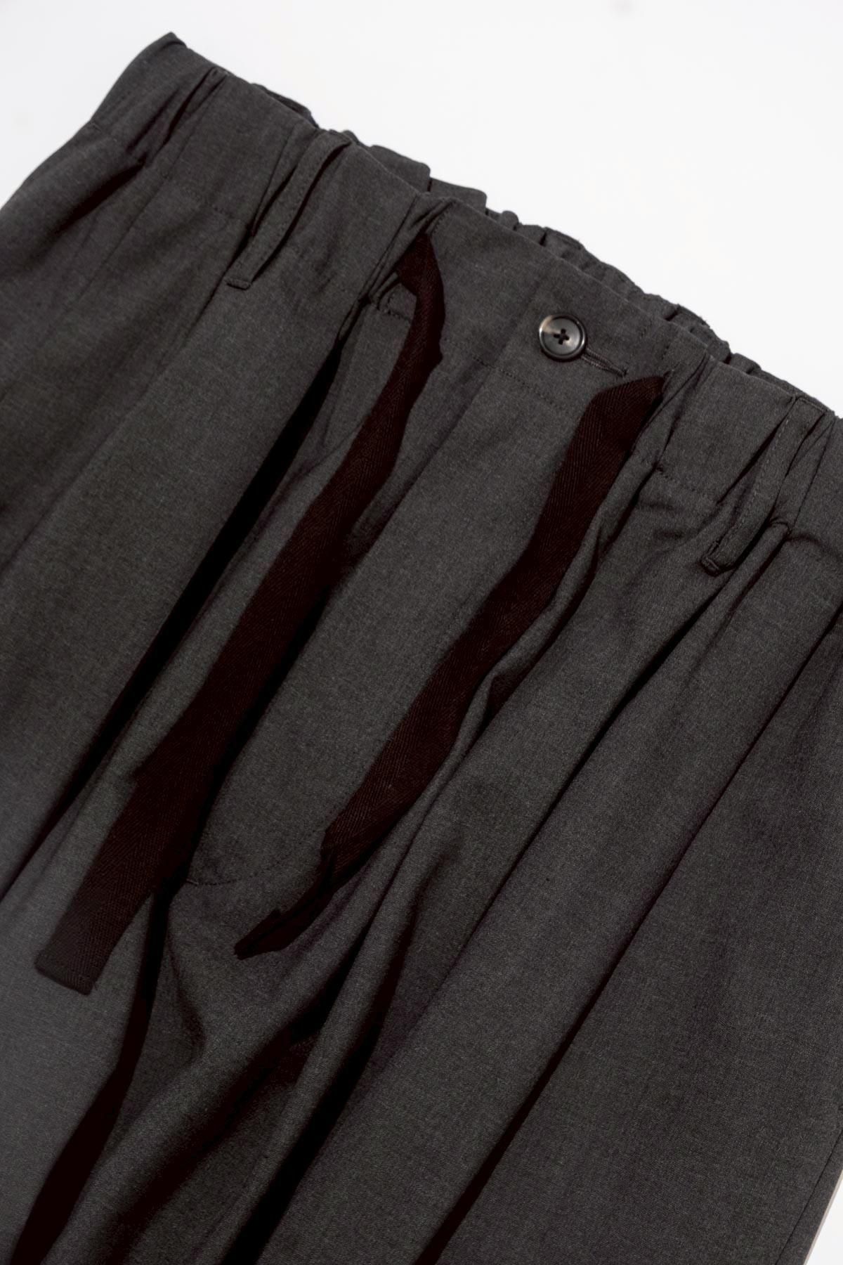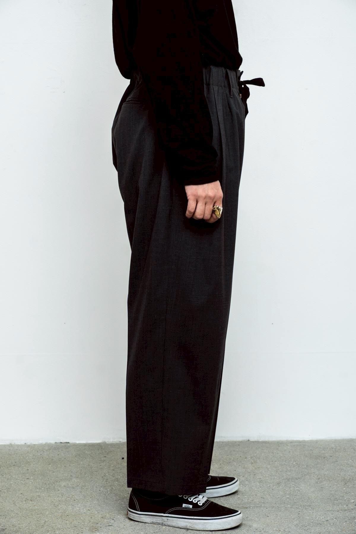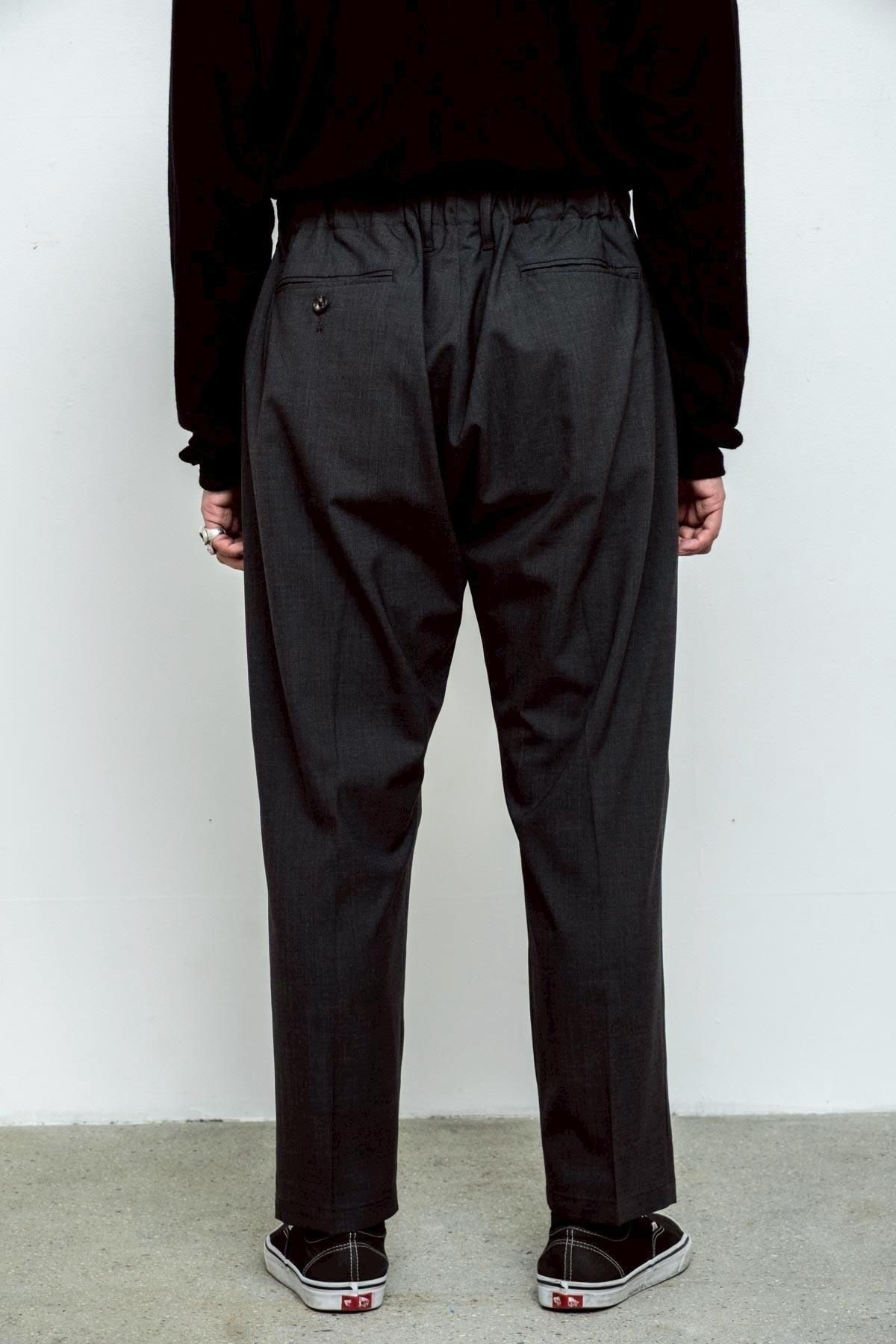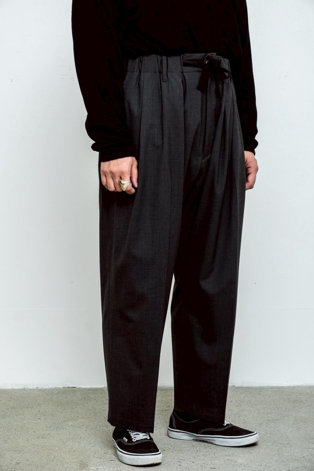 スーパーワイドなウエストを2タックとウエストゴムやドローコードでイージーパンツ仕様にし、裾にかけてテーパードさせたパンツ。ワタリはゆったりとしながら、綺麗なテーパードのラインやトロピカルウールのドレープ感ですっきりとしたシルエットに。