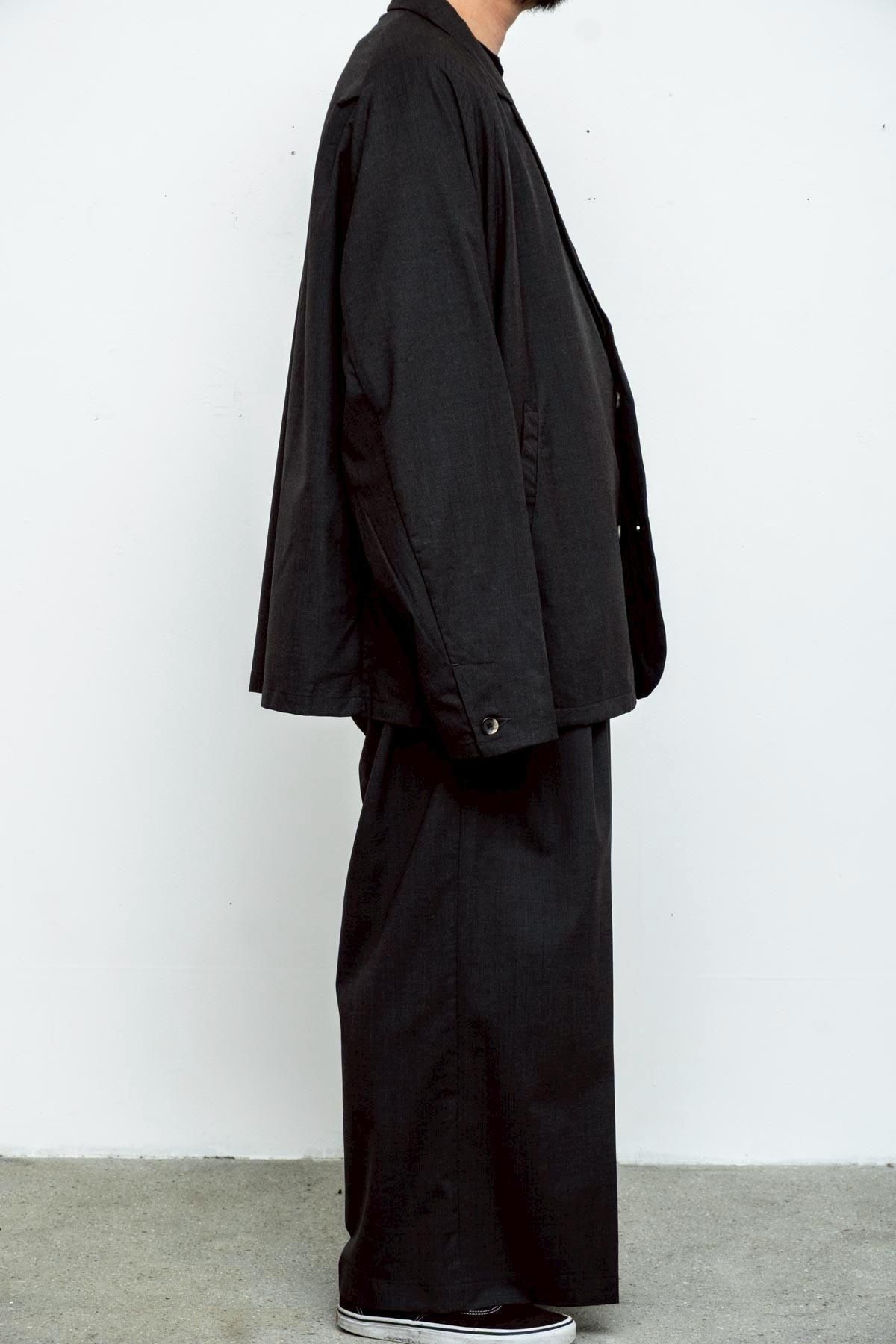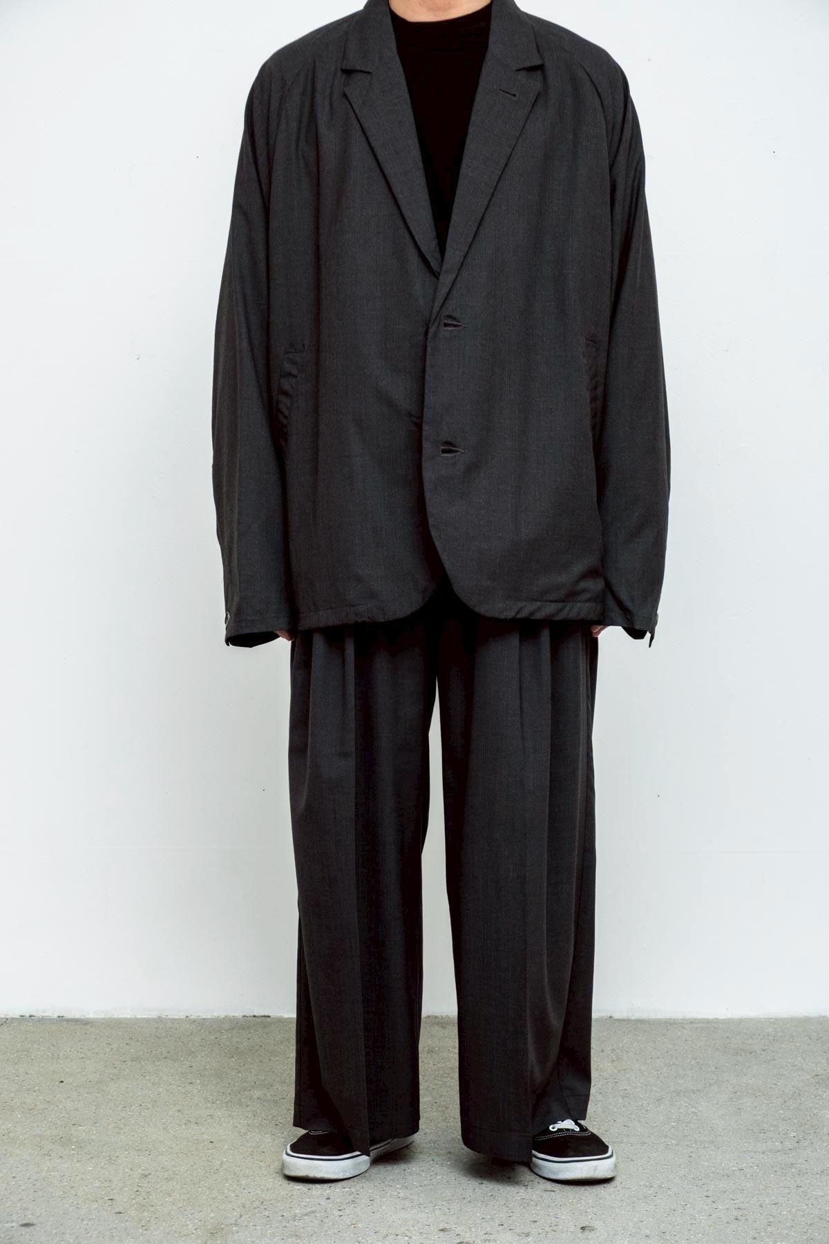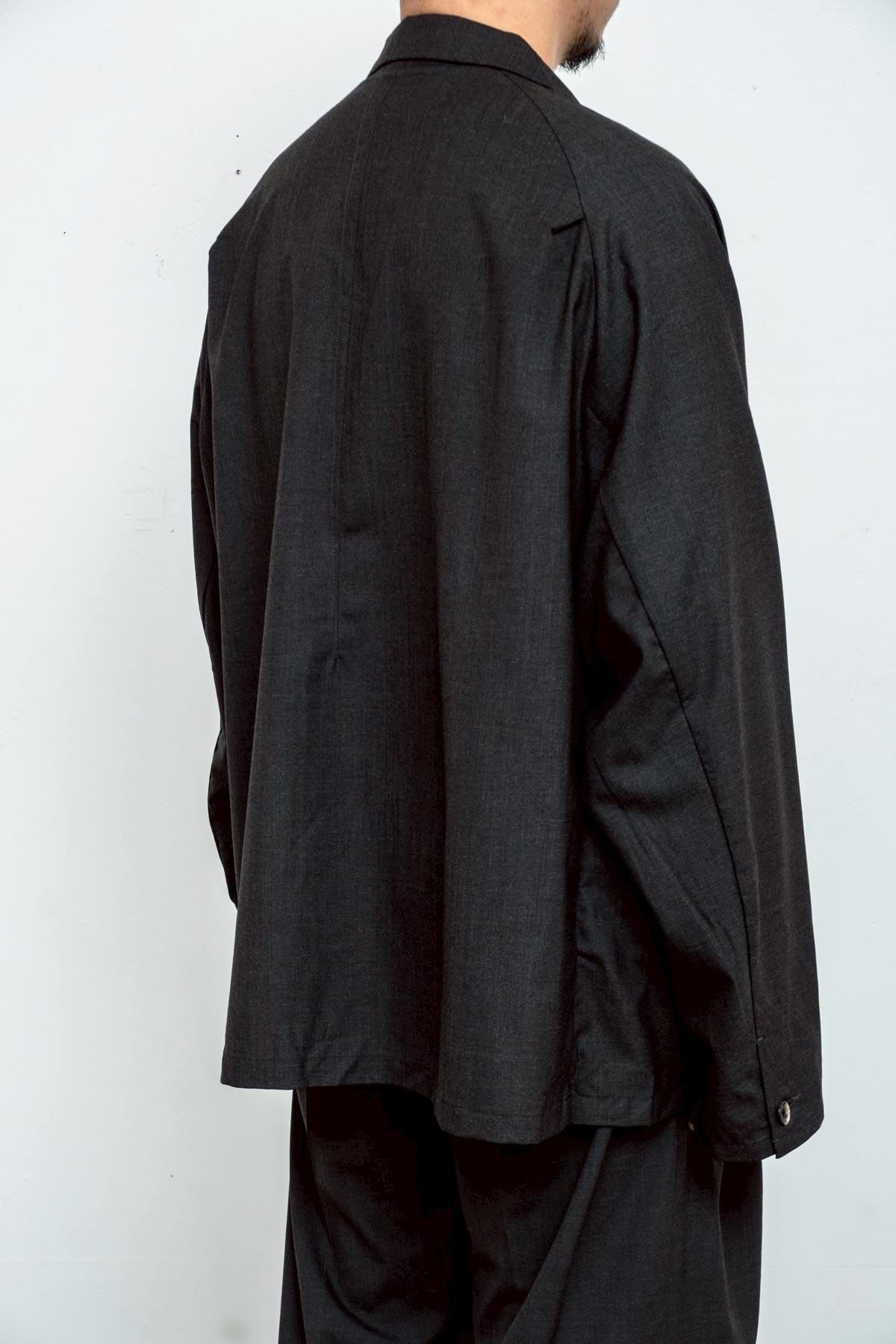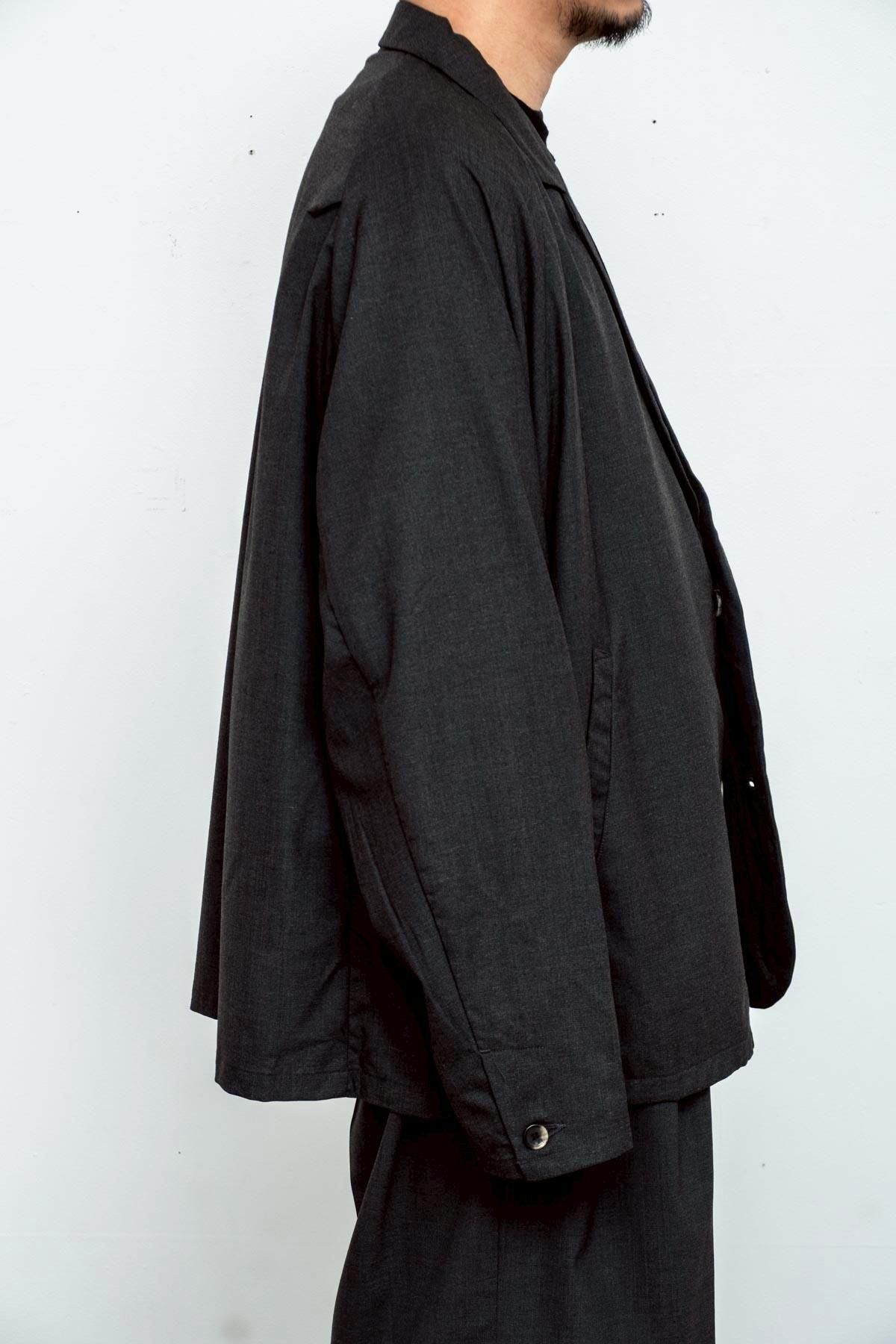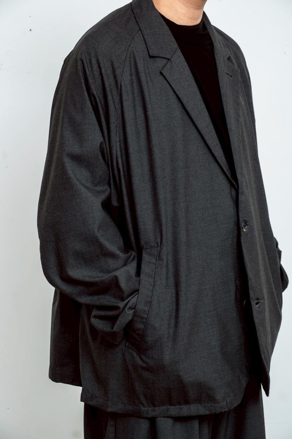 パラシュートボタンの2BJK。背中にダーツが入ったラグランは、ワイドなシルエットながらスッキリと見える仕様になっています。内側は全てパイピング仕様。ラペル裏両サイドに、携帯などを収納できるポケットがついています。また、上までボタンをとめるとブルゾンのようにも変化。セットアップでパンツの種類により表情を変えるので色々な組み合わせが楽しめます。