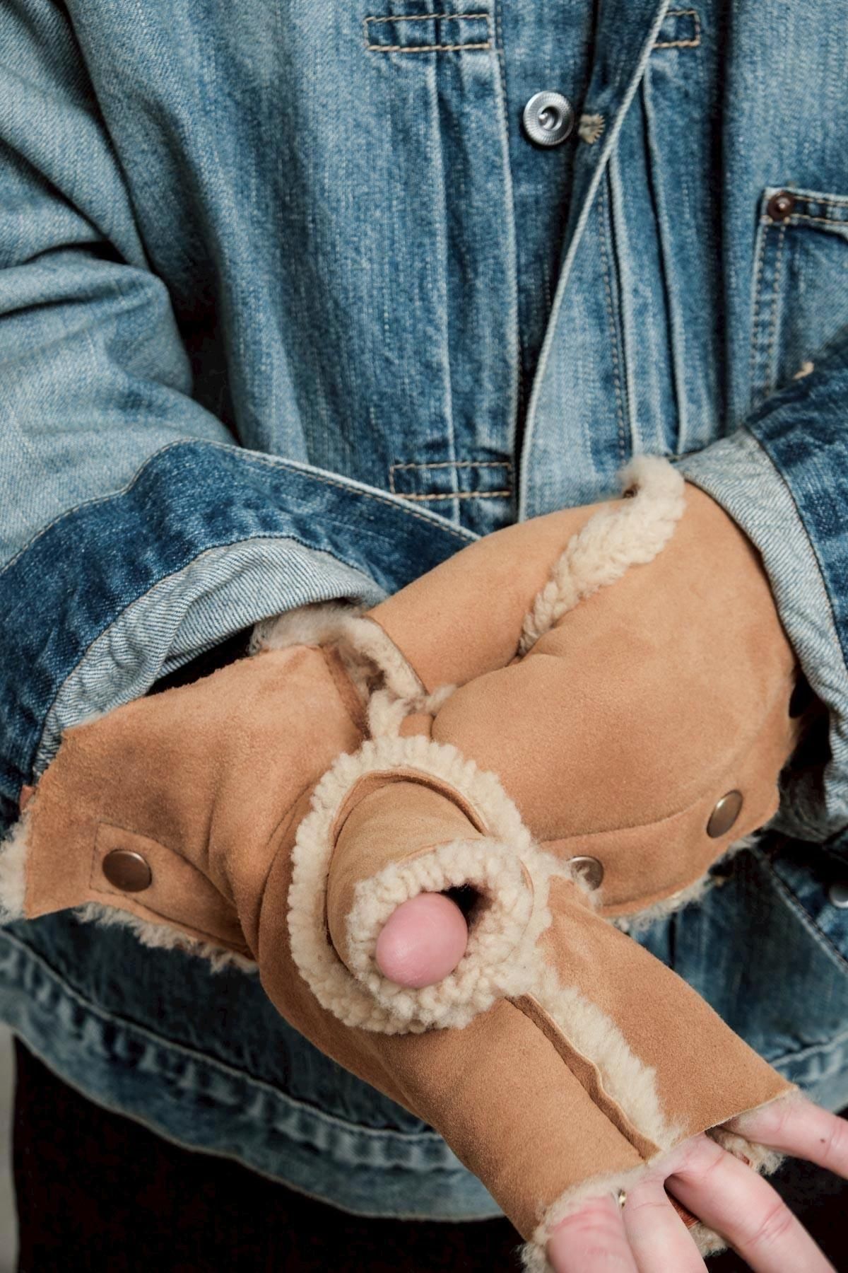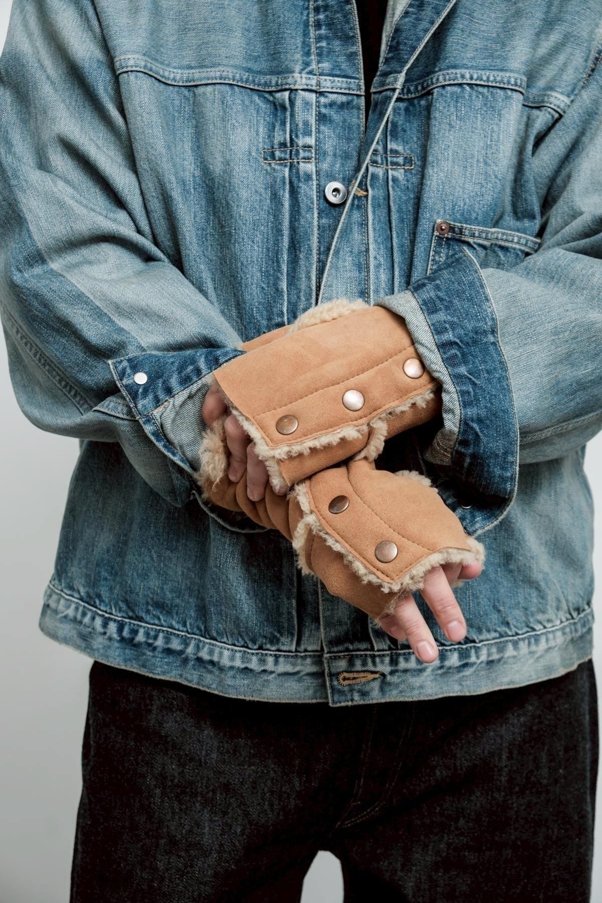 リバーシブルムートントラッカージャケット"LUKE"の前立てから着想し、デザイナーの橘氏がバイヤー時代に、カリフォルニアはヘイワードのウィップルロードにて入手したムートングローブをモチーフに製作。スマートフォンもそのまま使用できるよう指なし仕様、袖口は元々のムートンが持つナチュラルエッジをデザインとして落とし込んでおり、全く同じ物が存在しない完全なる一点物となります。ポイントとなるスナップボタンにエゾシカの革をあしらった、表と裏で全く表情が異なる両A面仕様です。